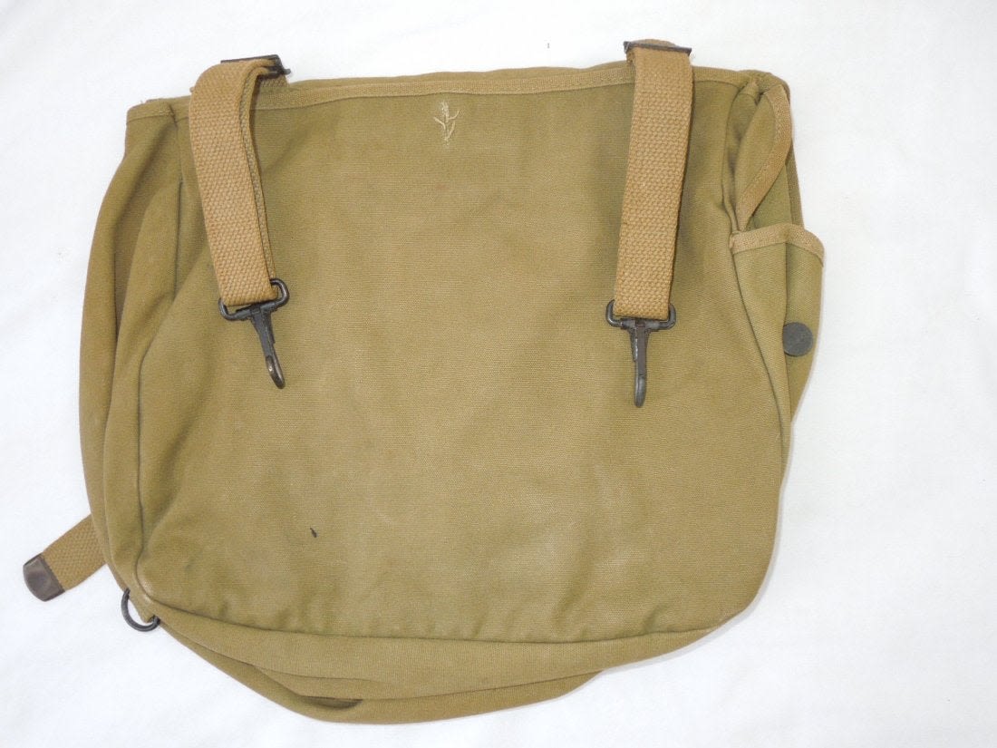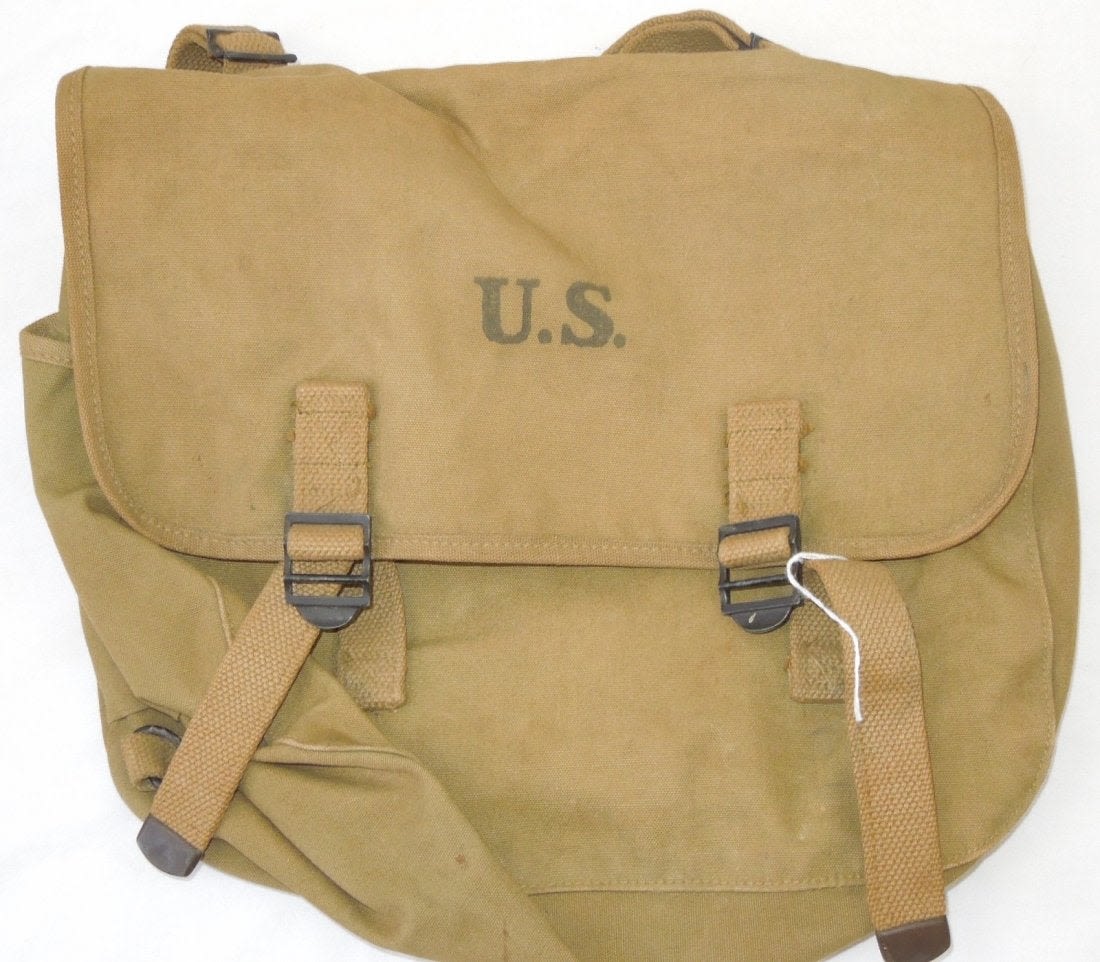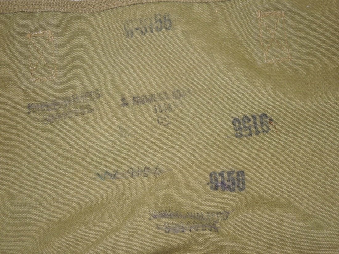 WWII 1943 US Musette Bag. Shoulder strap is inside the bag. Named to John R. Walters, with serial number. Maker is there but difficult to read. Condition is very good with wear for its age. (III B 16)