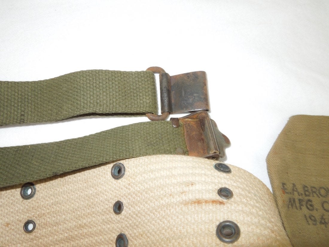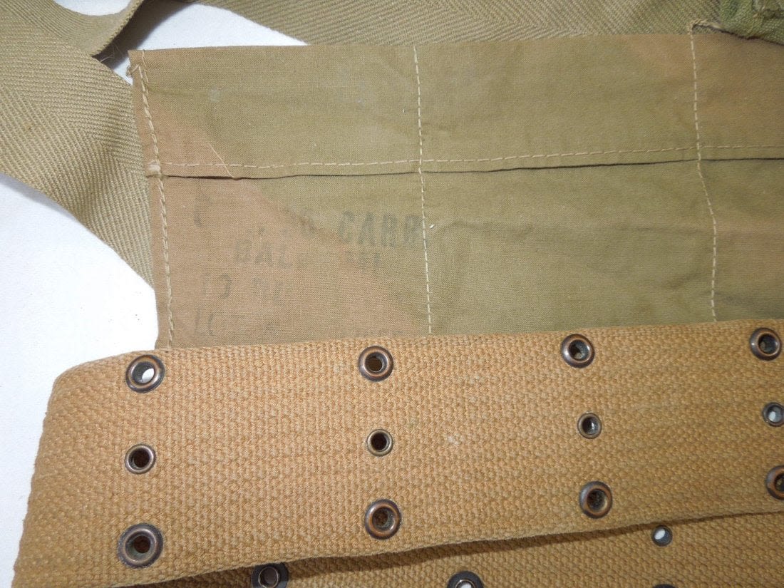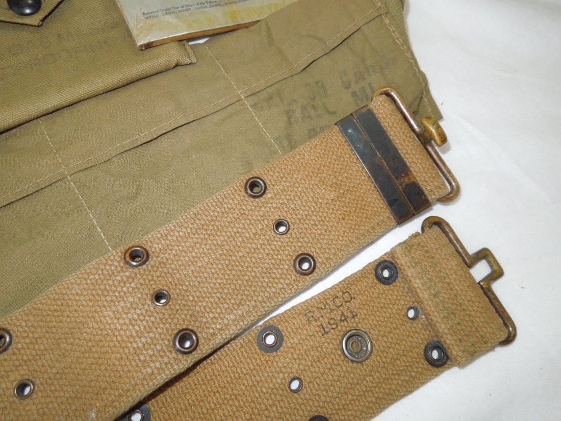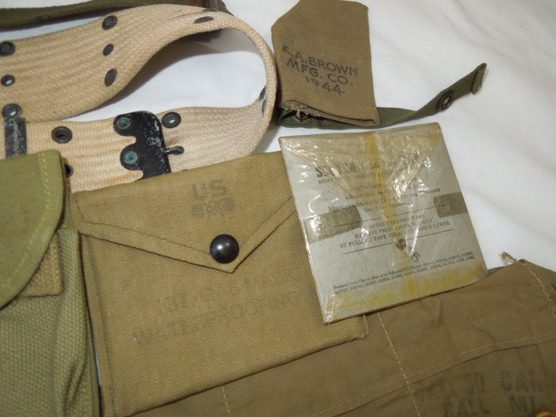WWI – WWII US Field Gear Ammo Pouches Belts Lot. You will receive the following 10 items. 1. US Gas Mask Waterproofing M1 Kit. Lot N-4-1812-1 Marker: CMC. Still in its original wrapper. 2. US Dark Tan 1941 Pistol Belt. Maker is R.M. CO. Condition is nice for its age. 3. US 1942 First Aid Pouch and Bandage. Maker on pouch is R. M. T. CO. The bandage is a small First Aid Dressing. Nice condition and unused. 4. Light Tan Pistol Belt. Possibly WWI. No Maker mark. Used and worn with signs of rust condition. 5. US 1944 Green Muzzle Cover. Maker is J.A. Shoe. Nice condition. 6. US 1944 Muzzle Cover. Olive Drab. Maker is E.A. Brown MFG. CO. Rust spots on one side. 7. US 1943 M1 Carbine 15 Round Pouch Clip. Maker: Hamlin Canvas Goods CO. Excellent condition. 8. US 1943 M1 Carbine 15 Round Pouch Clip. Maker: Appleton Awning Shop. Excellent condition. 9. US Garand Sling. Stamped but difficult to read. Good Condition. 10. US M1 Carbine Bandolier (10 Round Clip). (III B 46, 35, 47, 48, 8, 19, 40, 30, 24, 7)