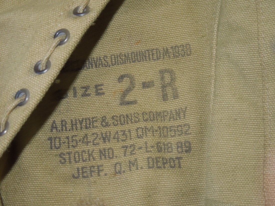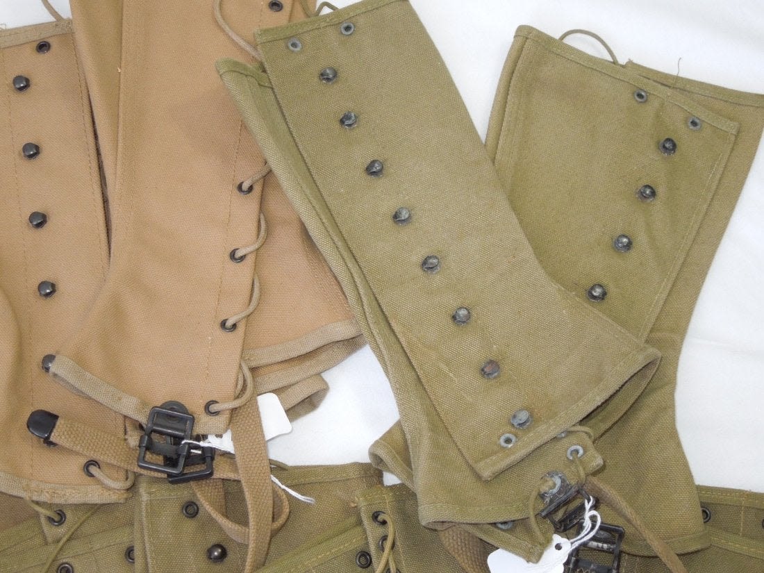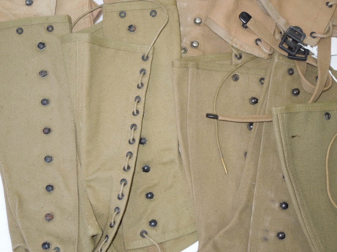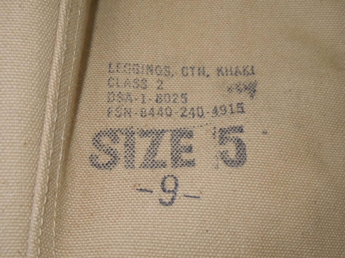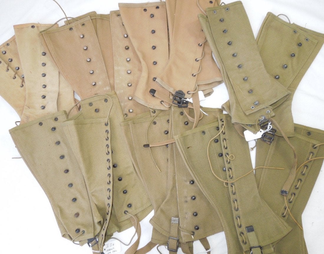 7 Pairs of WWII US Military Leggings. You will receive the following leggings. 1. Khaki Leggings. Size 5. 2. 1942 Legging, Size is 2R. A.R. Hyde & Sons Company 3. 1941 Canvas Leggings. Size is 2R. 4. 1942 Leggings. Size is 2R. Maker is Hillsdale MFG. CO. 5. 1941 Leggins. Size is 2R. Owens Shoe Company 6. 1943 Leggins. Size 5. Dianna Legging Corp. 7. Tan Size 2R. Gory & Read Co.