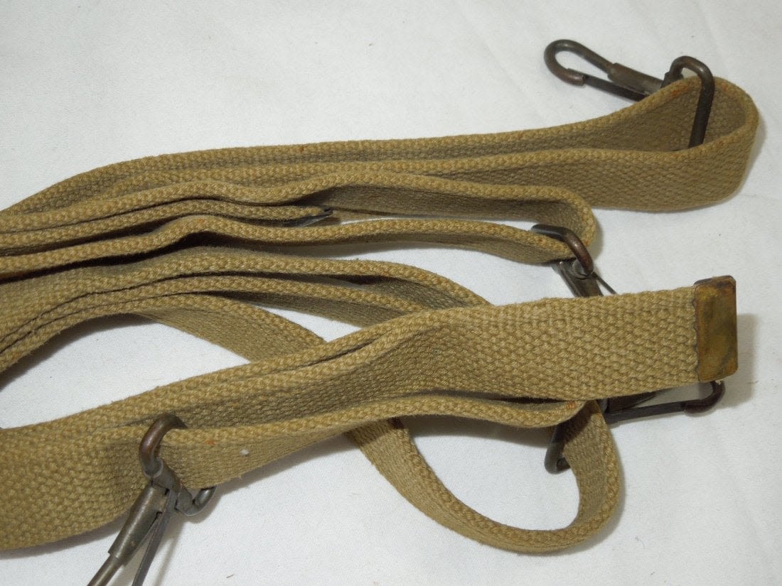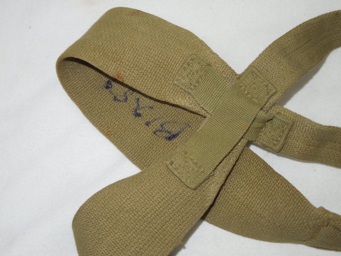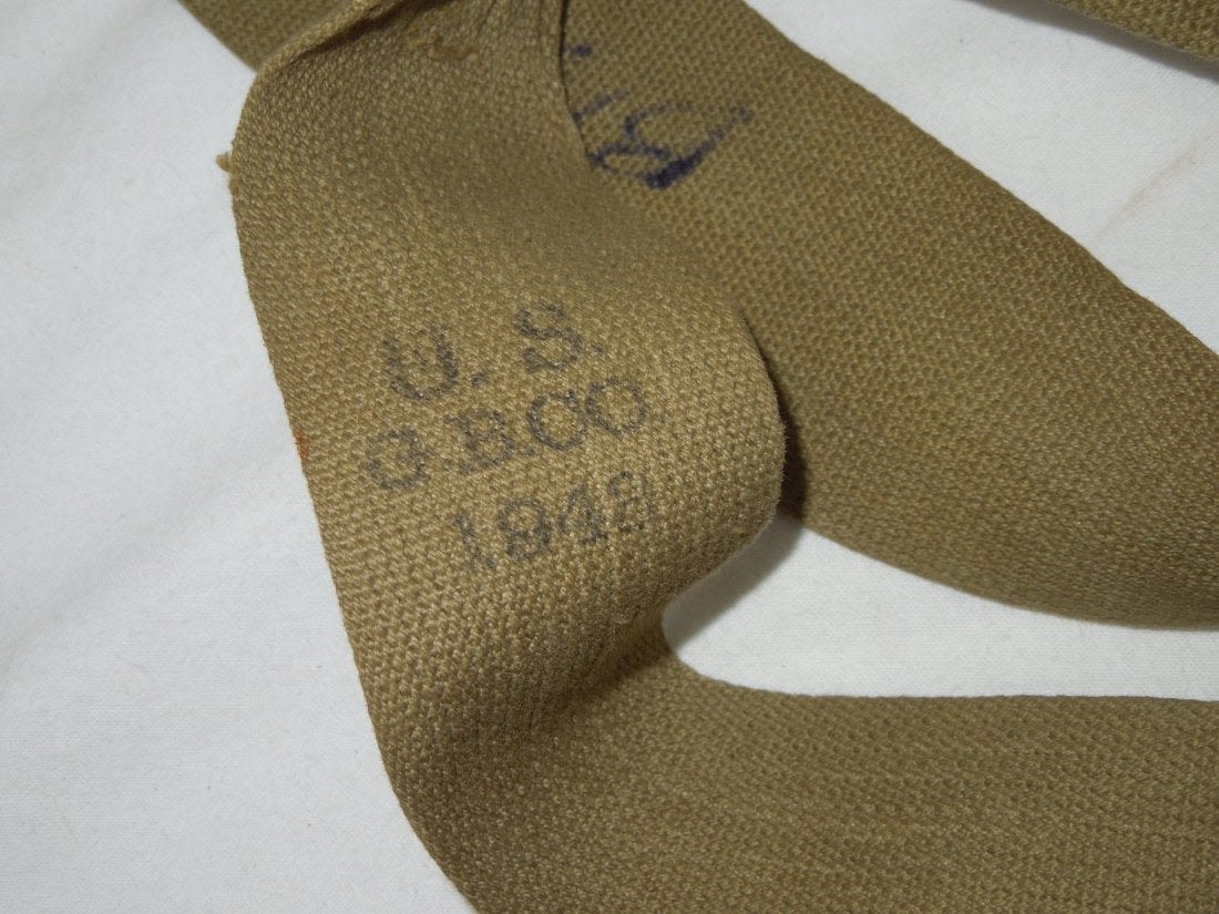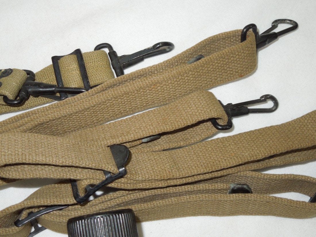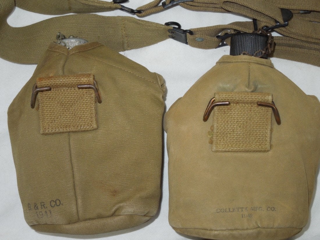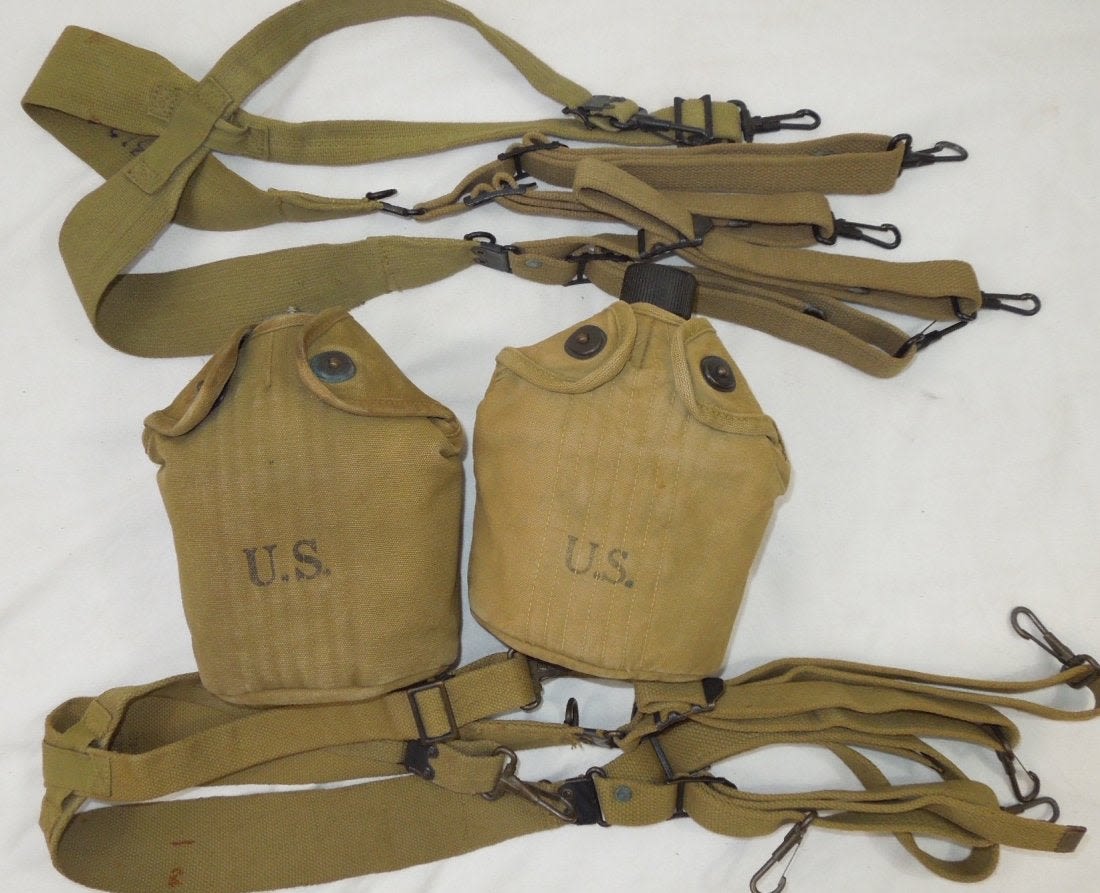 WWII US Military Canteens and Field Gear Suspenders / Combat Harness Lot of 2 canteens and 2 pairs of suspenders / Combat Harness. You will receive the following items. 1. US 1941 G. & R. CO. (marked on canvas cover) Canteen. Dented and used condition. 2. 1943 US S. M. CO. Canteen and cup. The cover is marked Colletts MFG. CO. 1945. Excellent condition. 3. Harness / Suspenders marked US G.B. CO. 1943. Nice condition. 4. 1943 Hoosier & ? CO. Suspenders / Harness. Nice condition for its age. (III B 39, 27, 28, 37)