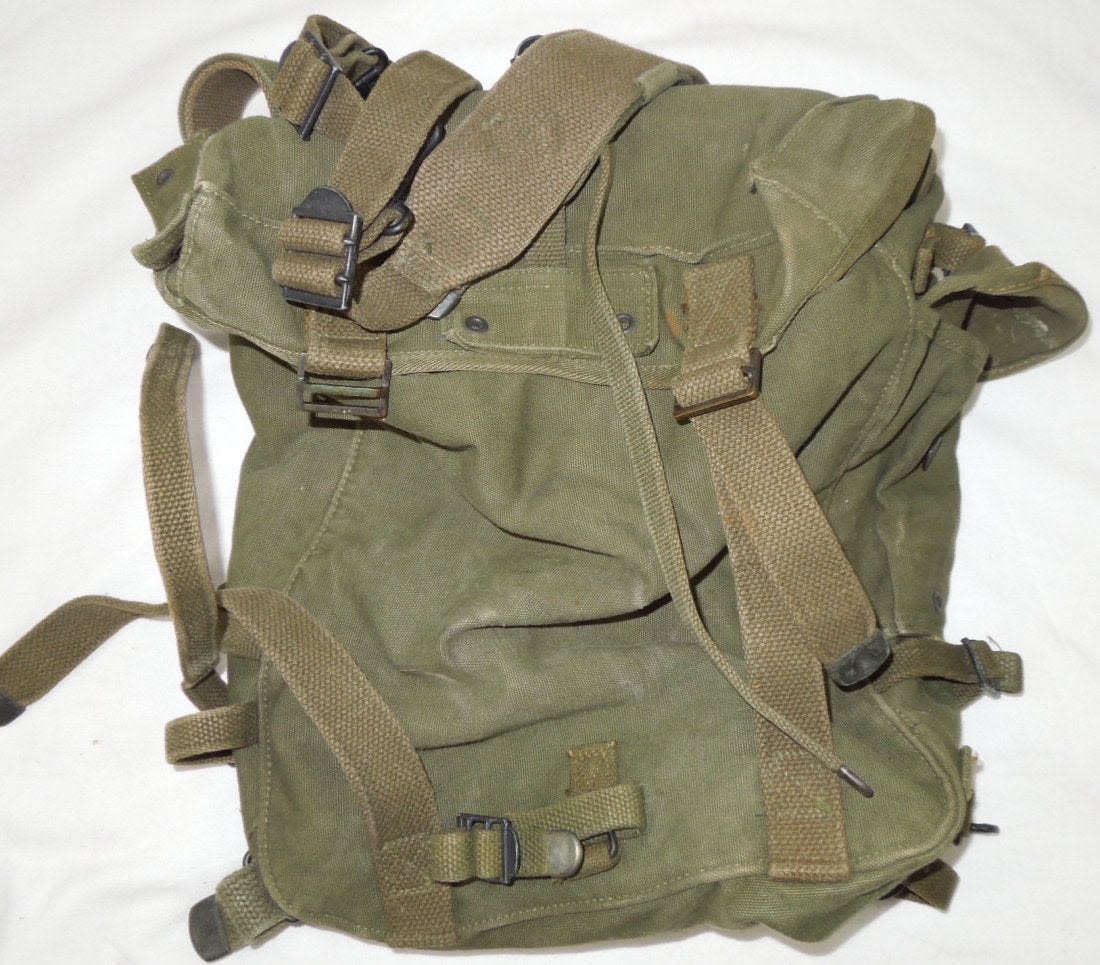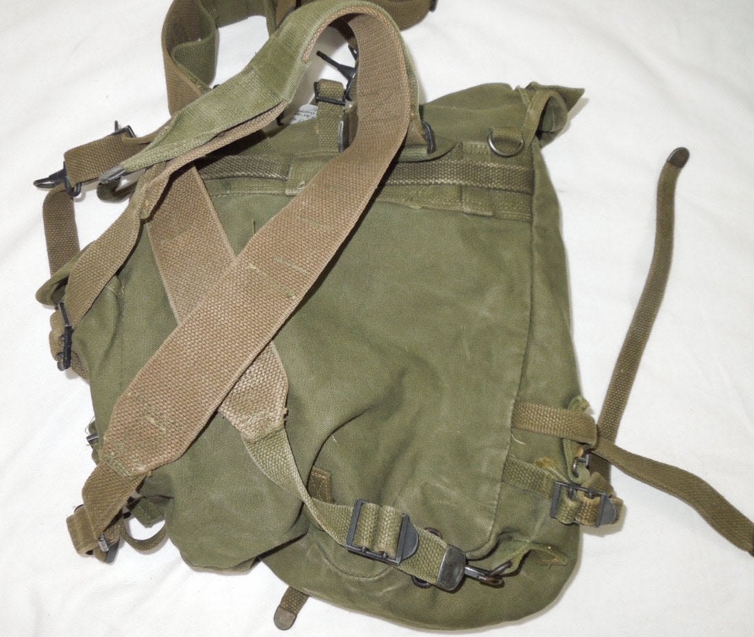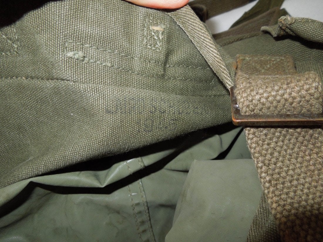 WWII US Army 1945 M45 Compact Field Pack. Rubberized inside. Olive Drab. Good used condition. (III B 45)