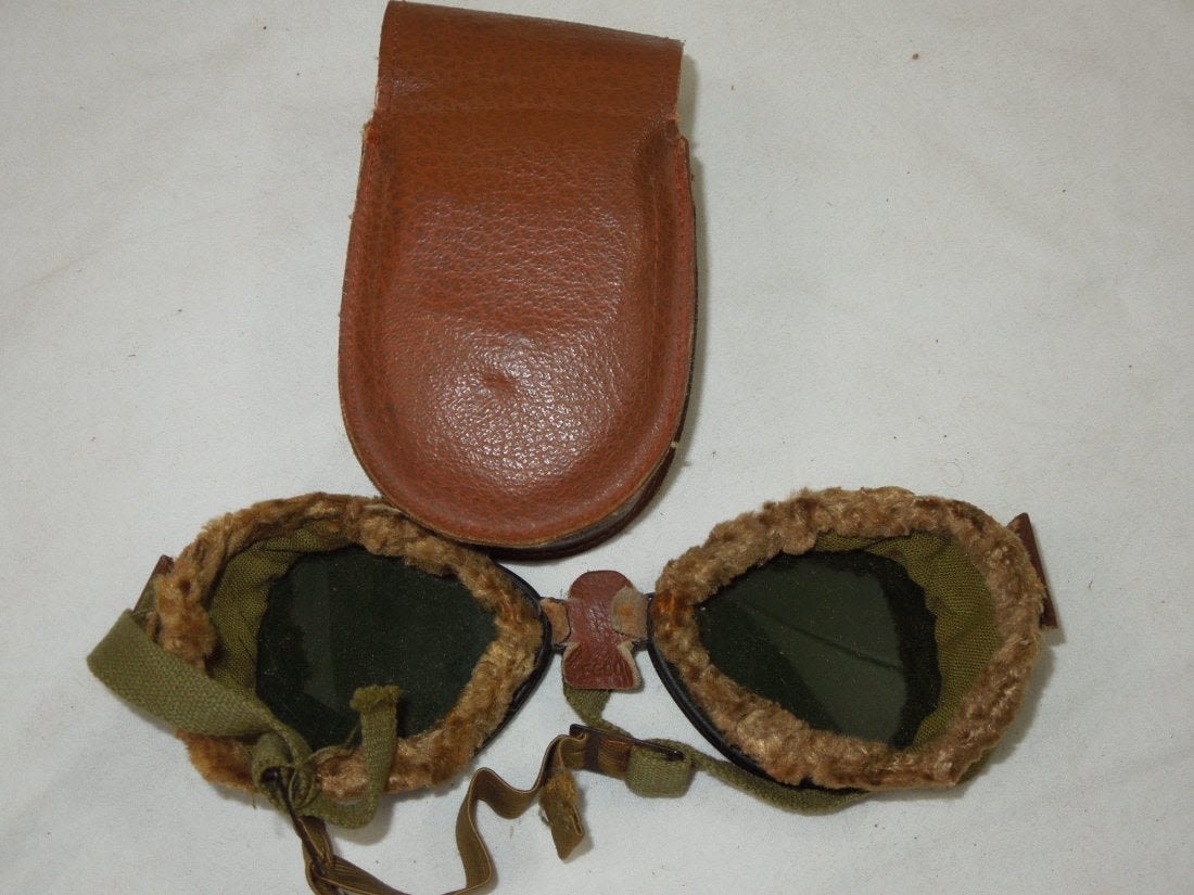 World War II mountain goggles and leather case. This is a pair of goggles that were issued to Army men. The pouch is made of leather with cracks and has a one snap closure that is felt lined. It has 2 hidden pockets for extra green lenses, that are included. The goggles have lenses that are placed inside the goggles and under the glass outer lens. The frame unscrews to change the colored part of the lens. The goggles have an adjustable leather loop over the bridge of the nose and have the letters FGCO. FGCO stands for Foster Grant Co. The structure of the goggles are a green canvas with fur trim. Nice condition for its age. (III B 46)