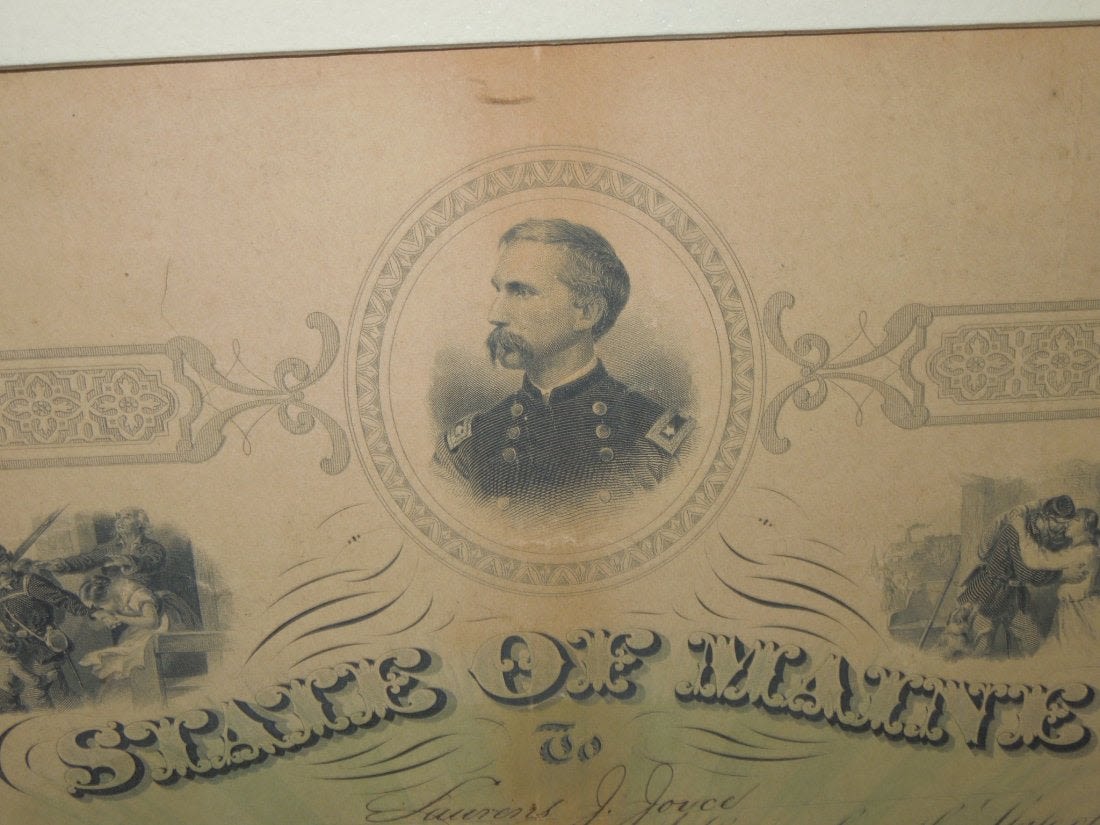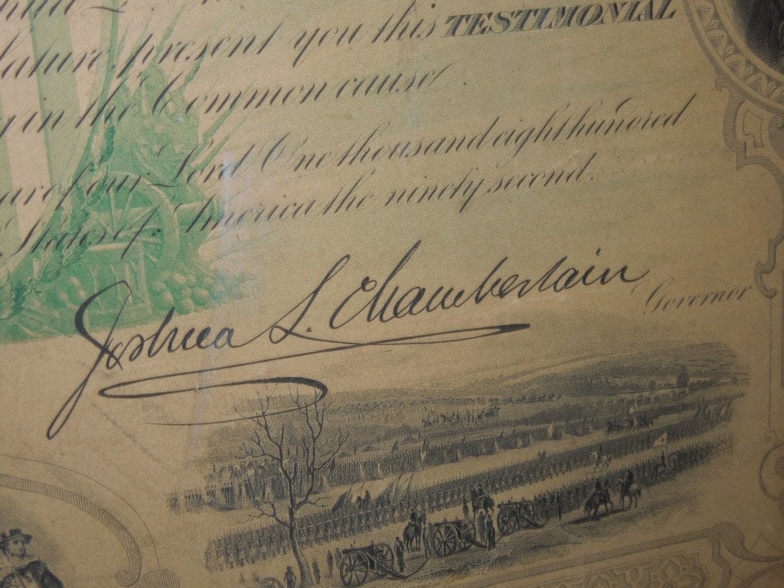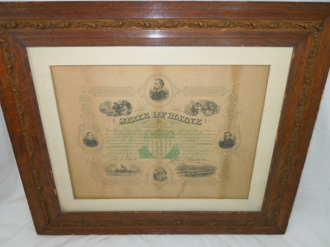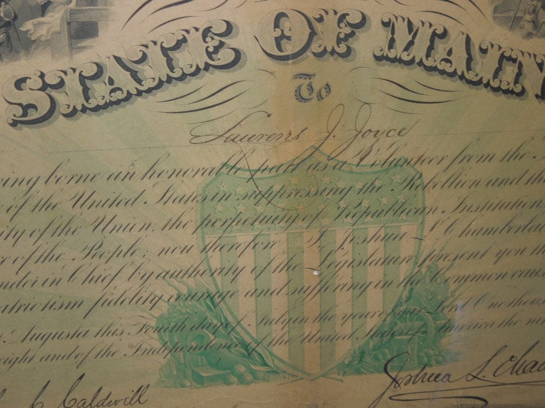 Original wood framed (no glass) certificate dated 1868 acknowledging the service of Capt. Laurens J. Joyce, Commanding Officer of Co. F., 15th Maine Infantry during the Civil War. The lower left is signed by the Maine Adjutant General and right is original hand signed by Governor and Major General Joshua Chamberlain. He was the Medal of Honor recipient from the Battle of Gettysburg made famous in popular culture in the movie Gettysburg as played by Jeff Daniels. Total measurements are 25.5 inches x 21.5 inches.