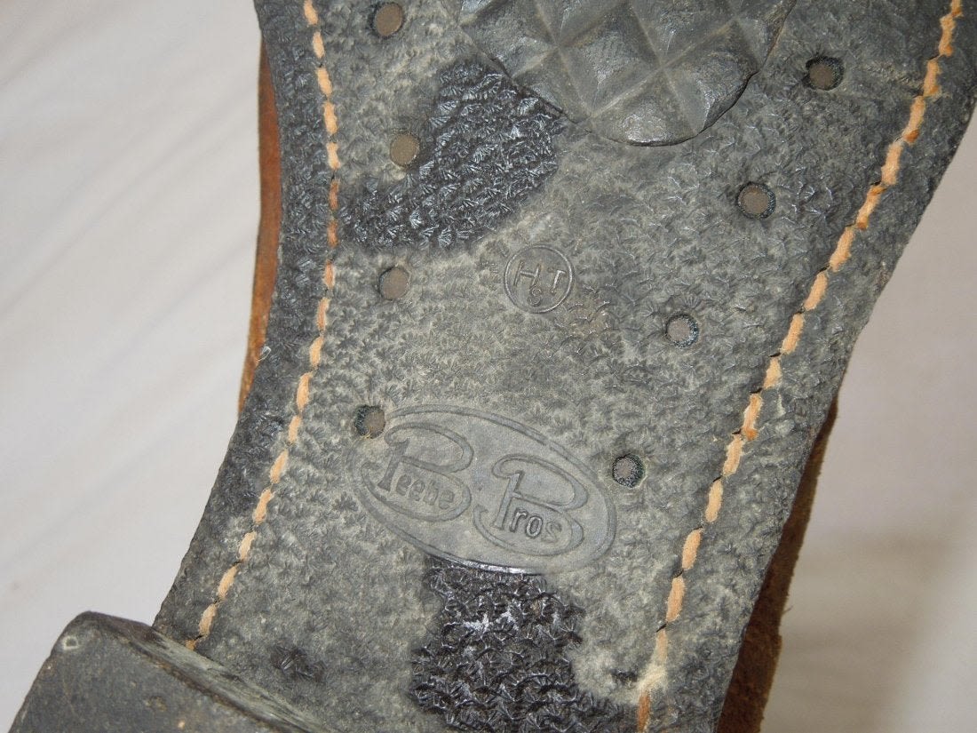 US Army Combat Boots with 2 buckles attached. Brown leather boots Marked on bottom of boots Beebe Bros. Used condition. The left boot is missing part of the leather at the top. The right boot on one of the buckles is missing an attachment. No size seen, but size 9 is written on the tag that came with these boots.