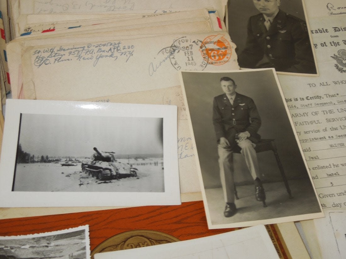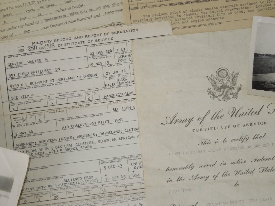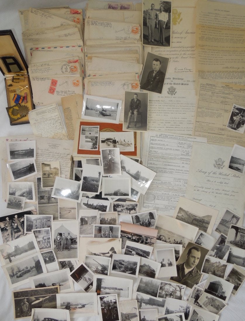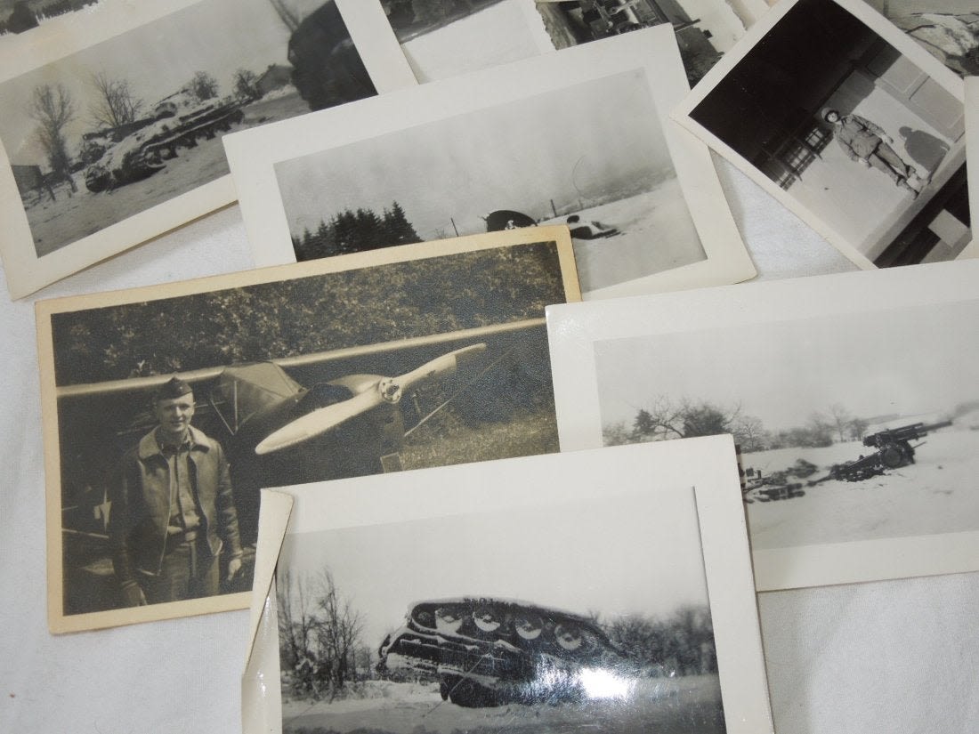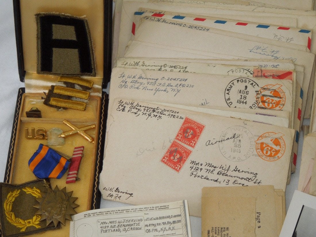 Large group from Liaison Pilot 1st Lt. Walter H. Gerving of the 951st Field Artillery Battalion of the First Army in Europe WWII. He flew artillery spotting missions. This archive includes his self-censored letters, Air medal (not engraved), misc. insignia, certificates and discharge documents, as well as numerous good quality original photos of planes, damaged German tanks, Soldiers, weapons, battle damage, etc.