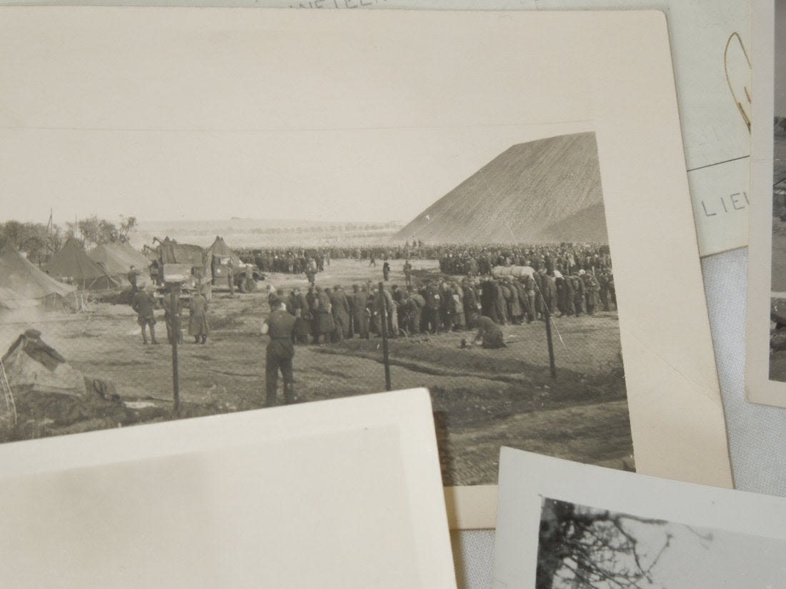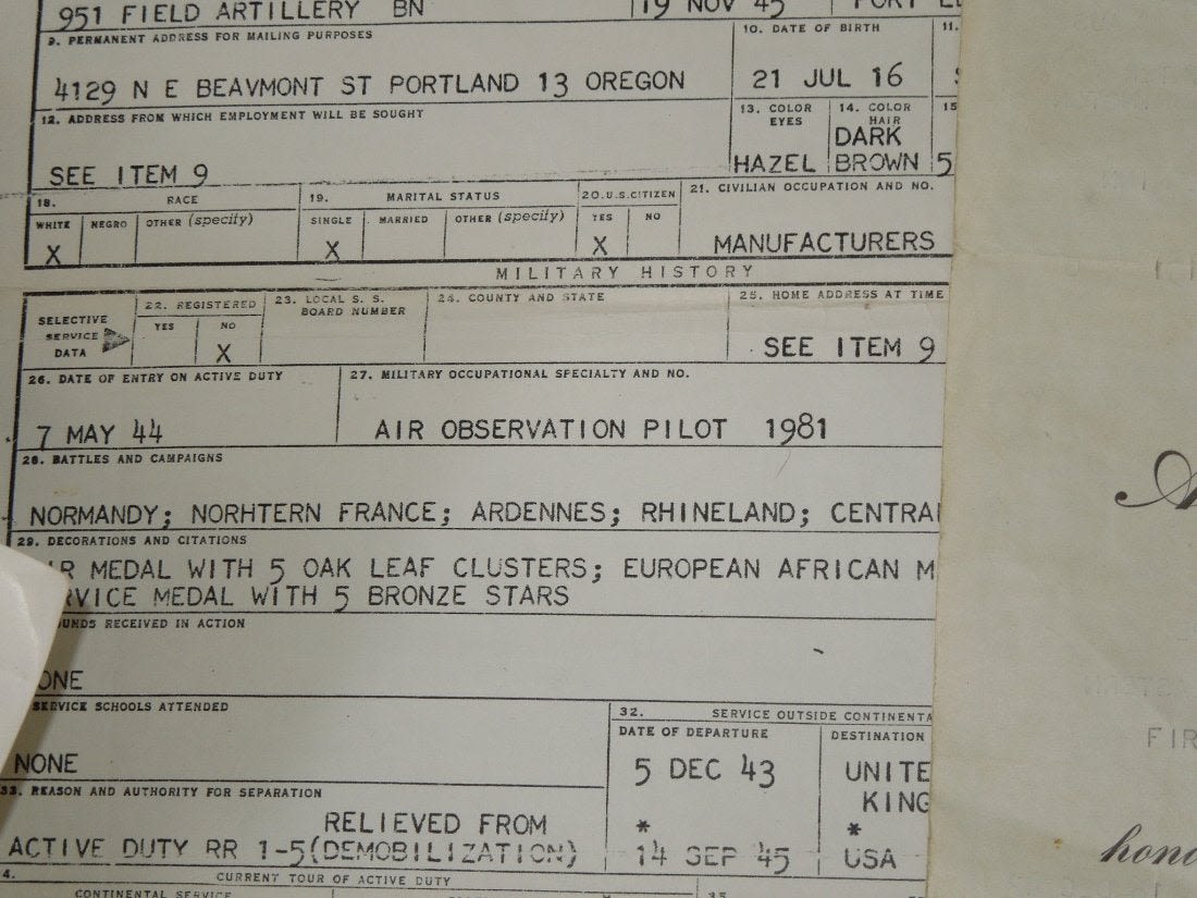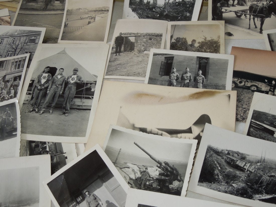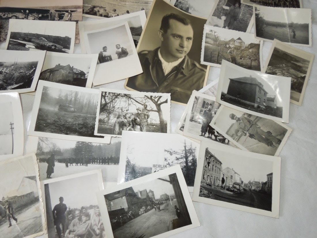 Large group from Liaison Pilot 1st Lt. Walter H. Gerving of the 951st Field Artillery Battalion of the First Army in Europe WWII. He flew artillery spotting missions. This archive includes his self-censored letters, Air medal (not engraved), misc. insignia, certificates and discharge documents, as well as numerous good quality original photos of planes, damaged German tanks, Soldiers, weapons, battle damage, etc.