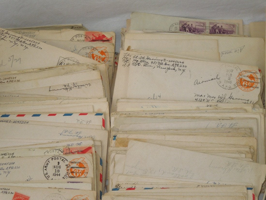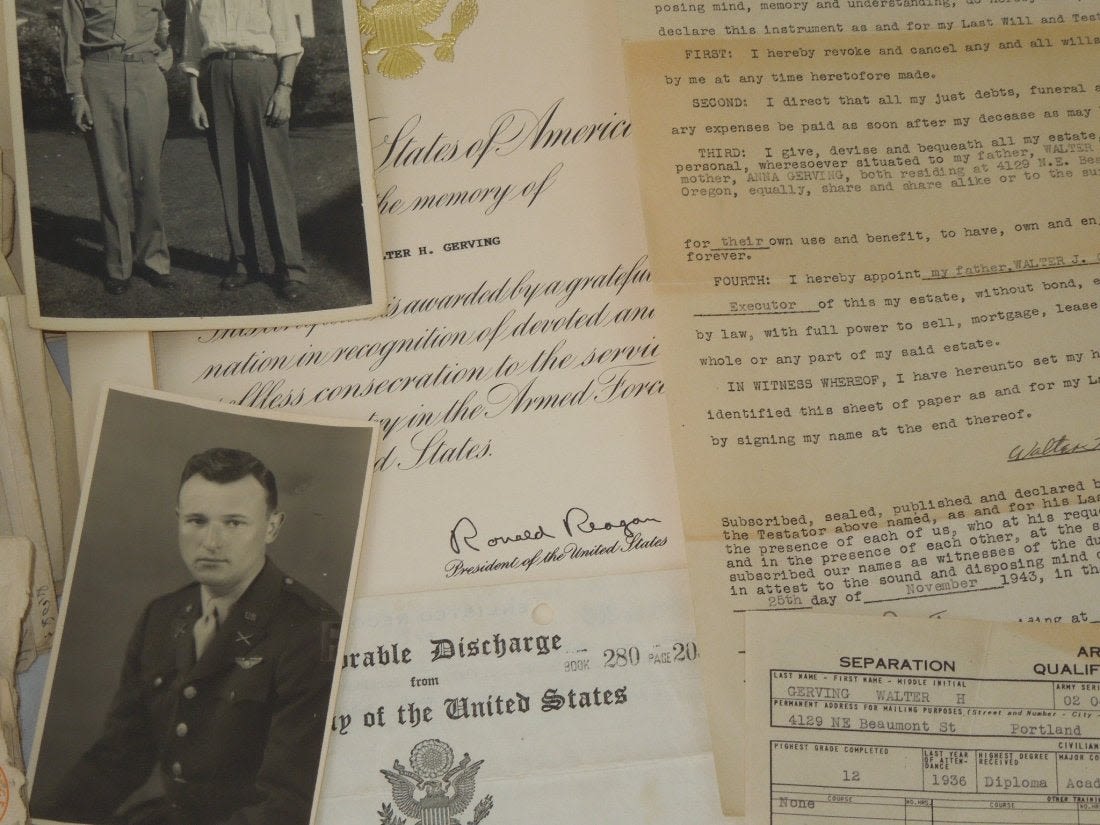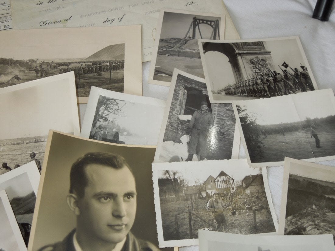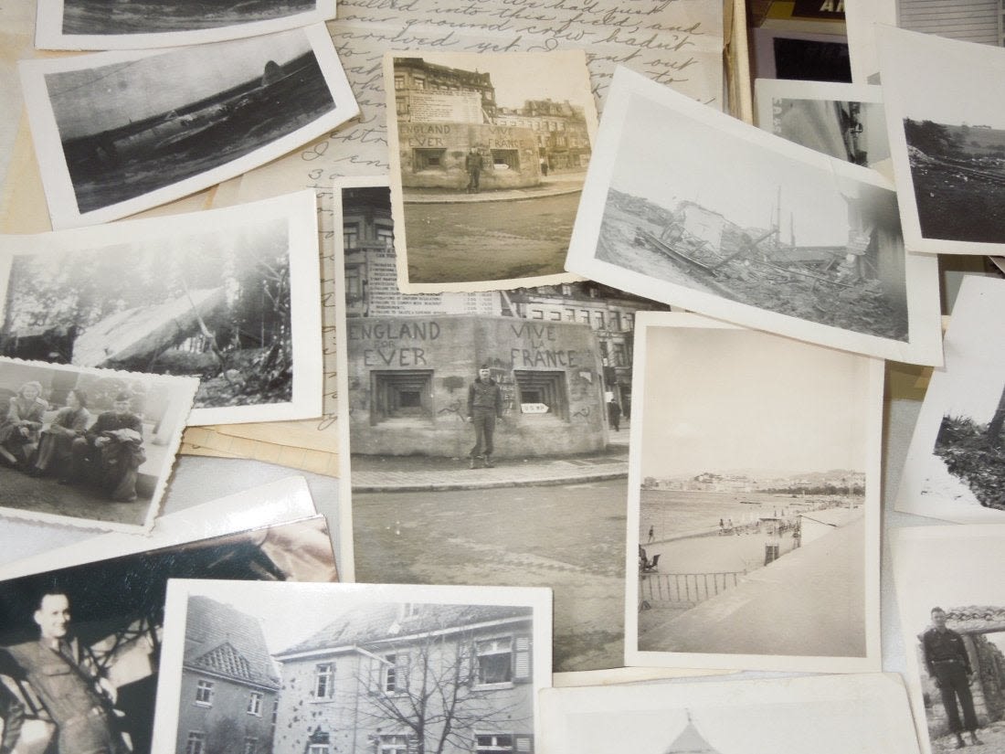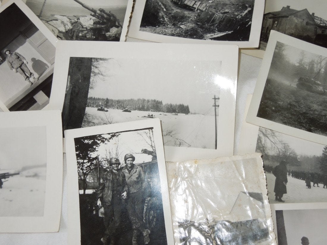 Large group from Liaison Pilot 1st Lt. Walter H. Gerving of the 951st Field Artillery Battalion of the First Army in Europe WWII. He flew artillery spotting missions. This archive includes his self-censored letters, Air medal (not engraved), misc. insignia, certificates and discharge documents, as well as numerous good quality original photos of planes, damaged German tanks, Soldiers, weapons, battle damage, etc.