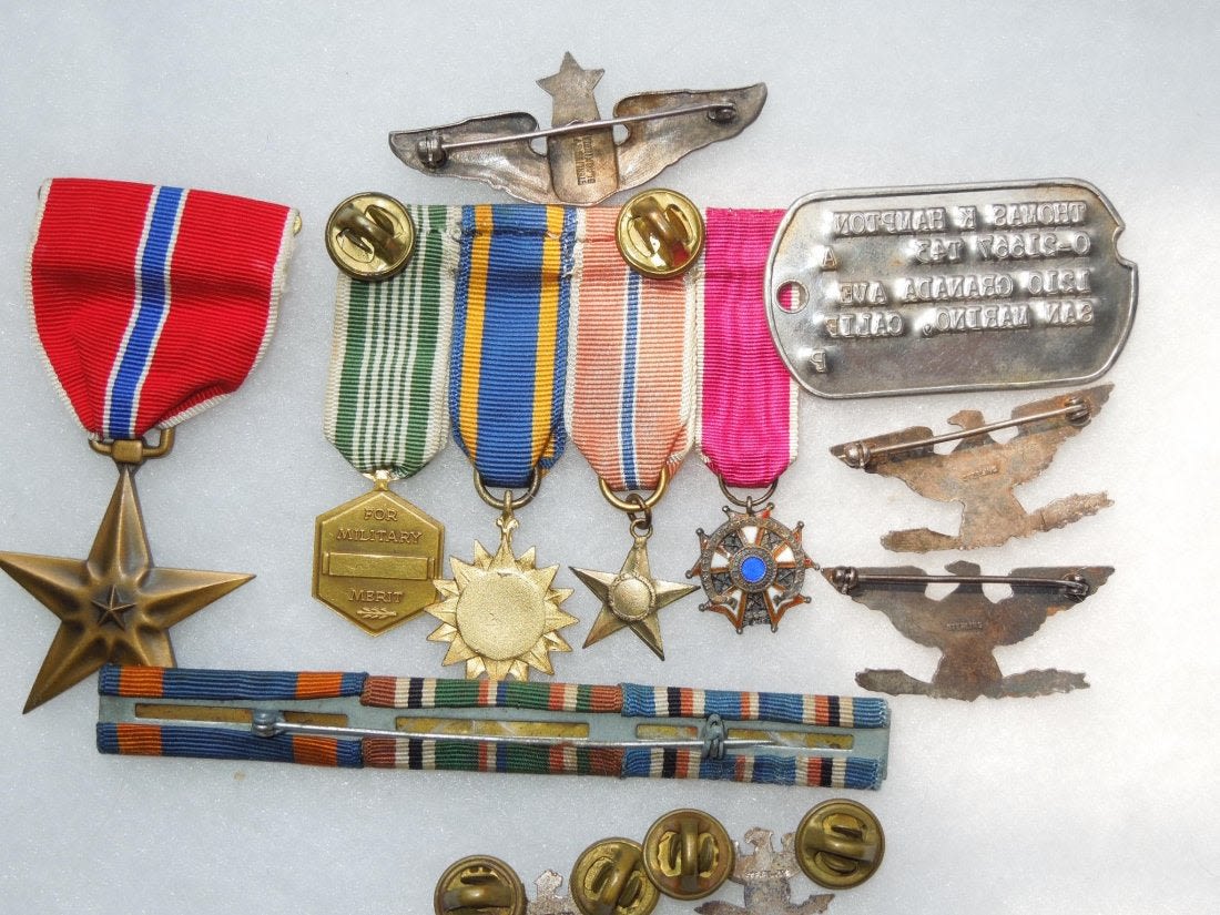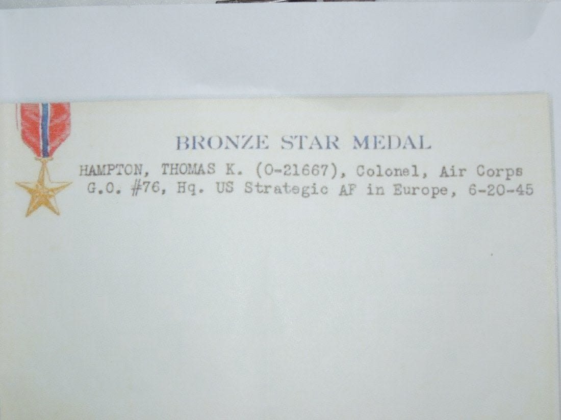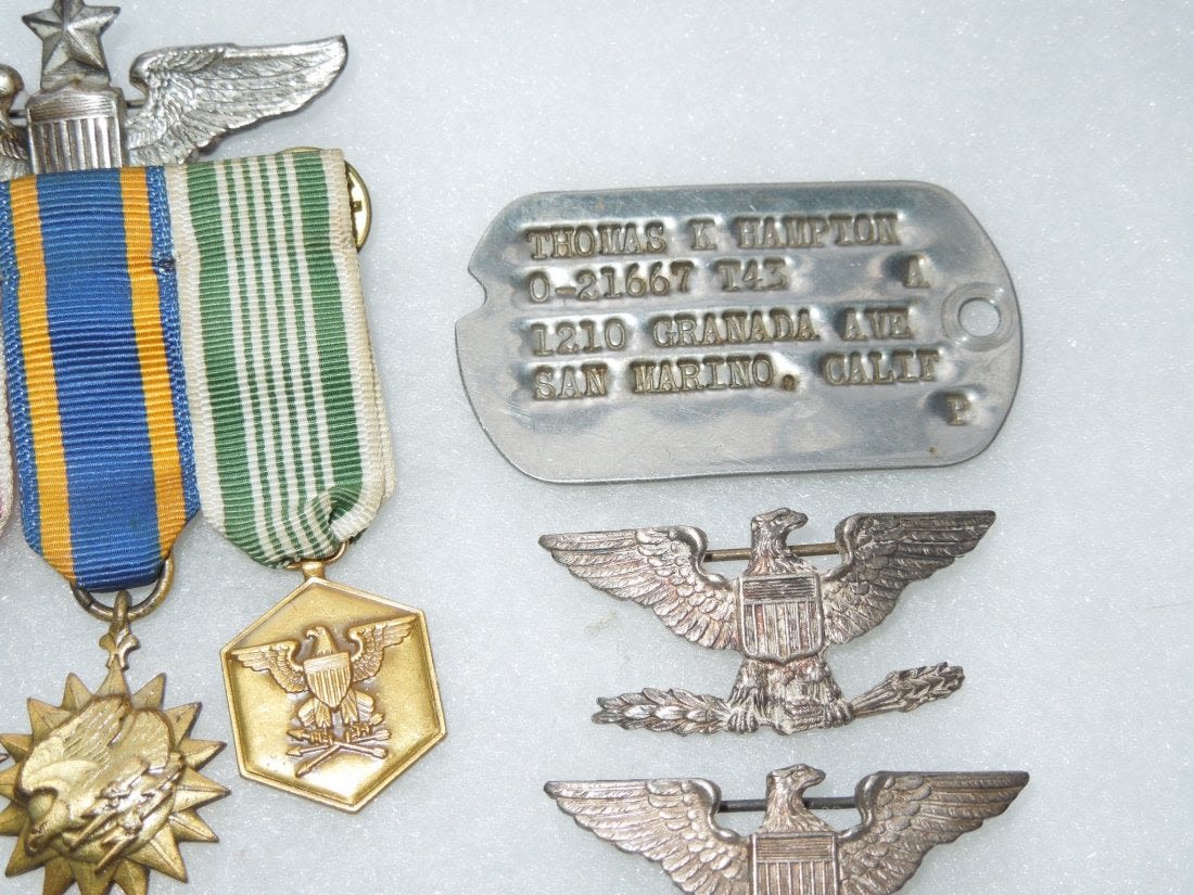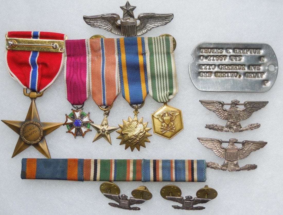 Group it items from Col. Thomas K. Hampton who served in 8th Air Force in the European Theater of Operations (ETO) after his stint with the 6th Air Force where he made Lt Col and was placed in command of the Liaison pilots fighting with the Russians on the eastern front. The lot includes his 2 inch Blackinton Sterling senior pilot wings, full and shirt sized sets of sterling Colonel rank, his period hand engraved Bronze star, Next of Kin Dog Tag, ribbon bar, mini medals, and copy of his bronze star card.