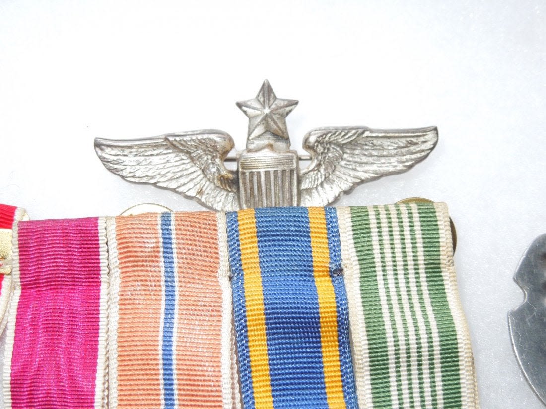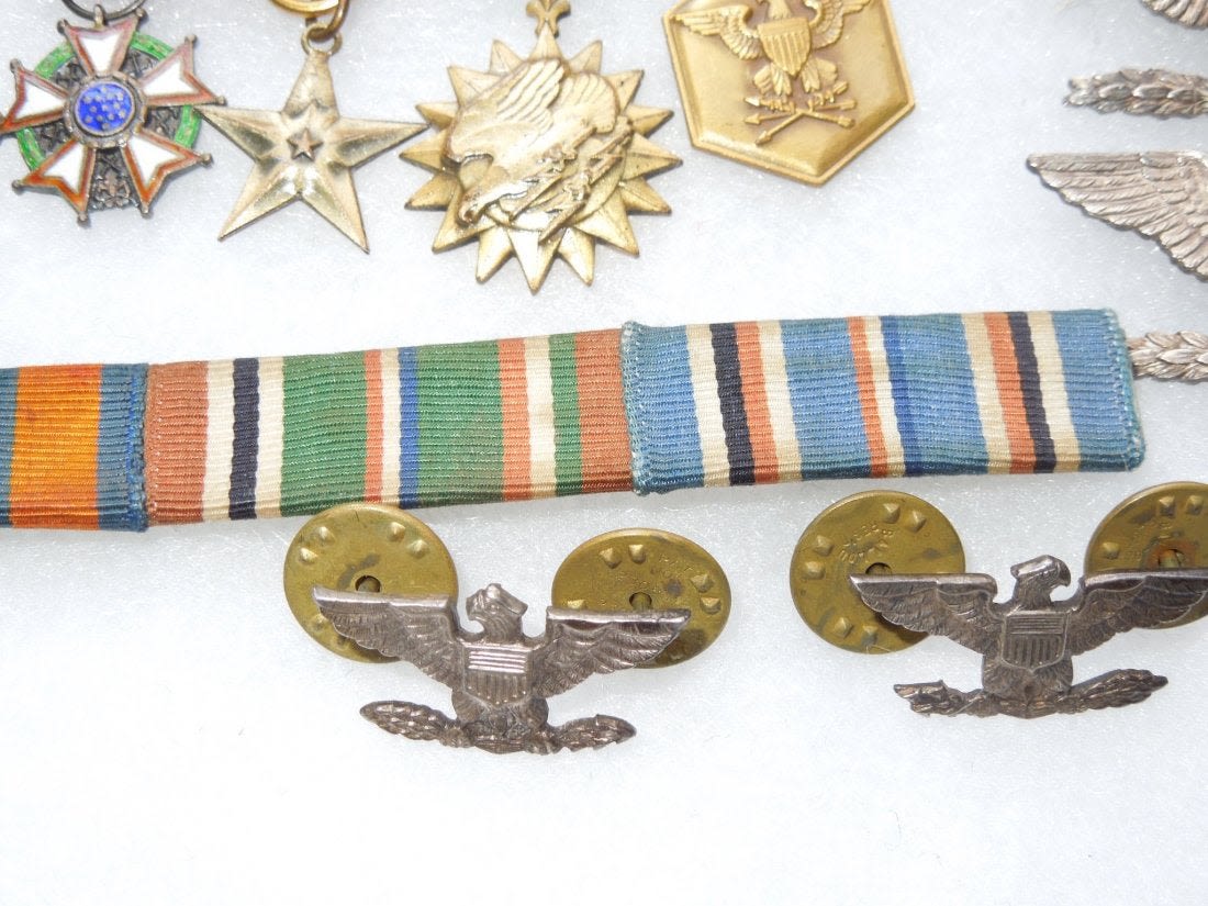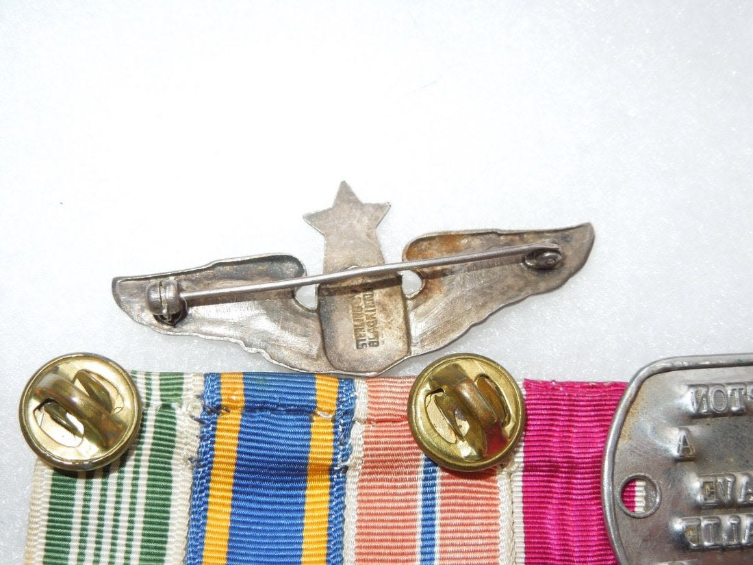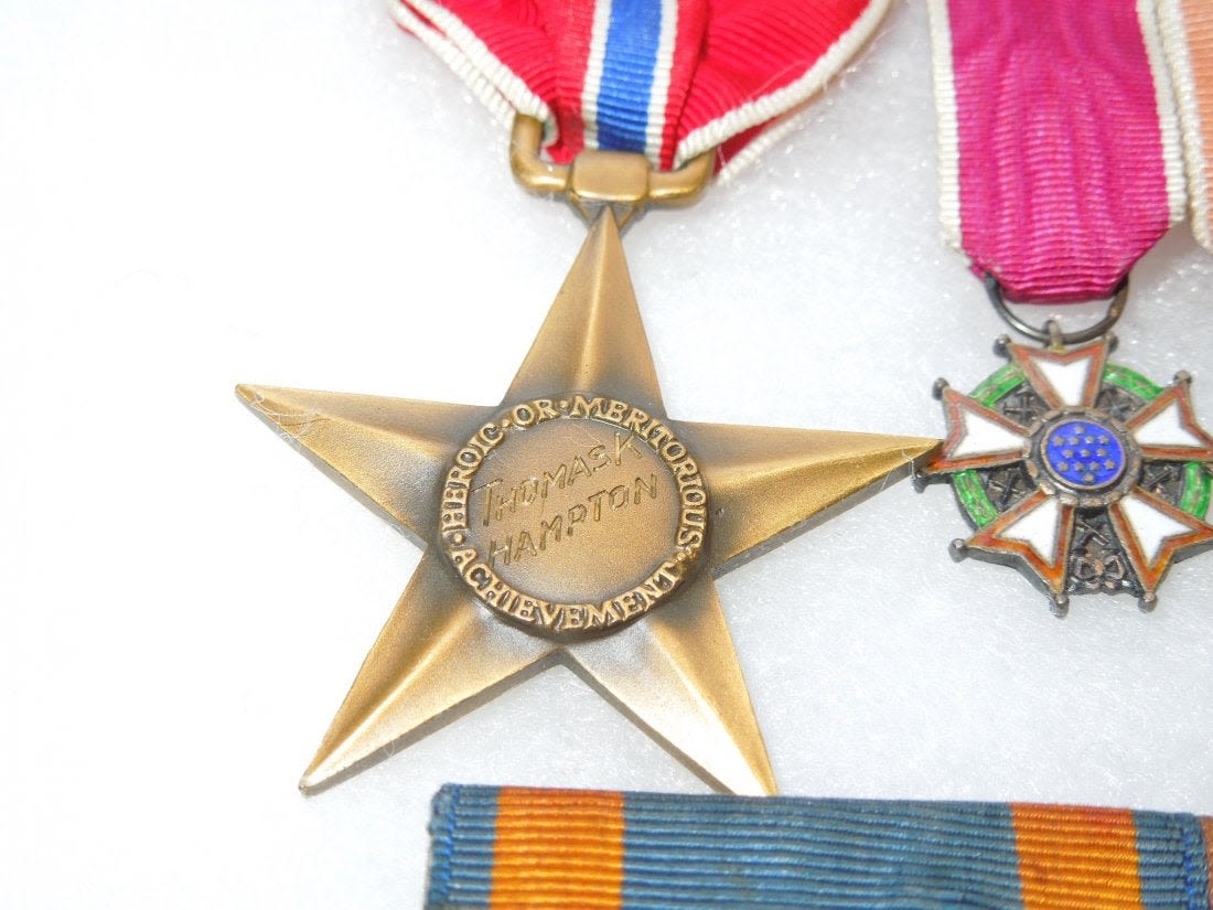 Group it items from Col. Thomas K. Hampton who served in 8th Air Force in the European Theater of Operations (ETO) after his stint with the 6th Air Force where he made Lt Col and was placed in command of the Liaison pilots fighting with the Russians on the eastern front. The lot includes his 2 inch Blackinton Sterling senior pilot wings, full and shirt sized sets of sterling Colonel rank, his period hand engraved Bronze star, Next of Kin Dog Tag, ribbon bar, mini medals, and copy of his bronze star card.
