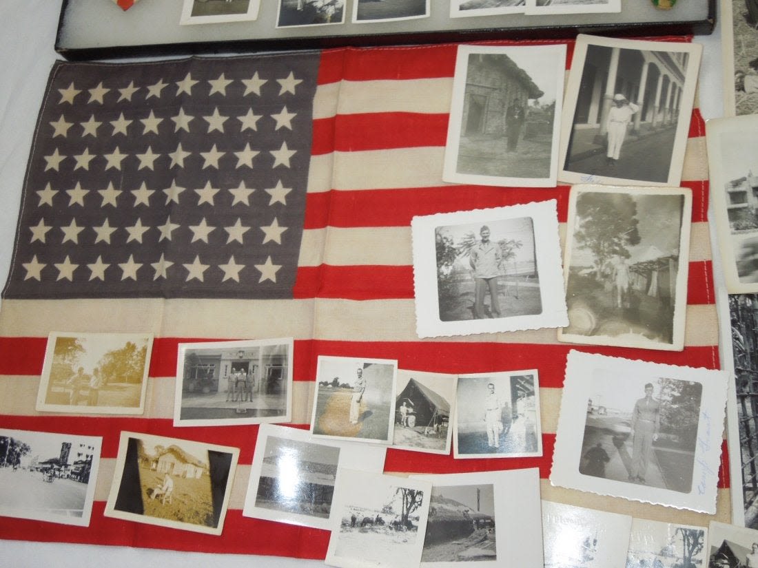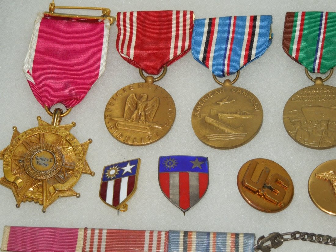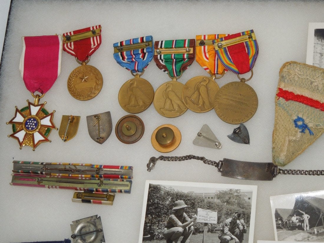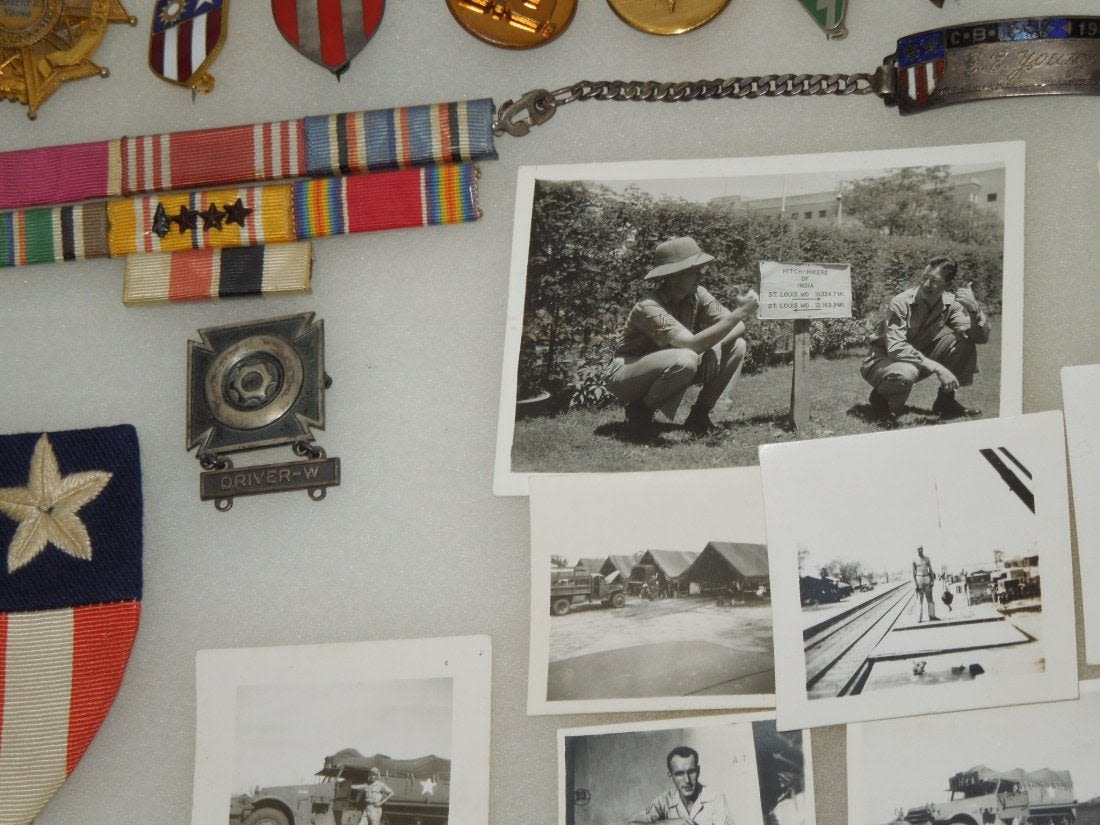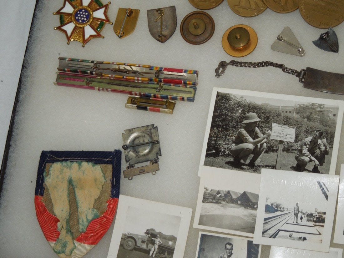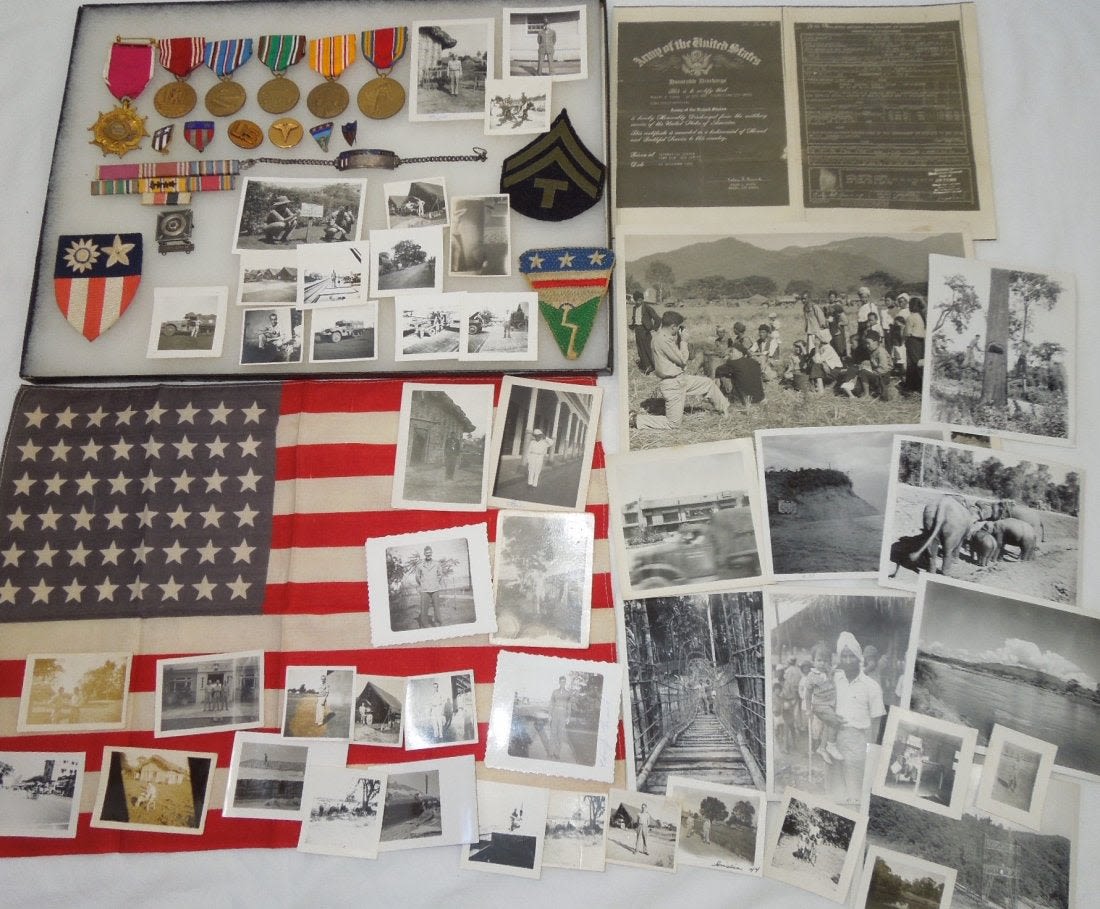 WWII medal and photograph group to Corporal Robert Young, a Legion of Merit recipient. This medal is usually reserved for Lt. Colonels and above, so enlisted awards are fairly scarce. He was a truck driver on the Ledo Road of the China Burma India (CBI) theater. The lot includes his original hand engraved slot brooch Legion of Merit, all of his other campaign medals, theater made silver CBI pins, US made CBI and lego road pins, theater made CBI and Ledo Road patches, a number of period photographs, a cloth 48 star US flag, period copy of his service record, and more.