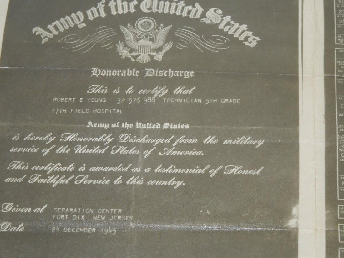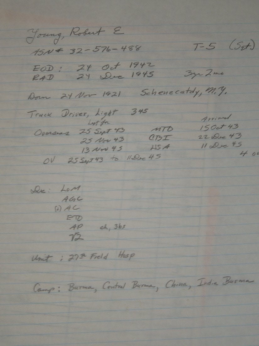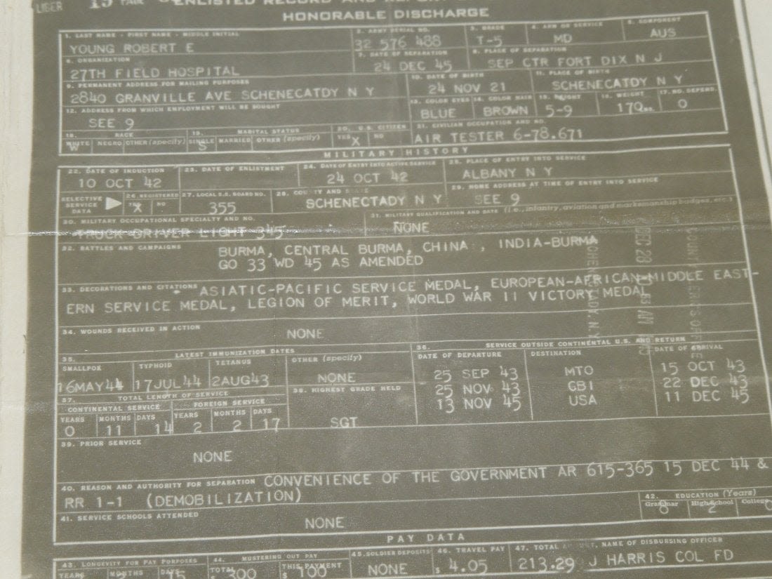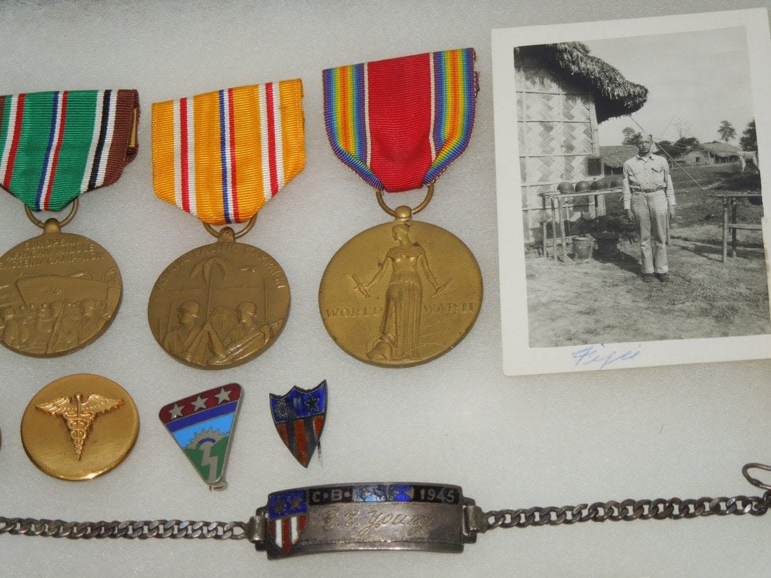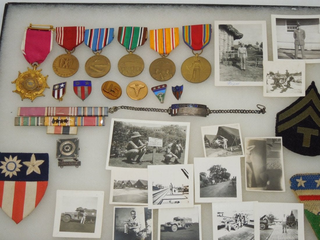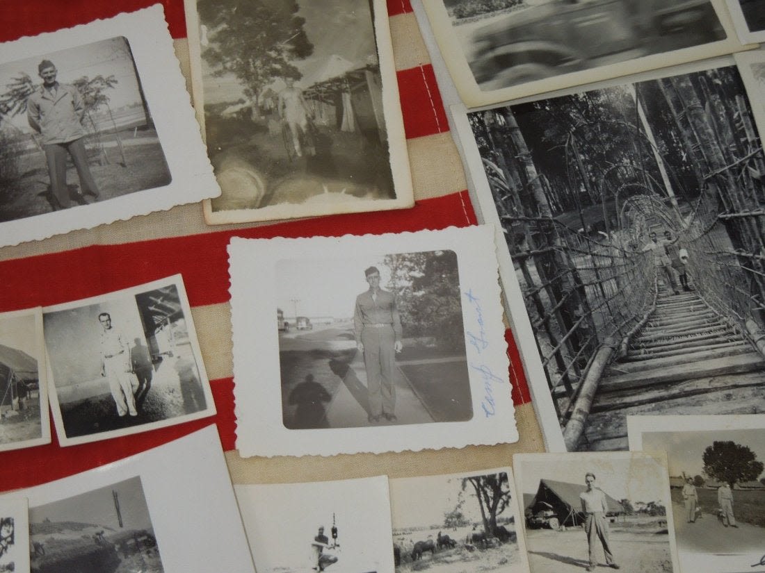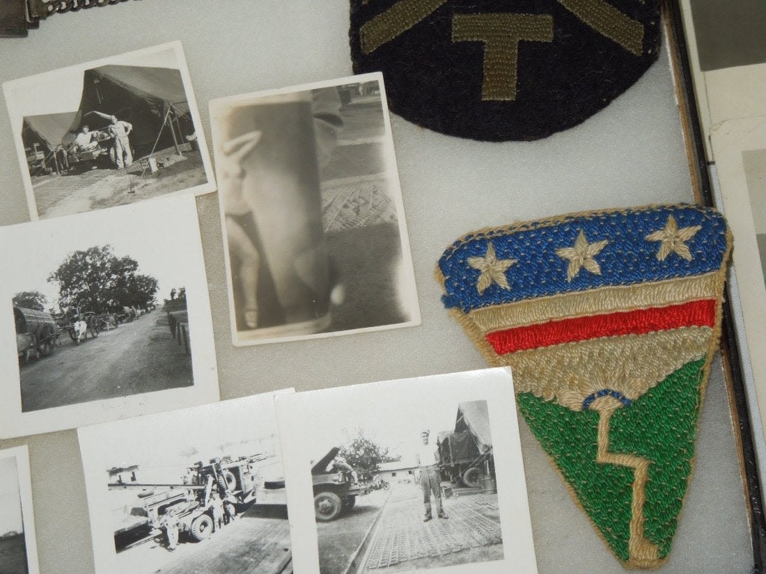 WWII medal and photograph group to Corporal Robert Young, a Legion of Merit recipient. This medal is usually reserved for Lt. Colonels and above, so enlisted awards are fairly scarce. He was a truck driver on the Ledo Road of the China Burma India (CBI) theater. The lot includes his original hand engraved slot brooch Legion of Merit, all of his other campaign medals, theater made silver CBI pins, US made CBI and lego road pins, theater made CBI and Ledo Road patches, a number of period photographs, a cloth 48 star US flag, period copy of his service record, and more.