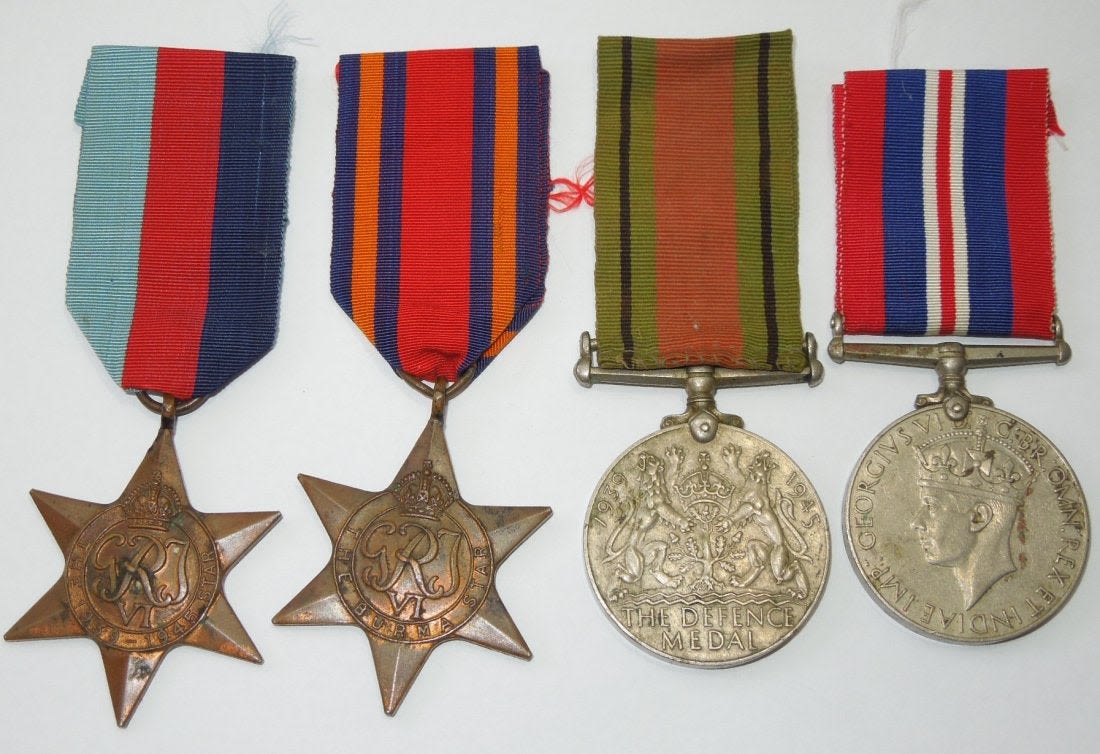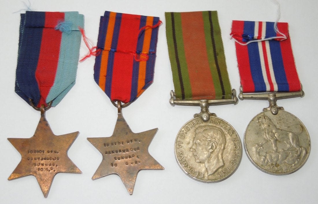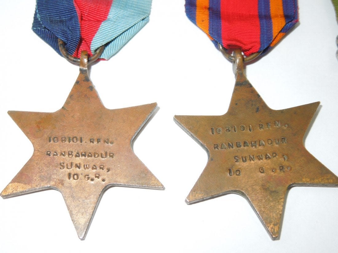 Lot of four medals from Rifleman Ranbahadjr Sunwar, 10th Gurkha Rifles consisting of the 1939-45 Star (named), Burma Star (Named), British War Medal, and British Defence Medal.