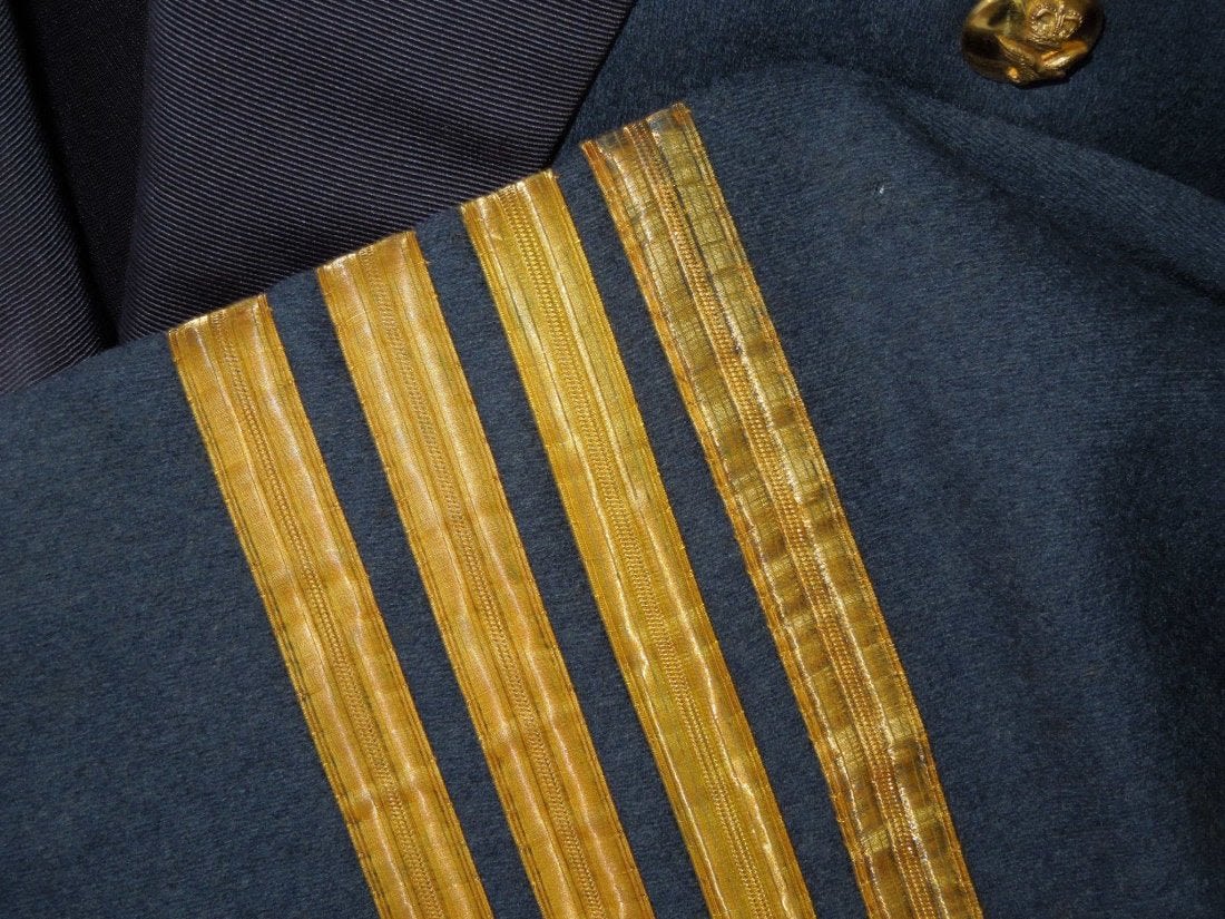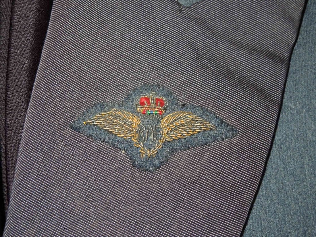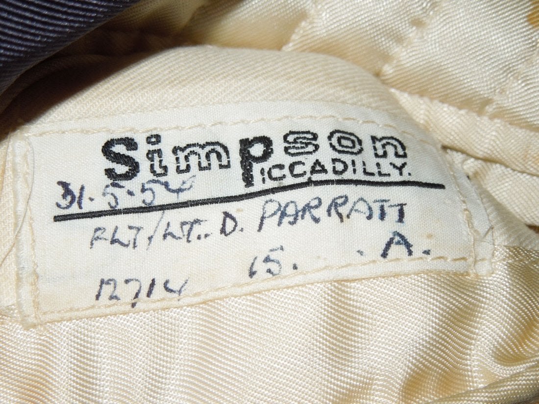 Original 1950s era British Royal Air Force mess dress uniform named on the tailor label to Flight Lieutenant D. Parratt (Group Captain Dennis Parratt). Good condition with bullion RAF wings and cuff rank.