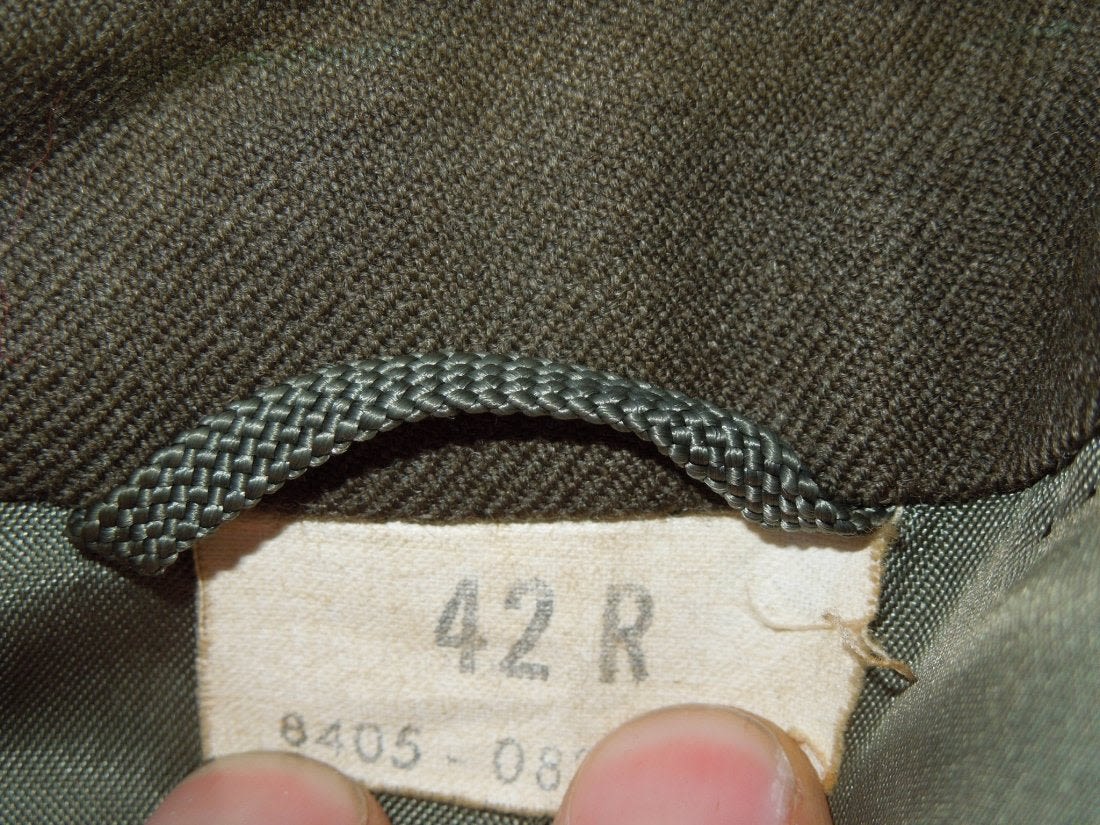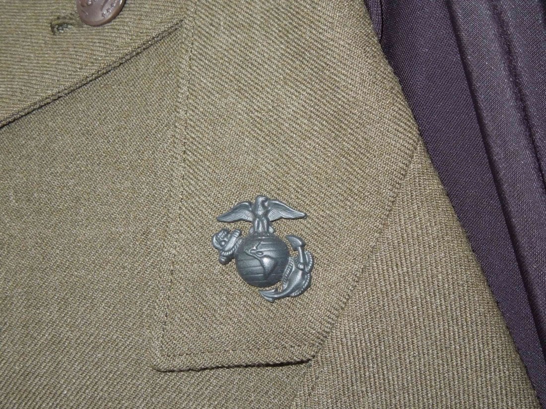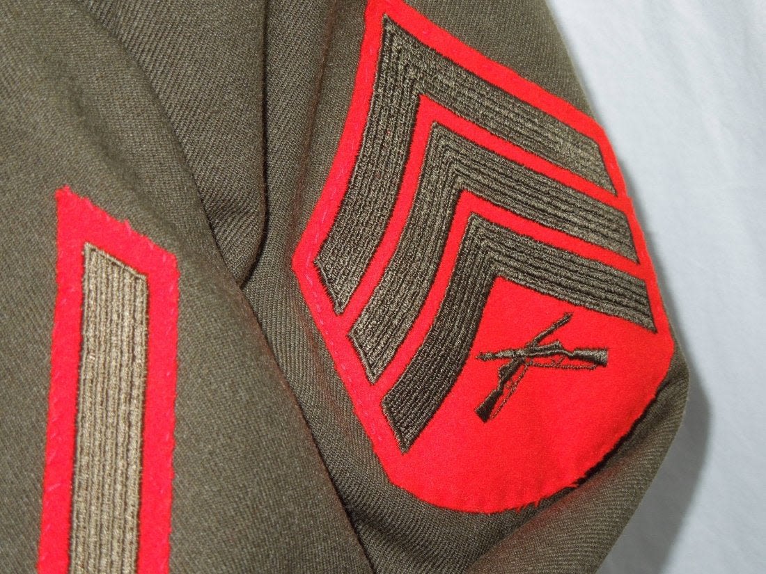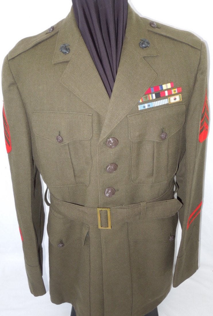 Original USMC uniform from a Korean War Sergeant with ribbon bars showing wartime service, a valor award, and has rank stripes as well as collar Eagle Globe and Anchor devices.