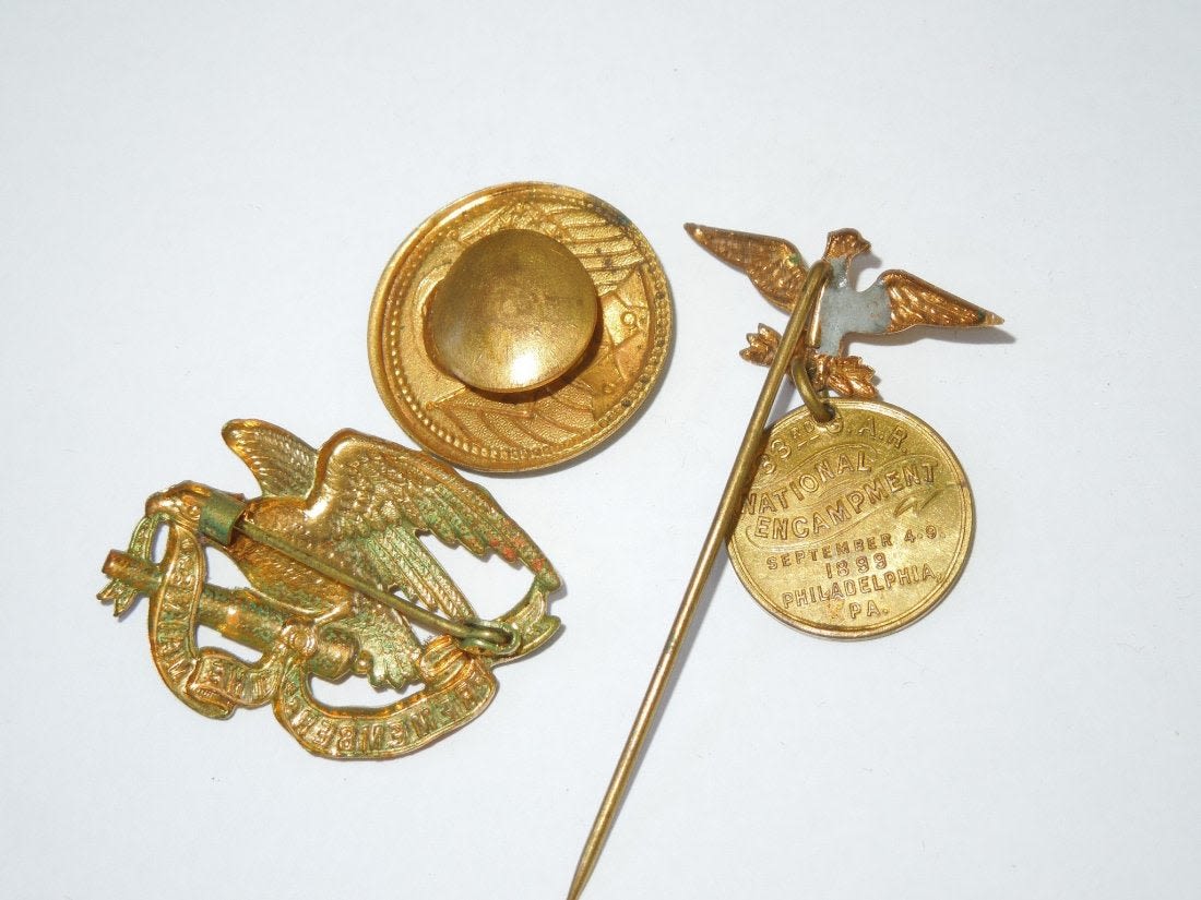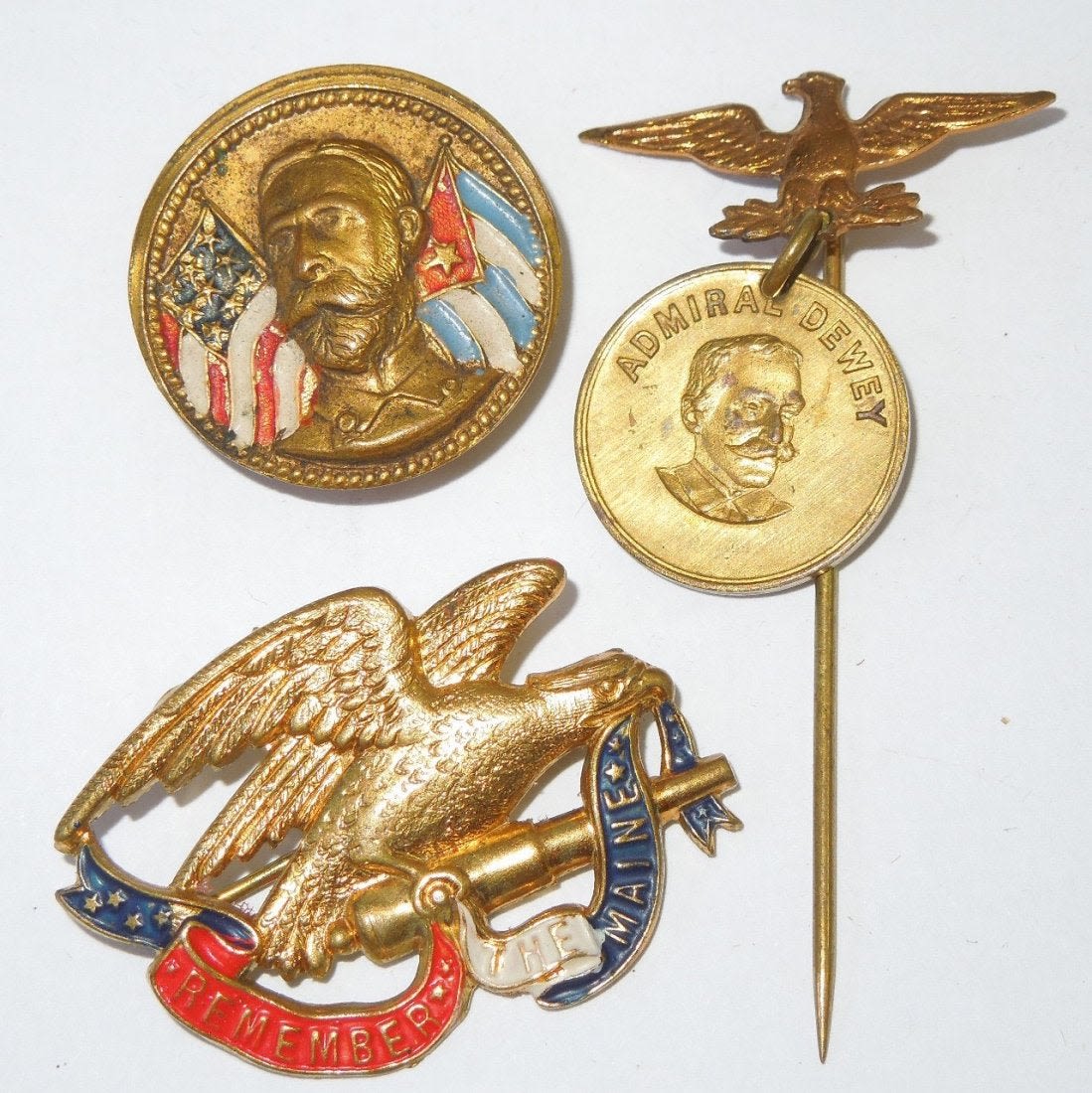 Spanish American War SAW Admiral Dewey & Remember the USS Maine Pins. You will receive the following 3 items. Admiral Dewey lapel pin with raised figure of Admiral Dewey and colored flags. Admiral Dewey & Eagle pin with raised picture of Dewey on the front and 33rd G.A.R. National Encampment September 4-9, 1899 Philadelphia, PA. on the reverse. The last item is a Remember the Maine Eagle with colored ribbon pin. All items are in nice condition.
