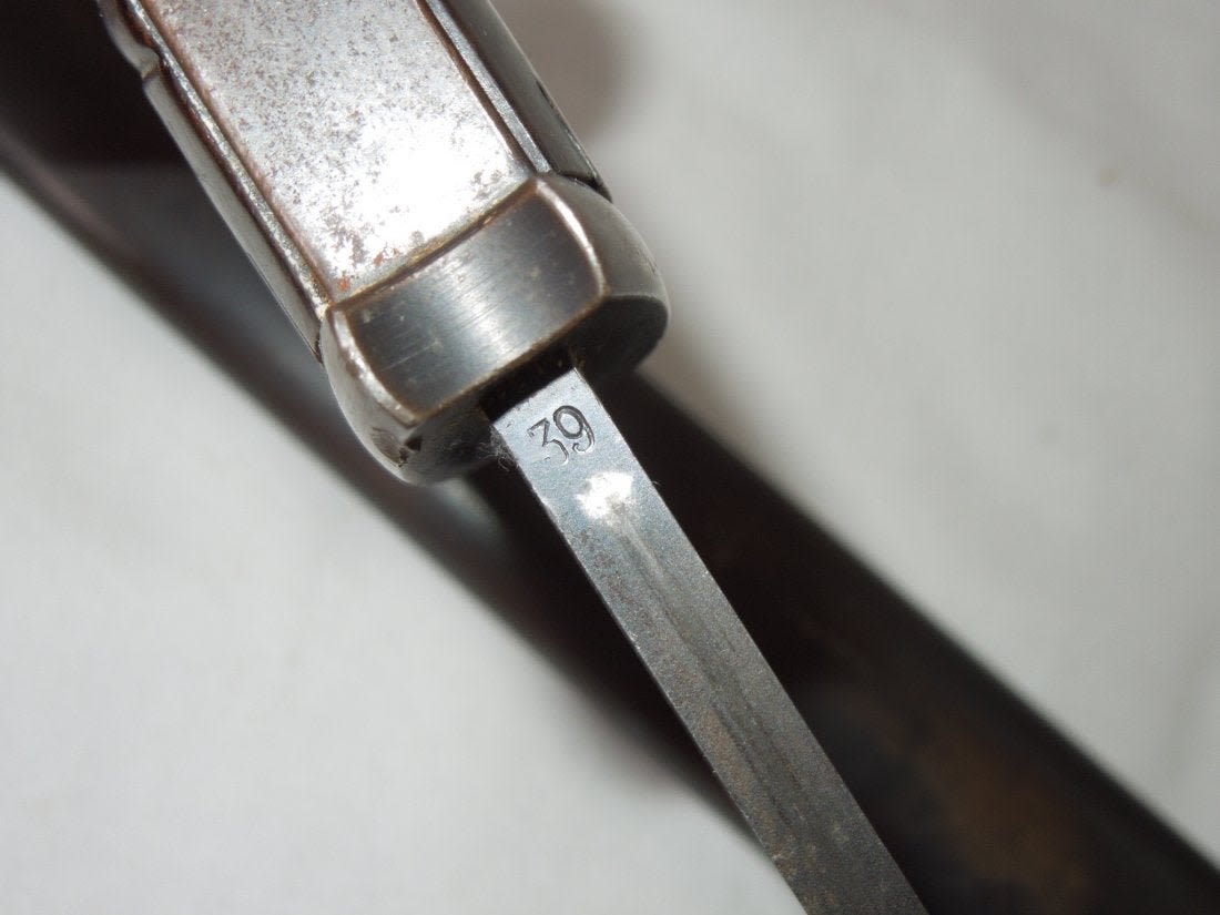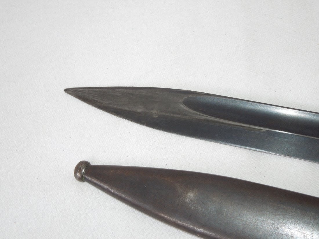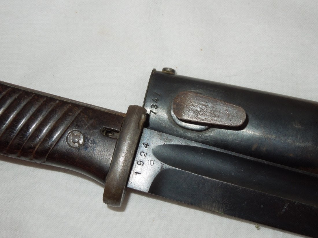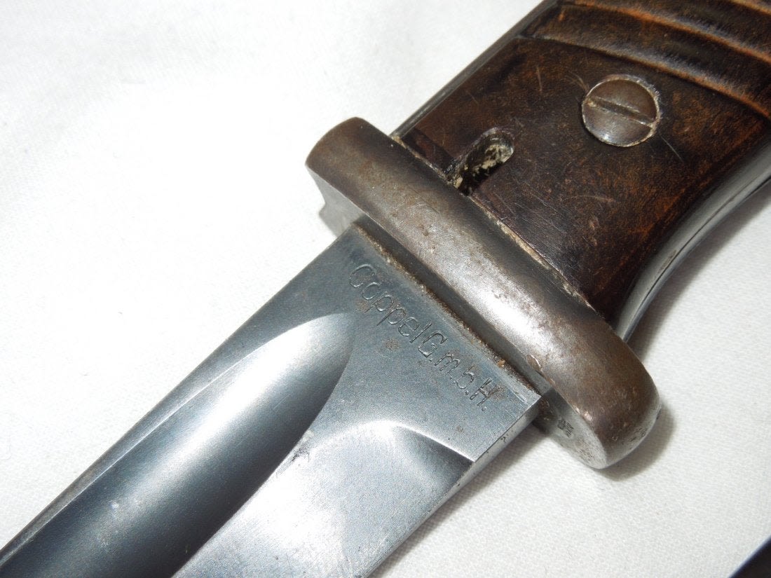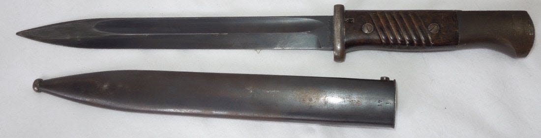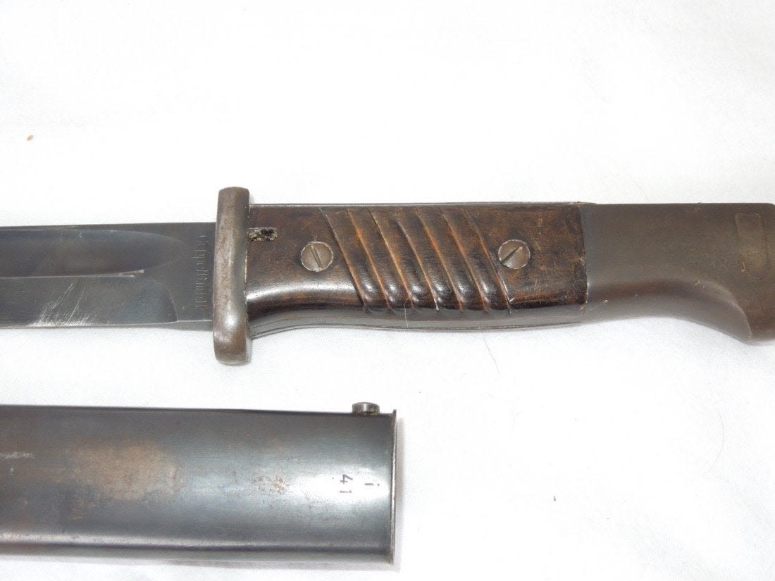 Original non matching number German Wehrmacht K98 bayonet and scabbard. Bayonet is 1939 dated and made by Goppel, and the scabbard is 1941 dated.