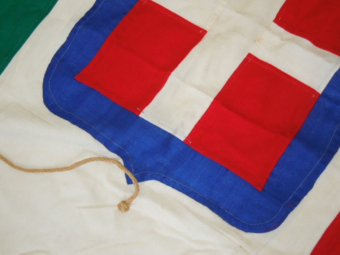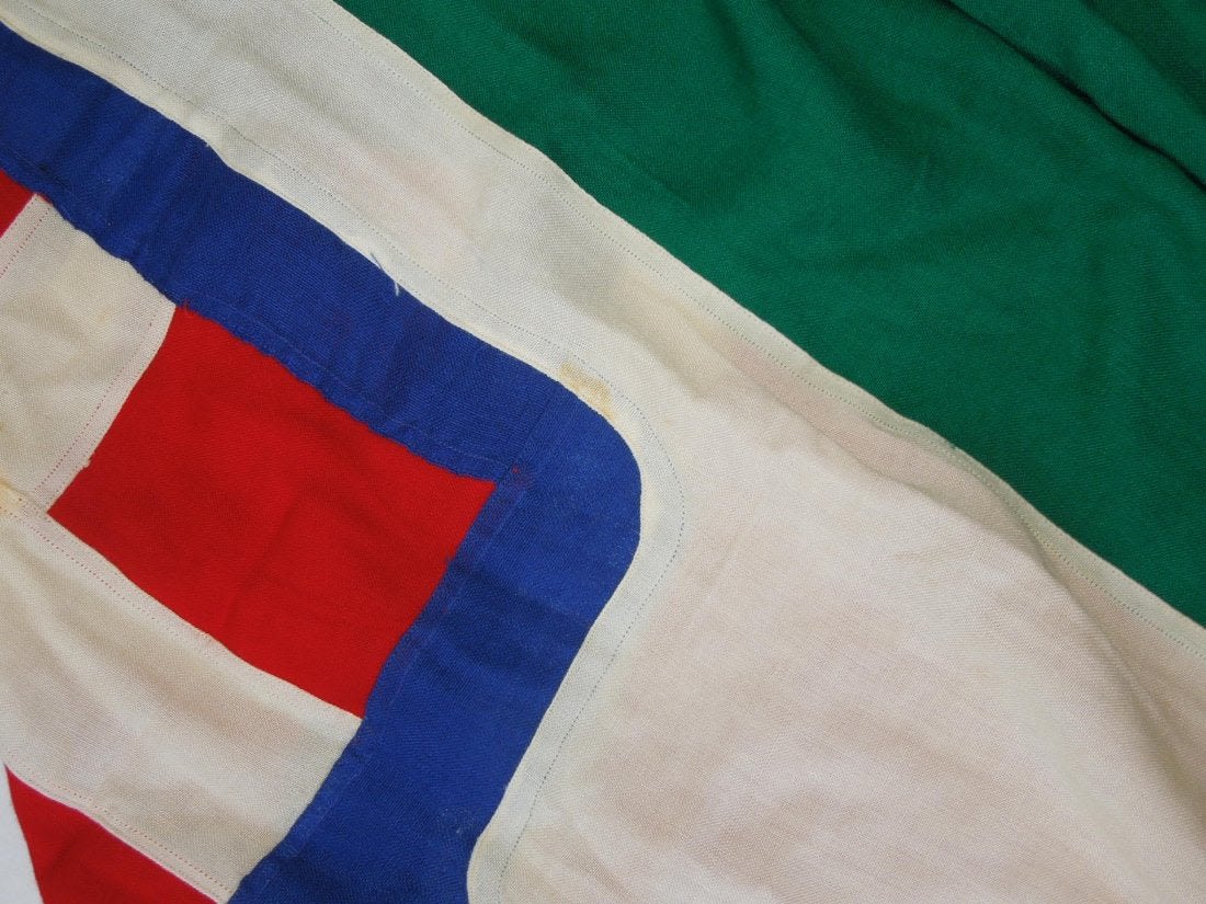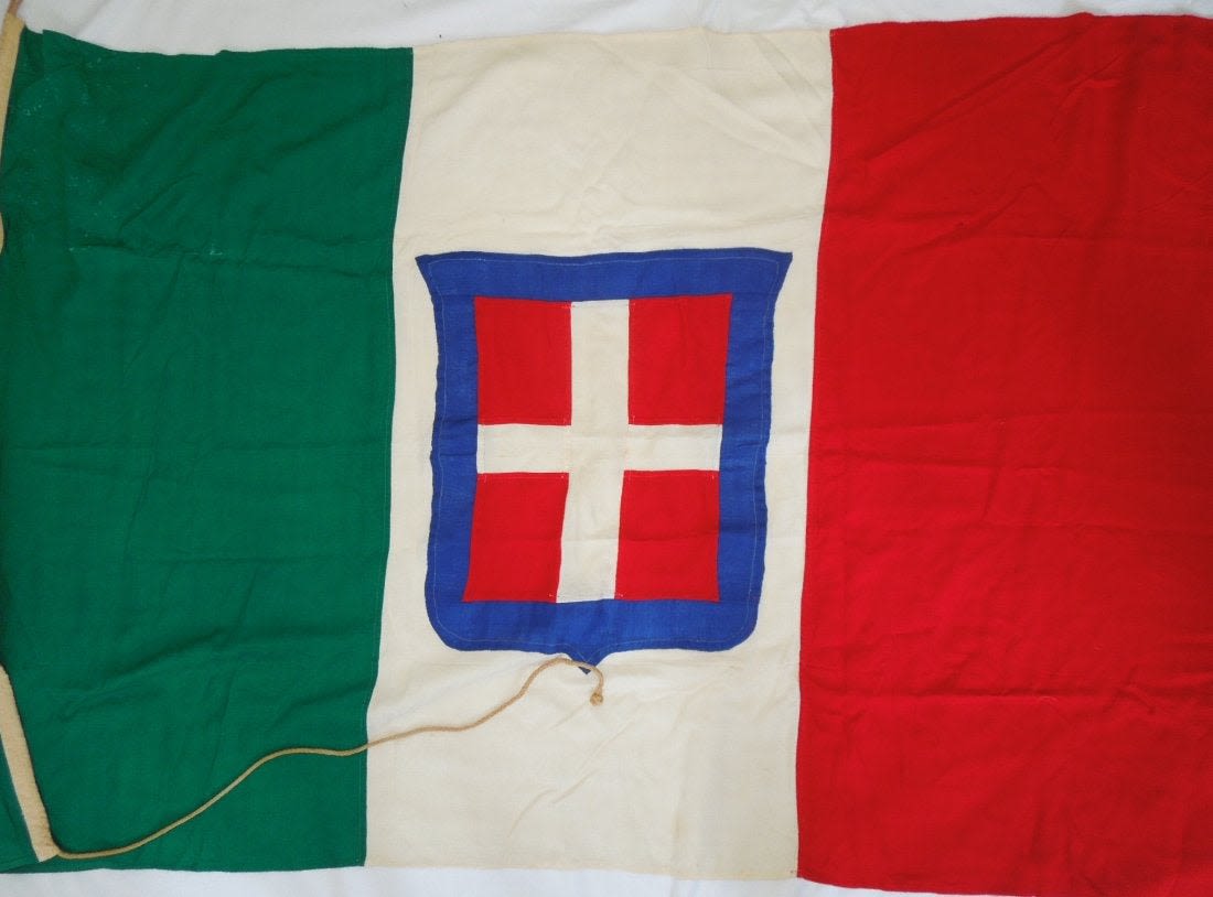 WWII very vibrant colored Italian House of Savoy national flag measuring approximately 54 inches by 36 inches in size. Possible a Naval Ensign given the attachment cord. Consignor noted that it is a US veteran bring back that he obtained many years ago from the veteran, but did not document any prior owner information at that time. Good condition for its age.