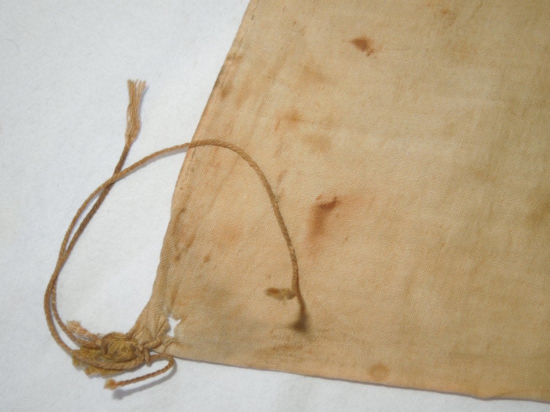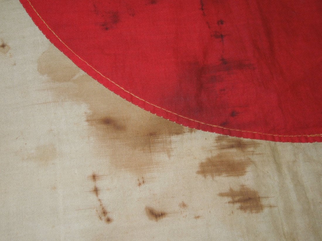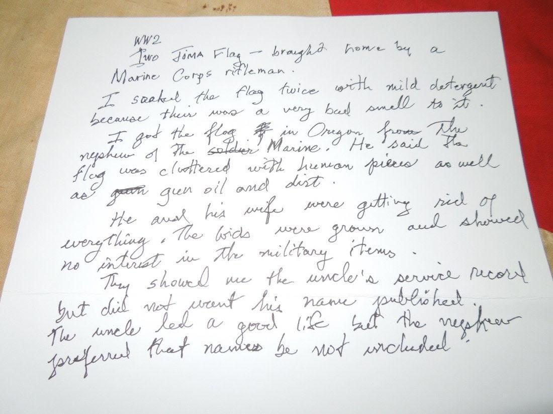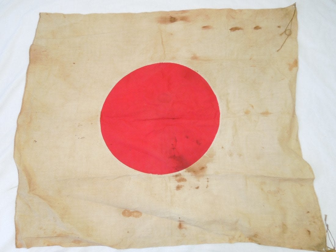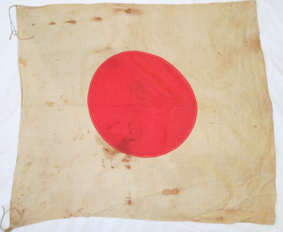 Original cloth WWII Japanese military flag measuring approximately 30.5 x 26.5 inches. Consignor included a card noting that he obtained it from an unnamed USMC vet who picked this up in very soiled condition at the Battle of Iwo Jima.