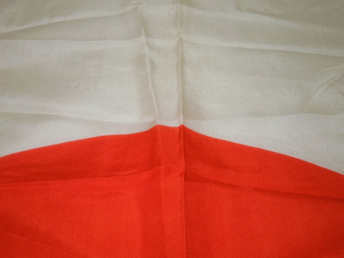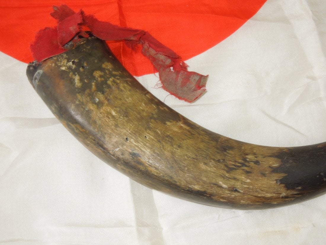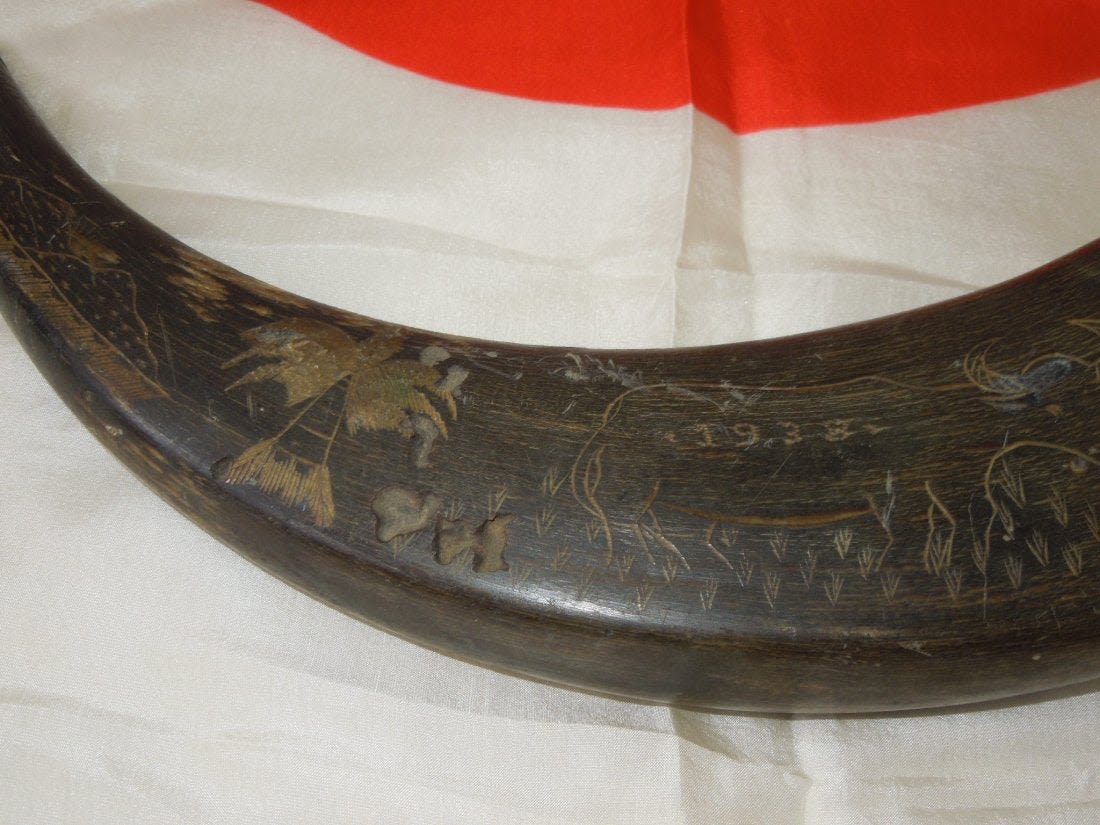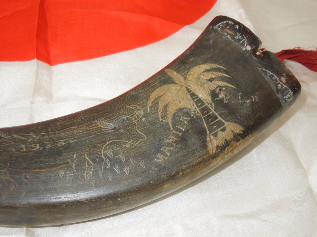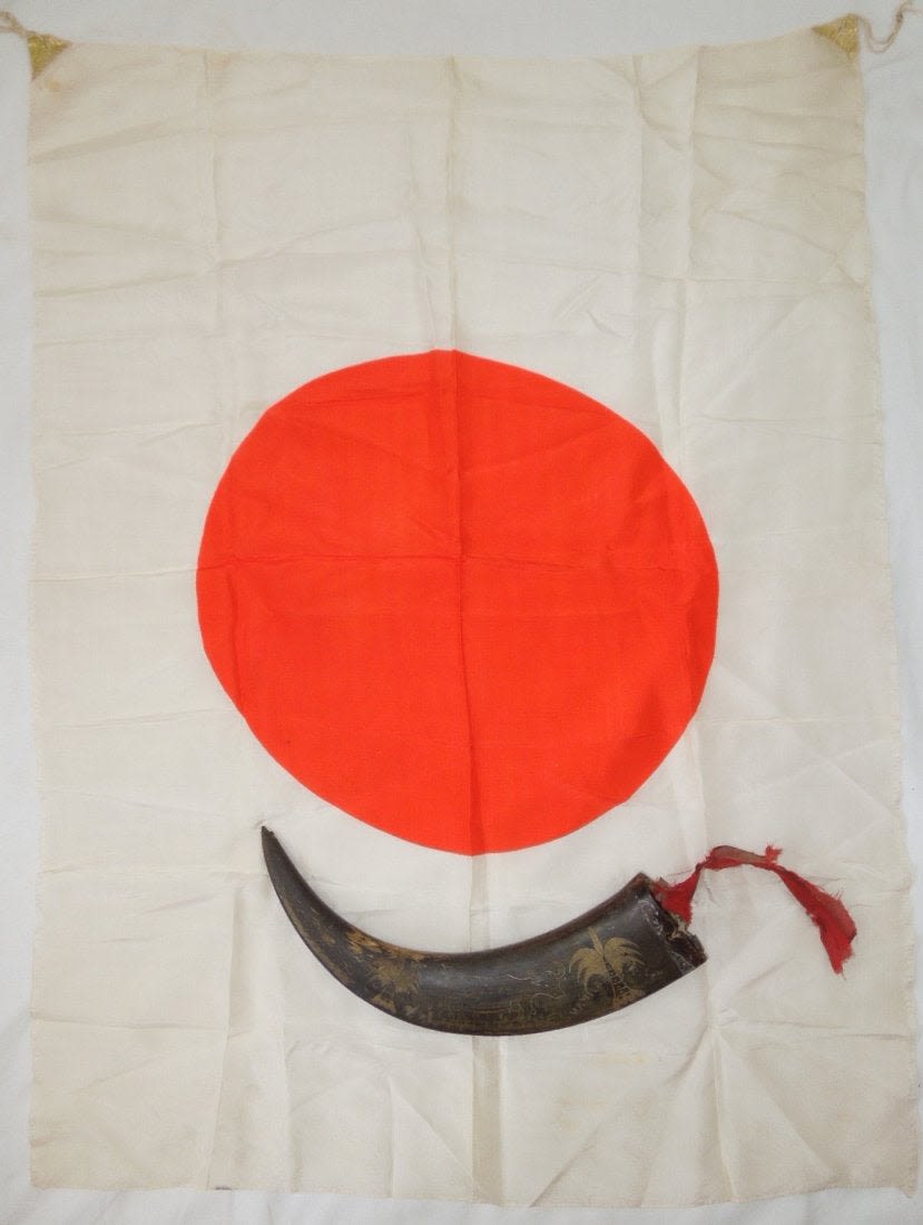 WWII medium sized silk Japanese flag and an engraved Manila 1938 water buffalo style horn. Horn has some damage, and the flag is soiled from use.