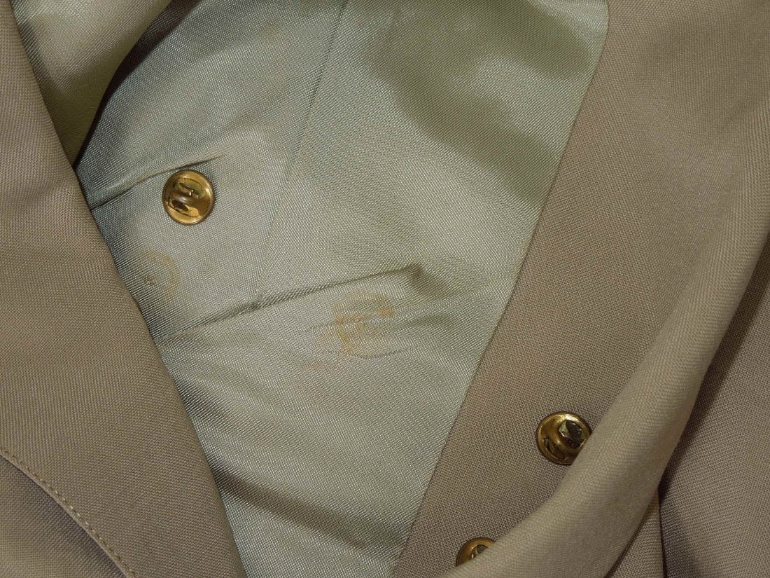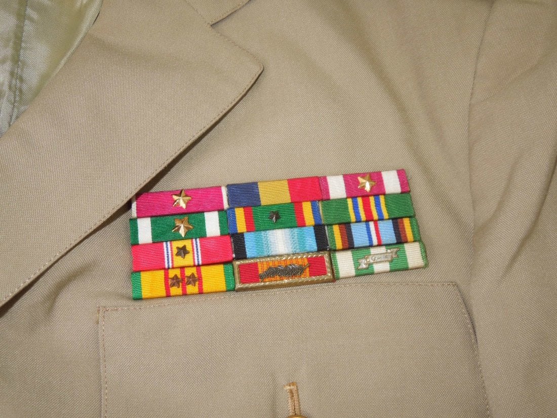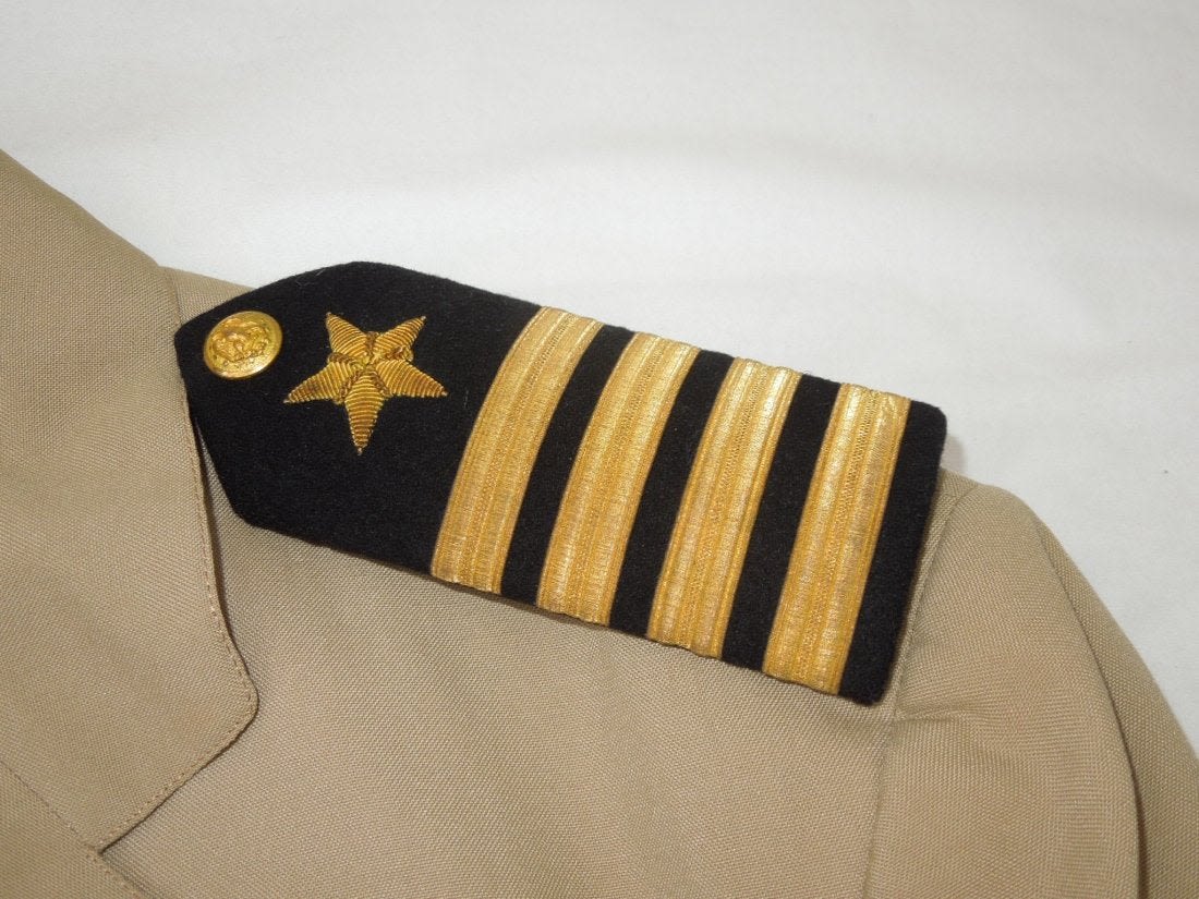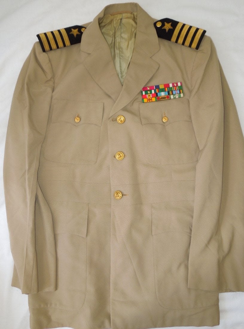 USN Khaki uniform from the 1960s named to Dr. J.V. Sharp on the tailor tag. Features Vietnam and Antarctic service and a Legion of Merit and Navy and Marine Corps Medal, among others. One cloth strap that holds the left shoulder captain board on is detached and needs re-sewing. Size 41.
