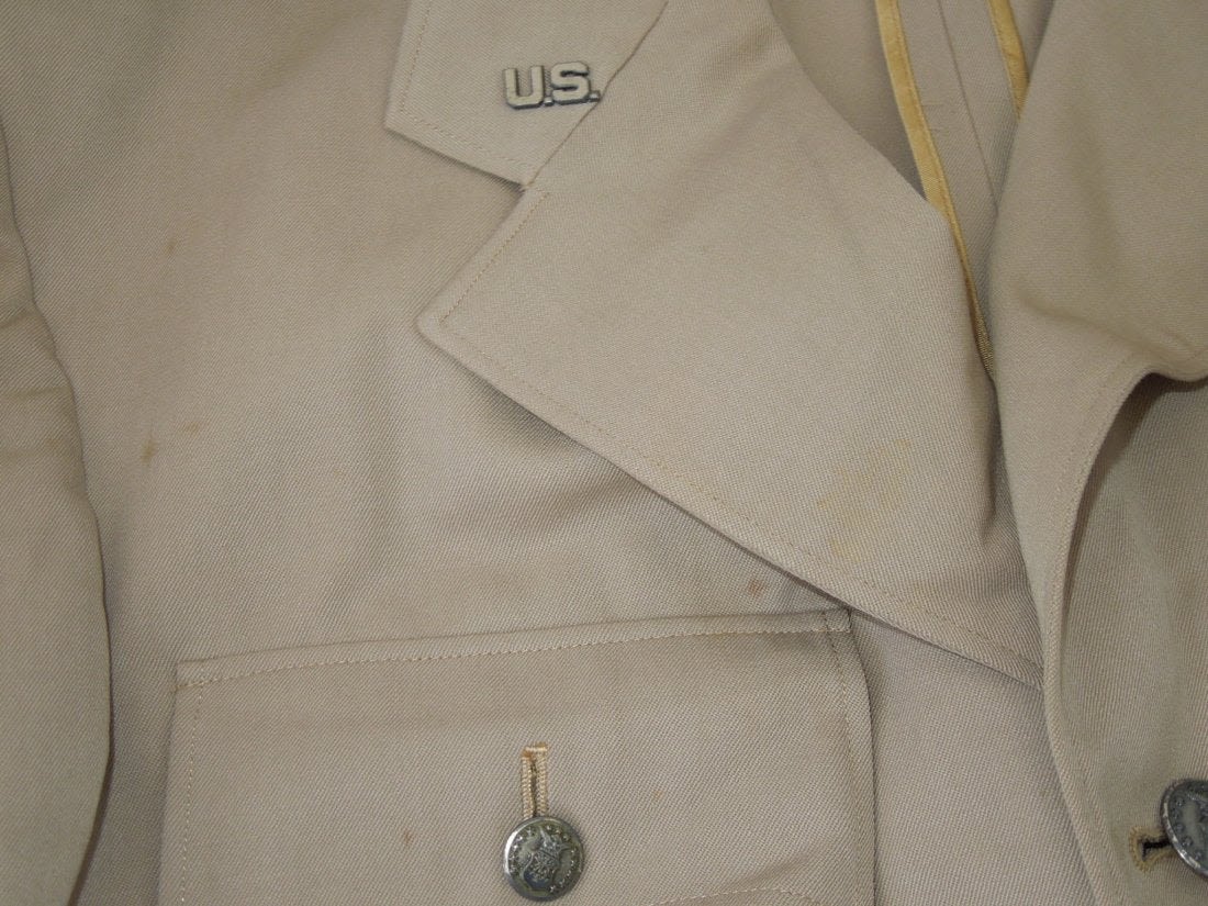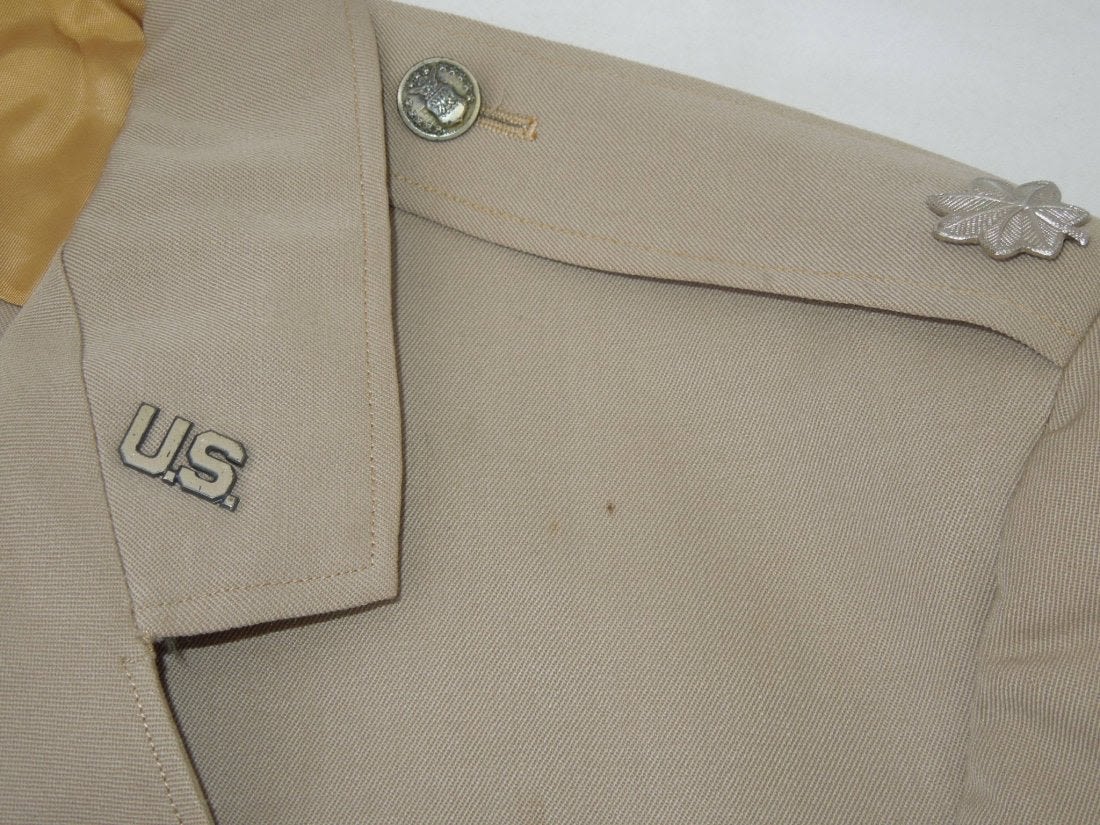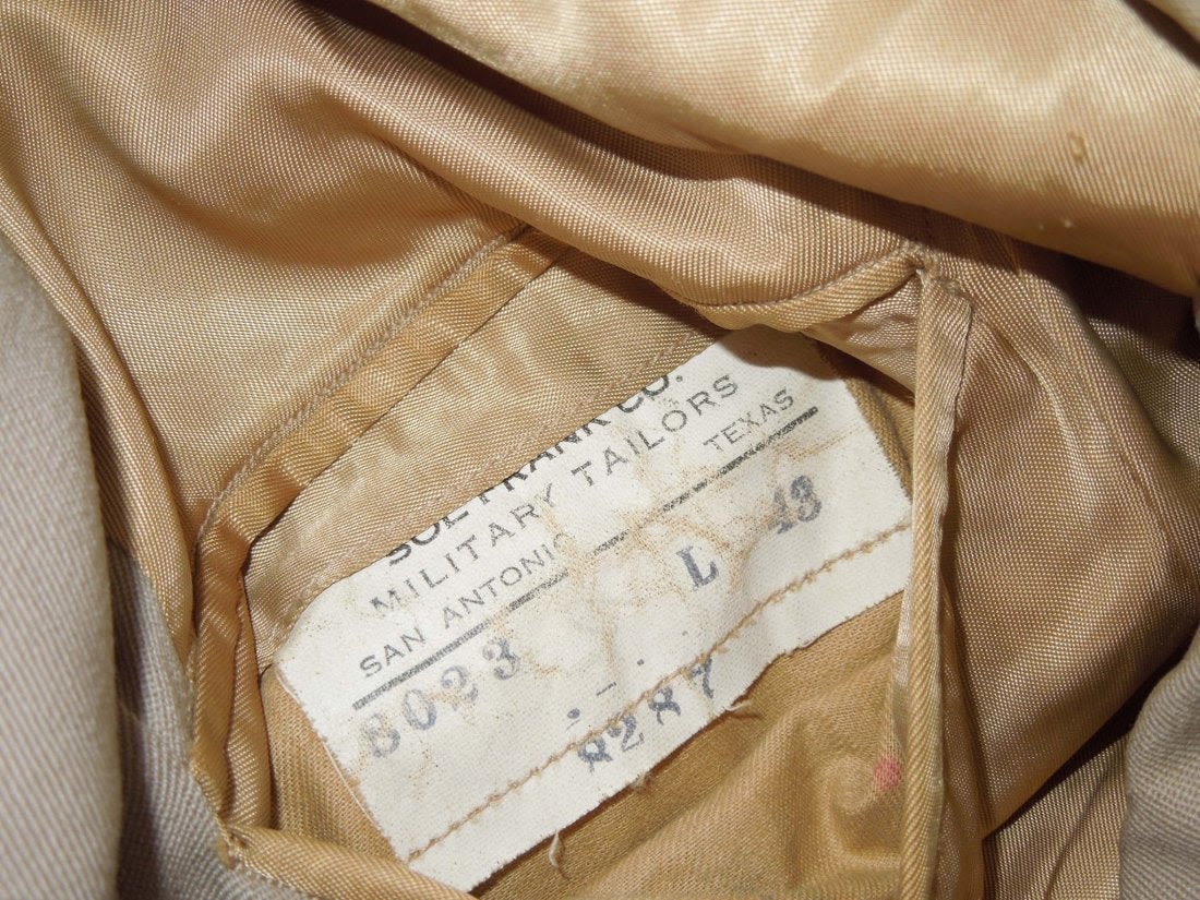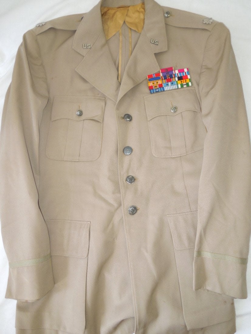 Silver Tans USAF Lieutenant Colonel Uniform jacket, not named, with WWII Pacific to Vietnam War service including a Purple Heart. Probably not a pilot due to lack of flying awards. It has some staining throughout, and several of the pins are broken off the back of the ribbon bar. Size 43.