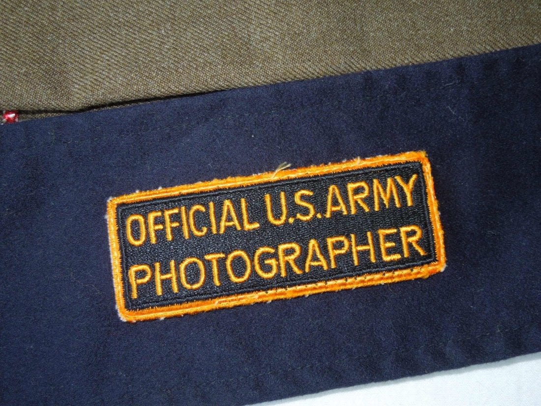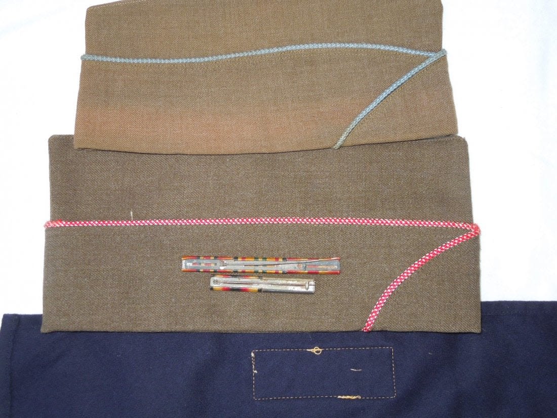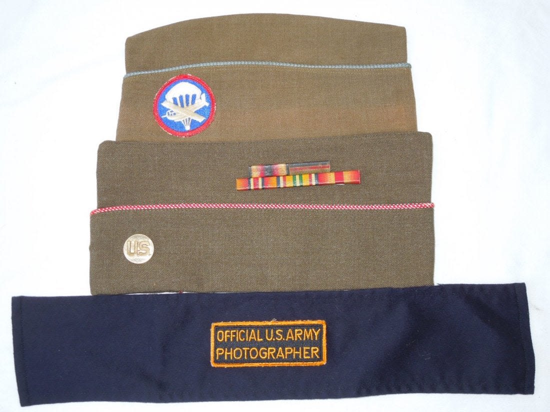 Group of unrelated military items- WWII Infantry Airborne enlisted garrison cap, medical corps overseas cap with US collar disc, US Merchant Marine ribbon bars from WWII, and a black wool brassard armband with a US Army Photographer patch sewn to it. Good condition.