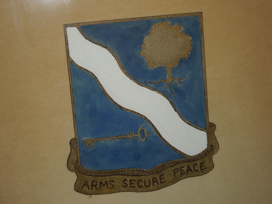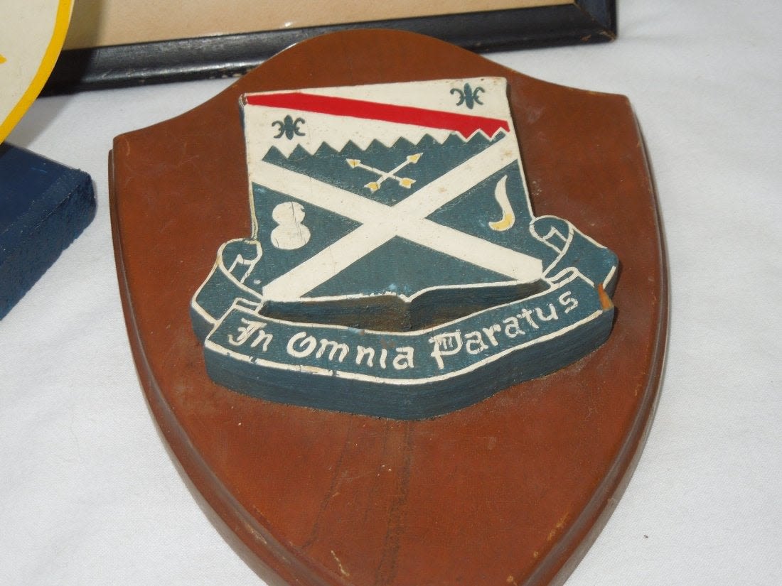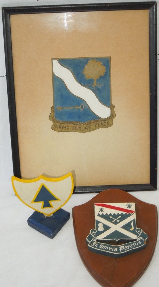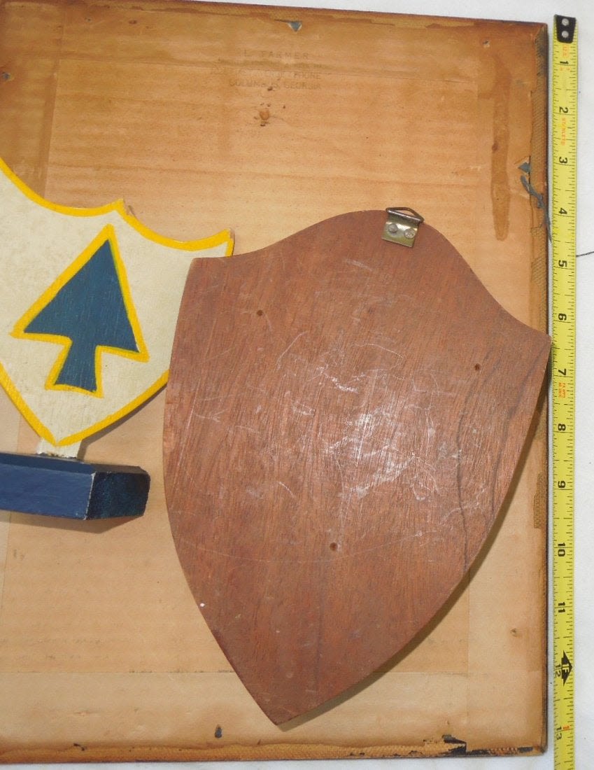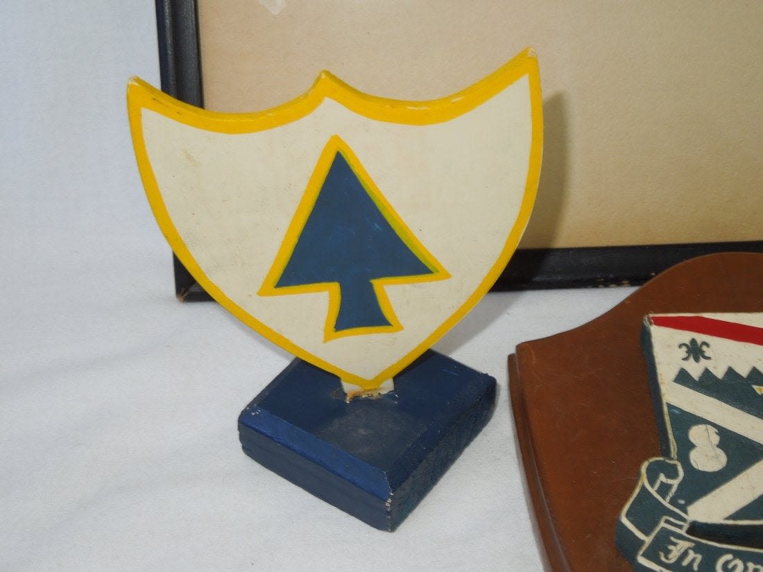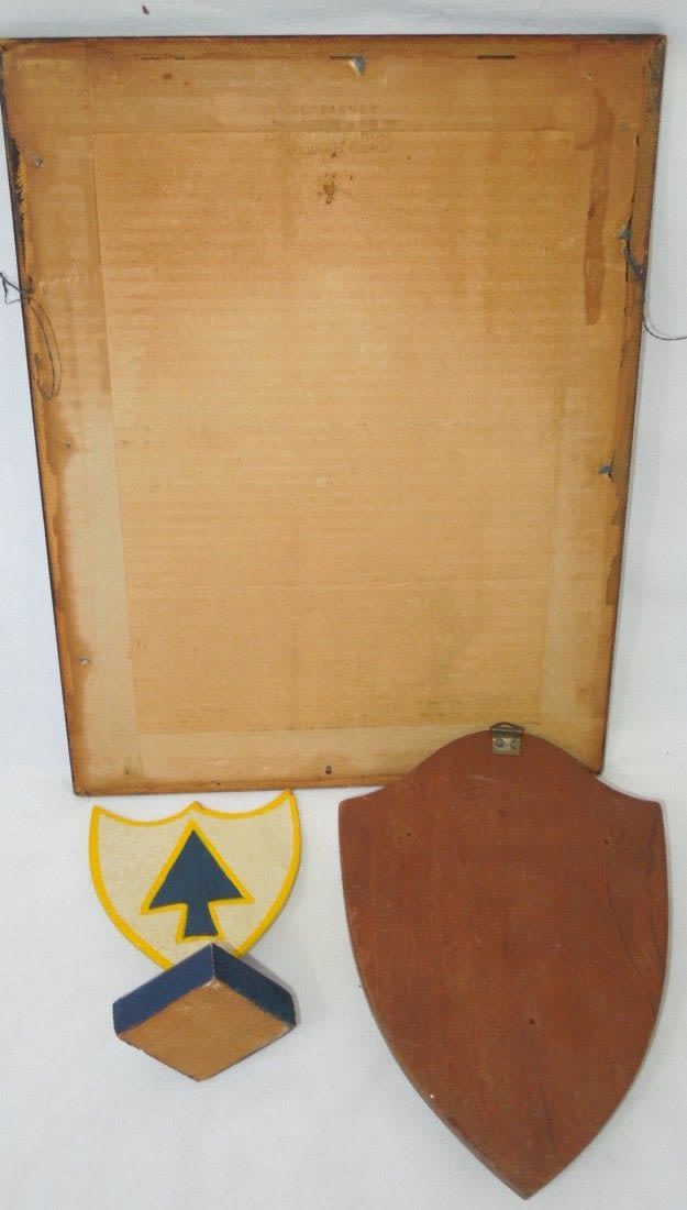 Lot of three unit insignia items WWII – 50’s era. Framed under glass 143rd Infantry Regiment / 36th Division painting (WWII era), 26th Infantry Regiment / 1st Division painted wooden desk ornament and 18th Infantry Regiment / 1st Division painted wooden wall plaque.