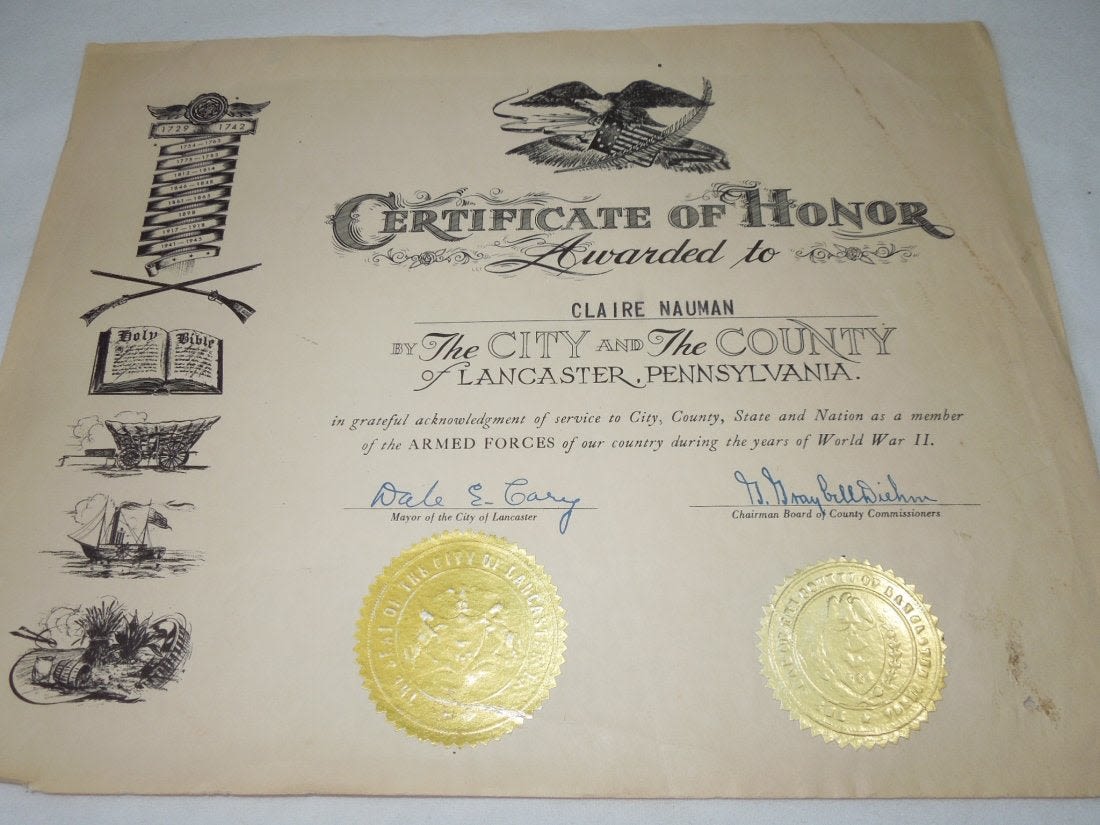 Original WWII era certificate of honor awarded by the City and County of Lancaster, PA to Claire Nauman. Possibly a Women’s Army Corps member. Measures 11 x 14 inches.