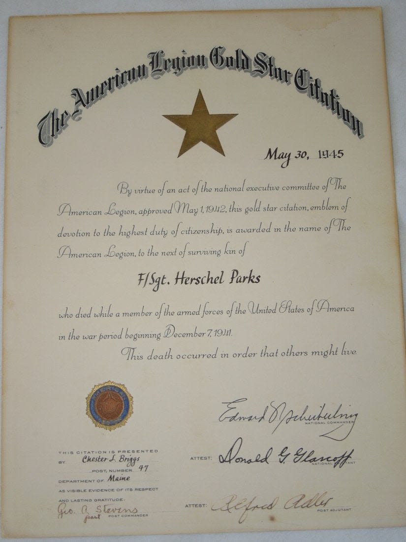 Original WWII American Legion Gold Star Citation Dated May 30, 1945 to First Sgt Herschel Parks, May 30, 1945, U.S. Army, 501st Parachute Infantry Regt, 101st Airborne Division, Killed in Action January 3, 1945, Bronze Star, Purple Heart, Buried in Luxembourg. It measures approximately 9 x 12 inches and has a separately applied gold star and raised American Legion logo.