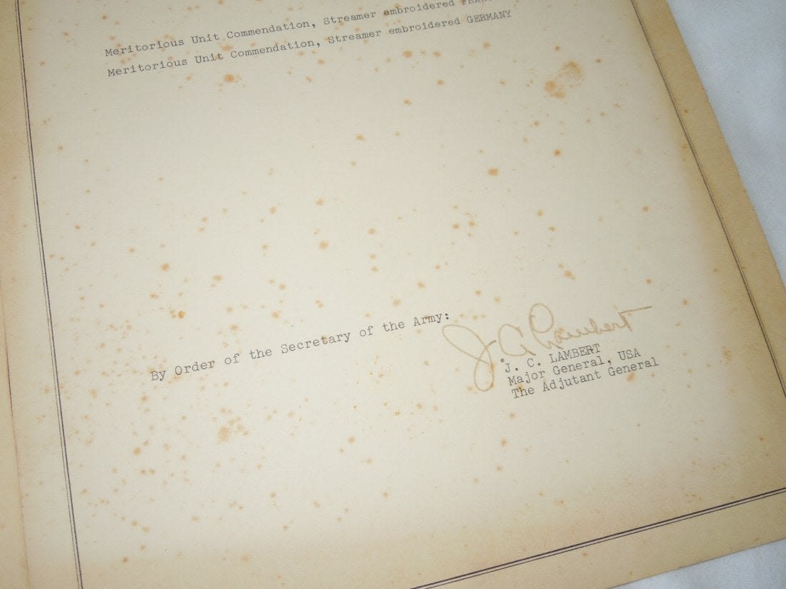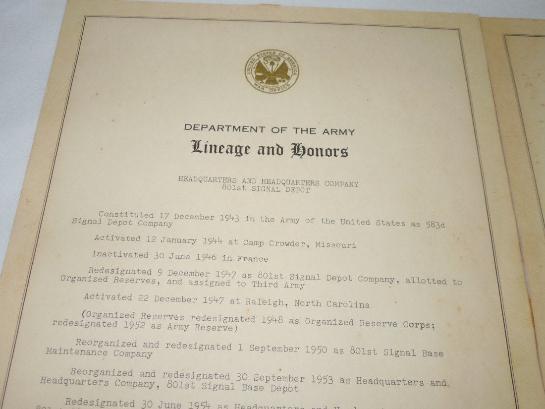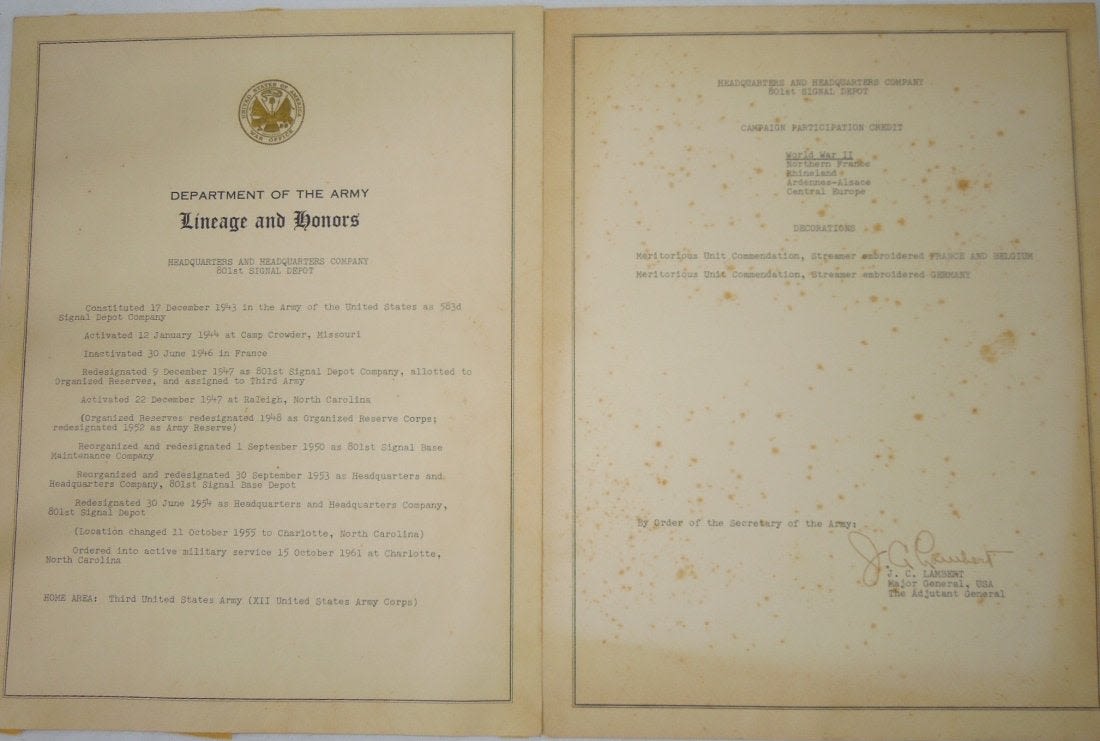 Original 1960s era pair of certificates from the Department of the Army detailing the lineage and honors of Headquarters and Headquarters Company, 801st Signal Depot from their activation in 1943 at Camp Crowder, Missouri, service I France, Rhineland, Ardennes – Alsace, and Central Europe to their stateside service through the 50’s and 60’s. It is signed by Major J.C. Lambert, the Adjutant General of the Army. Each measures 10 x 13 inches.