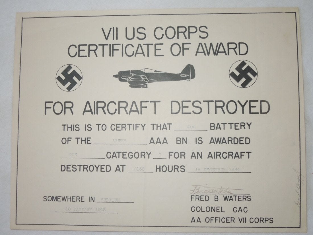 WWII January 18th, 1944 issued VII US Corps Certificate of Award to A Battery, 116th AAA Battalion for destroying one Category I (confirmed destroyed) aircraft at 0135 hours on December 18, 1944 in Belgium. It is original signed by Colonel Fred B. Waters, VII Corps AA Officer. A handwritten name of Geo. S. Bergg is penciled on the side. Measures about 8 x 11 inches.