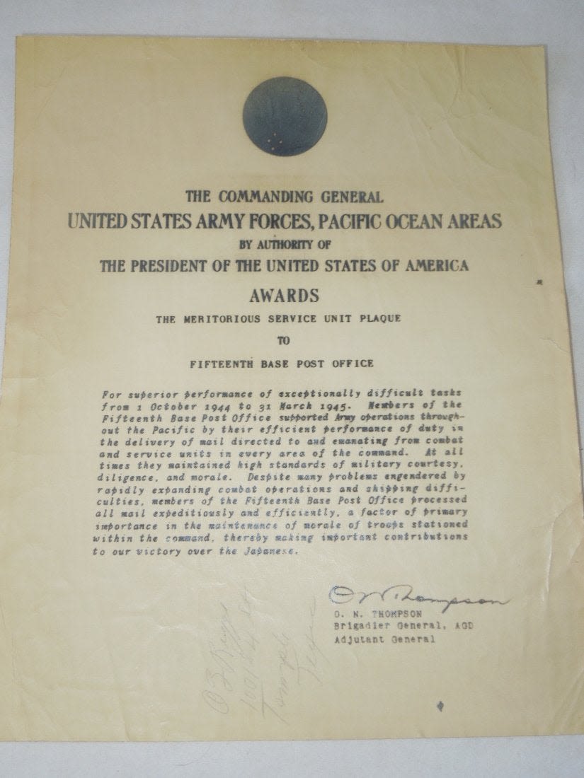 Original photostatic copy of a certificate issued by the Commanding General, US Army Forces Pacific awarding the Meritorious Service Unit Plaque to the Fifteenth Base Post Office for service from 1944 – 1945. Measures approximately 8 x 10 inches.
