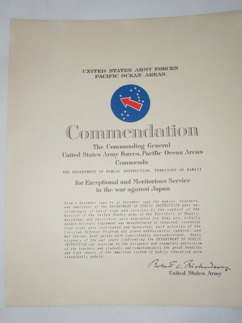 Original full sized color certificate issued by the Commanding General of the US Army Forces Pacific commending the Department of Public Instruction, Territory of Hawaii for service from December 1941 to December 1945. Measures approximately 10.25 x 12.25 inches and is on hardstock paper with a slight curve to it.