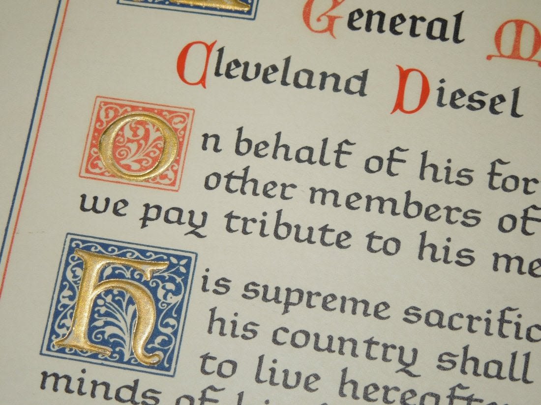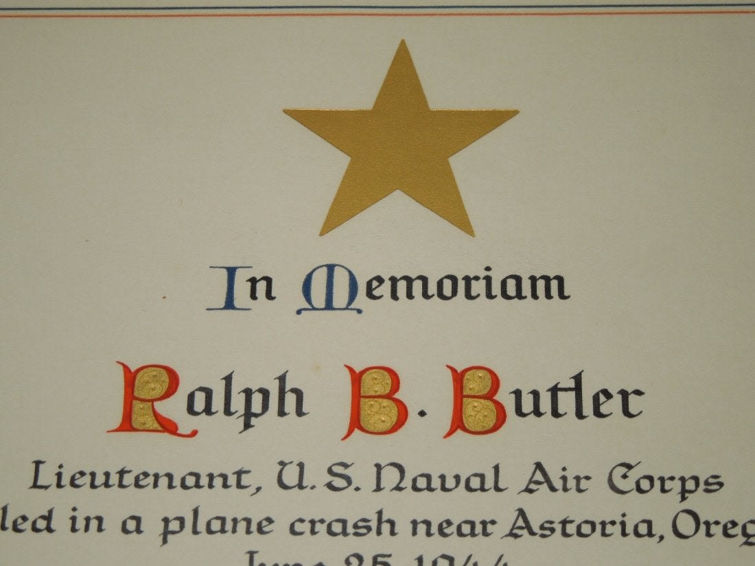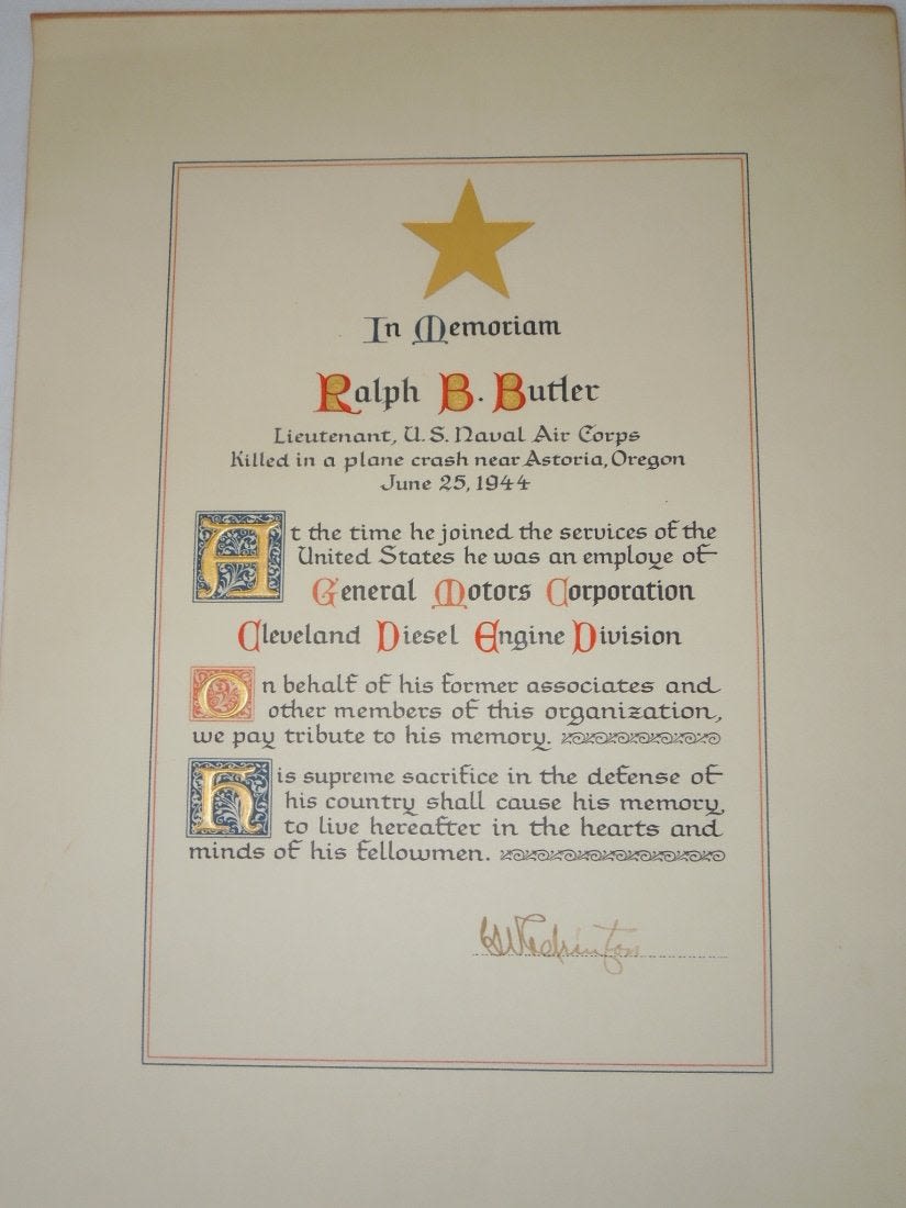Very nice WWII produced Gold Star certificate from the General Motors Corporation, Cleveland Diesel Engine Division to Lieut. Ralph B. Butler, June 25, 1944 Killed in Astoria, Oregon in a plane crash. With some raised lettering, it measures approximately 11 x 15.5 inches.