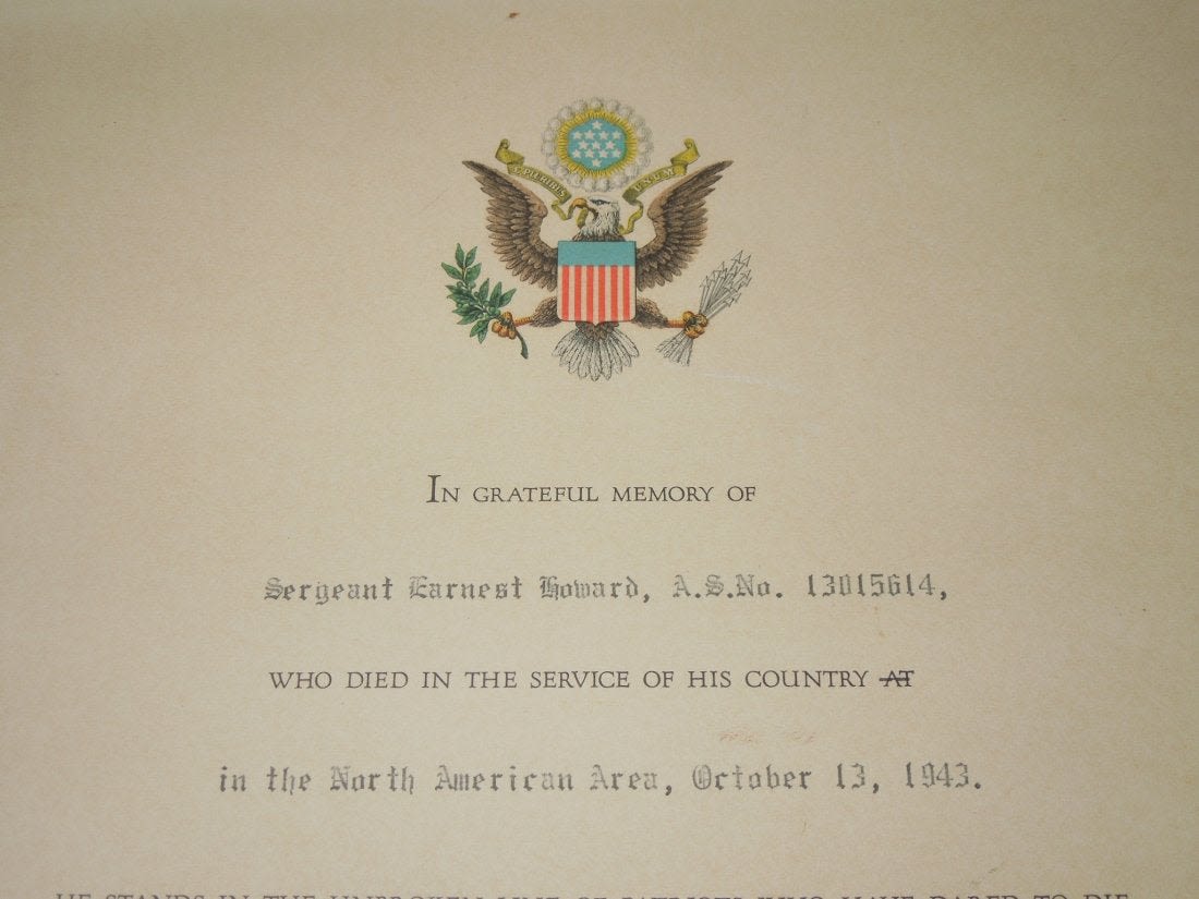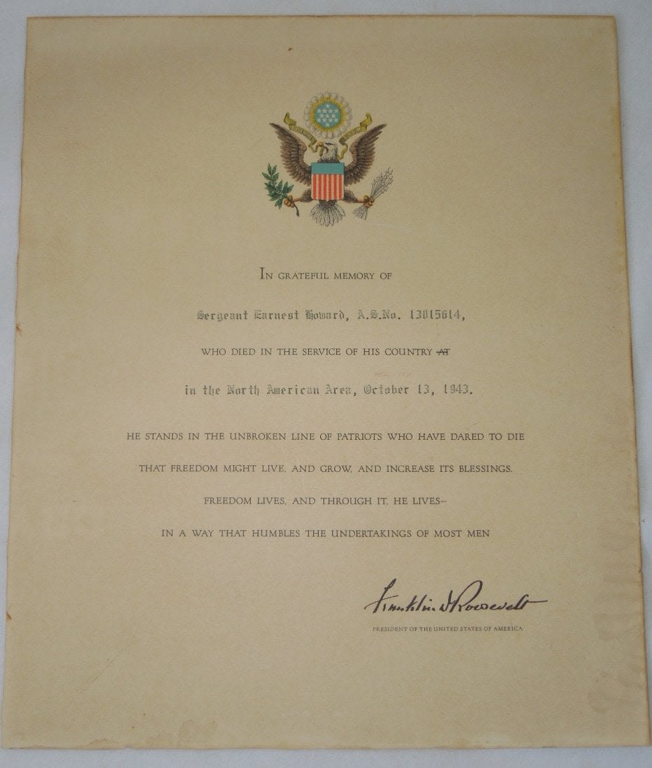Original WWII US Military Killed In Action accolade certificate issued to Sergeant Earnest Howard, 13015614, North American Area, who was killed on Oct 13, 1943, 30th Infantry Regt, 3rd Infantry Division in Italy. Measures approximately 12 x 14.5 inches.