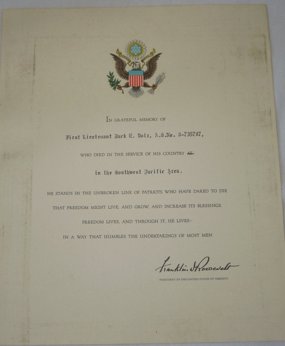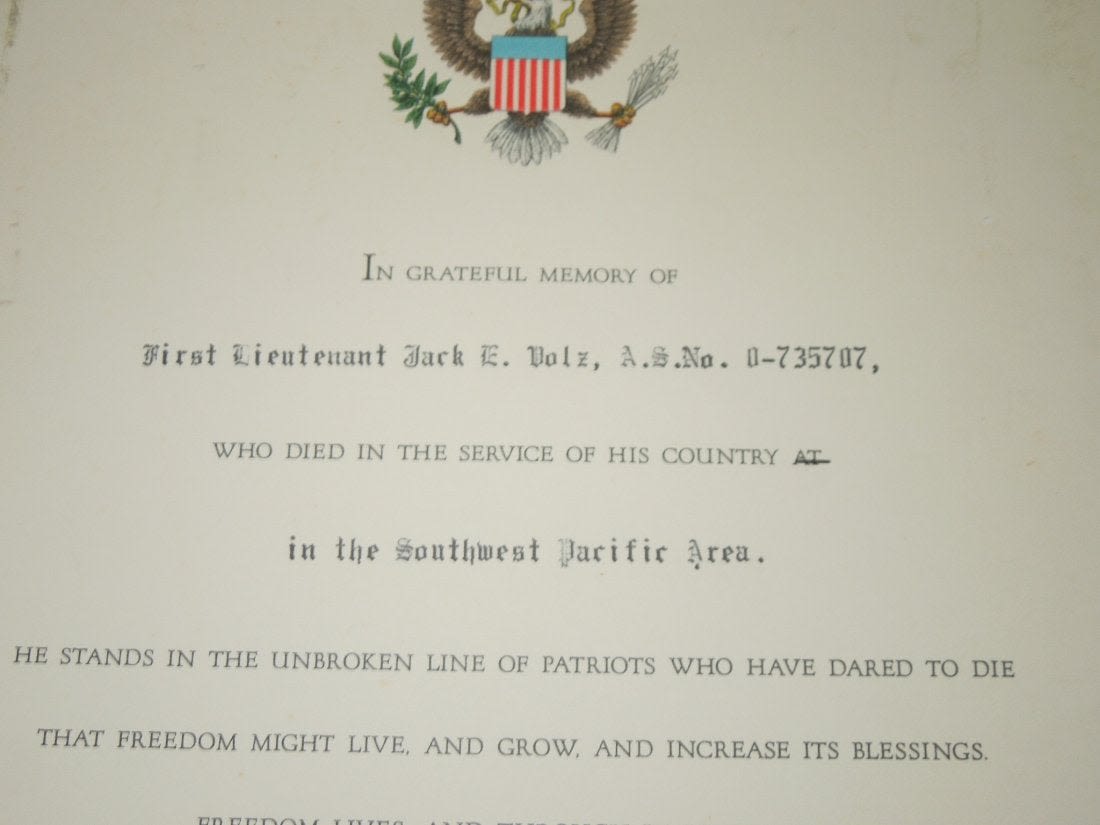 Original WWII US Military Killed In Action accolade certificate issued to 1st Lt. Jack E. Volz, Southwest Pacific, O-737707. ENLISTED IN THE ARMY AIR FORCES ON 20 MARCH 1942 AT LAFAYETTE, INDIANA. UNDERWENT B-24 AIRCRAFT TRANSITION TRAINING AT THE WILLOW RUN BOMBER PLANT IN MICHIGAN. DEPLOYED FROM HAMILTON FIELD, CALIFORNIA TO THE SOUTHWEST PACIFIC THEATRES OF OPERATION AT IRON RANGE AIRFIELD ON THE CAPE YORK PENINSULA OF QUEENSLAND, AUSTRALIA. ASSIGNED TO 5TH AIR FORCE, 90TH BOMBARDMENT ‘JOLLY ROGERS’ GROUP, 320TH BOMB ‘MOBY DICK’ SQUADRON STATIONED AT FENTON AIRFIELD SOUTH OF DARWIN, AUSTRALIA. STAGED AIRCRAFT MISSIONS THROUGH WARDS DROME, FIVE MILES NORTH OF PORT MORESBY, PAPUA NEW GUINEA. ON 27 OCTOBER 1943, HE FLEW IN THE LEFT SEAT AS THE COMMAND PILOT ABOARD A B-24D LIBERATOR NICKNAMED ‘SHACK RAT’ (SERIAL #42-40918). IT WAS ON A RECONNAISSANCE MISSION OF THE BISMARCK SEA SHIPPING LANES, AND THE JAPANESE FORCES OCCUPYING THE PORT OF RABAUL ON NEW BRITAIN ISLAND. LAST CONTACT WAS DURING THE RETURN ROUTE AT A GEOGRAPHIC LOCATION OF 3 DEGREES +15 MINUTES SOUTH, AND 147 DEGREES +45 MINUTES EAST. THEY WERE DIRECTED TO LAND AT DOBODURA AIRFIELD DUE TO A WEATHER CEILING OF 2,000 FEET AND 12 MILES OF VISIBILITY AT PORT MORESBY. HOWEVER, HIS B-24 AIRCRAFT CRASHED IN THE STEEP SARUWAGET MOUNTAIN RANGES ON THE HUON PENINSULA OF MOROBE PROVINCE, RESULTING IN THE LOSS OF ALL ONBOARD. Measures approximately 12 x 14.5 inches.