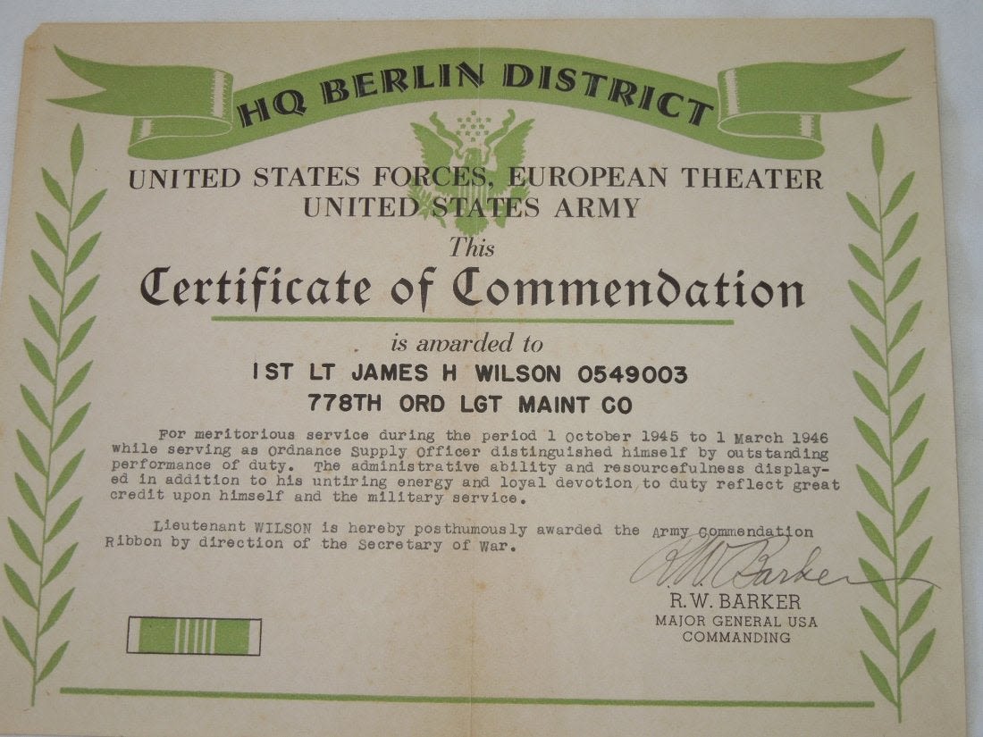 Original color WWII certificate of Commendation issued by Headquarters, Berlin District, US Forces European Theater, to 1st Lt. James H. Wilson of the 778th Ordnance Light Maintenance Company for meritorious service between October 1945 to March 1946, original hand signed by Major General R.W. Barker, Commanding. Measures approximately 8 x 10.5 inches.