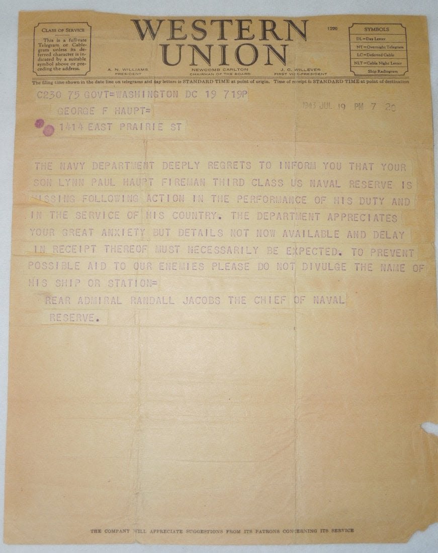 Original Western Union MIA Telegram to the father of Fireman 3rd Class, Lynn Paul Haput, 1943, USS Maddox DD-622, Sicily, killed on July 11, 1944 .