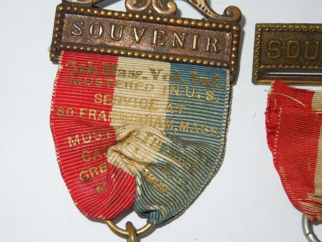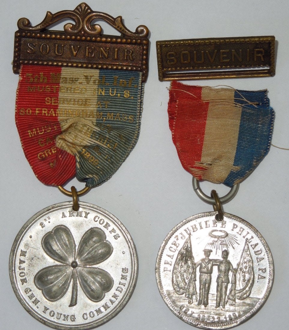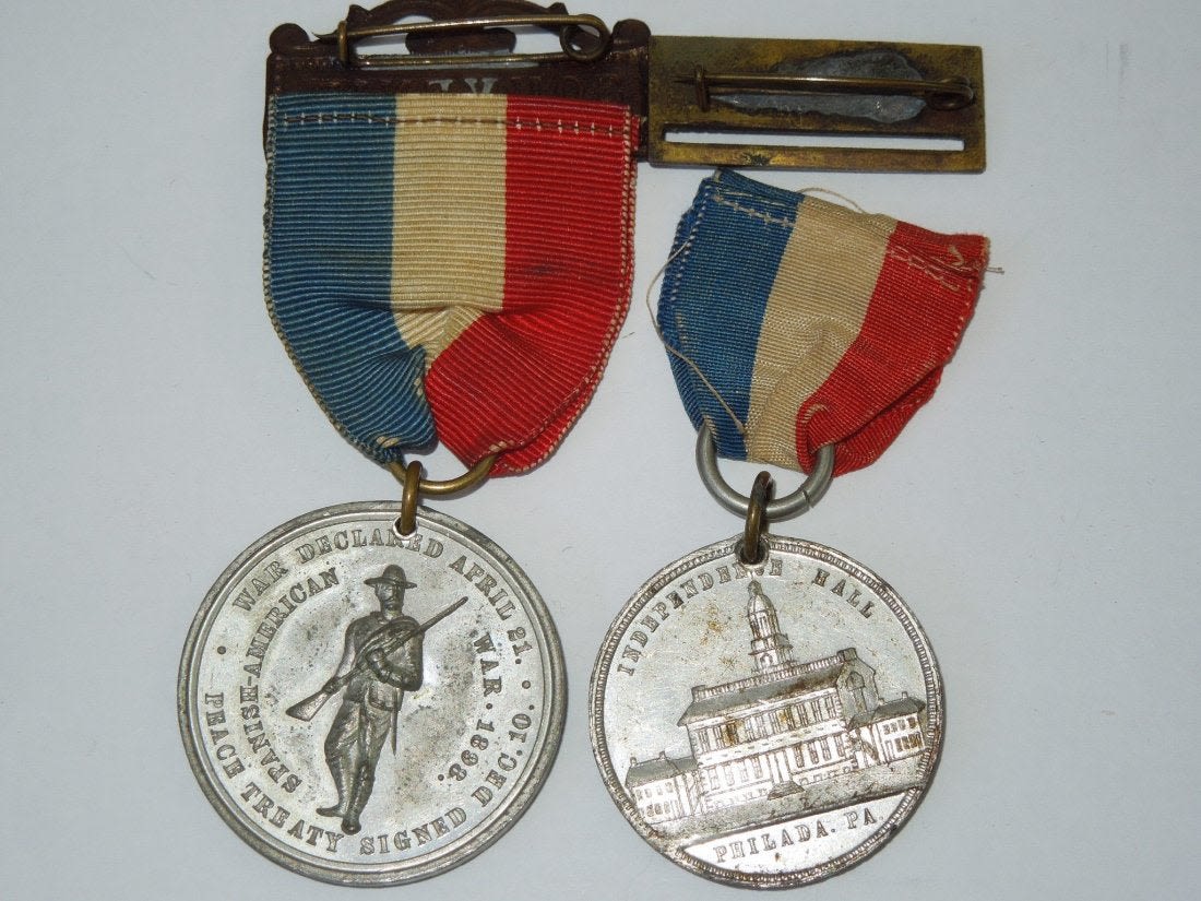 Spanish American War SAW Souvenir Peace Jubilee & Army 5th Mass Volunteers Infantry Medals. You will receive 2 souvenir medals. The first medal is Peace Jubilee, Philadelphia, PA., Oct. 26-27 1898. On the reverse is Independence Hall, Philada. PA. Attached is a red, white and blue ribbon with a detached from the ribbon souvenir pin. The other medal reads on the ribbon 5th Mass. Vol. Inf., Mustered in U.S. Service at SO. Farmingham, Mass., July 7, 1898, Camp Wetherill (plus unreadable lines on the ribbon). The medal itself reads, 2nd Army Corps, Major Gen, Young Commanding with a raised 4 leaf clover. On the reverse it reads Spanish American War 1898, Peace Treaty Signed Dec. 10, War Declared April 21. Good conditions for their age and the pin is detached from the ribbon.