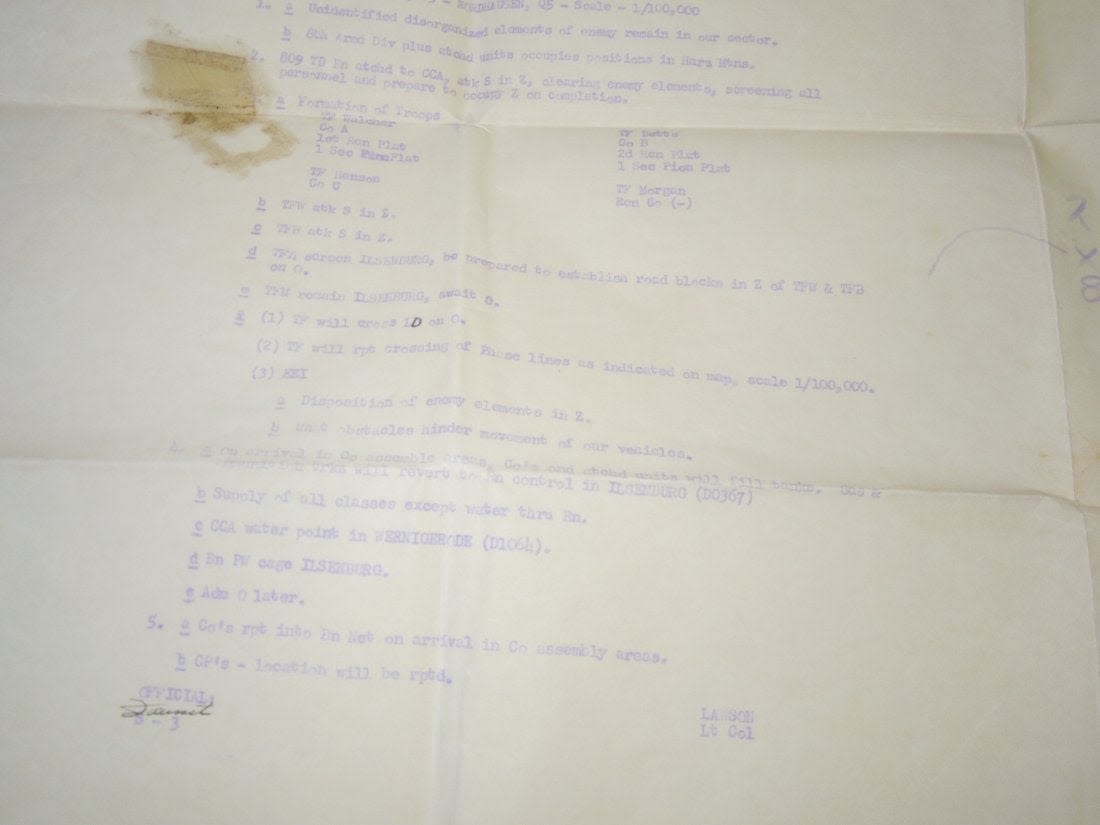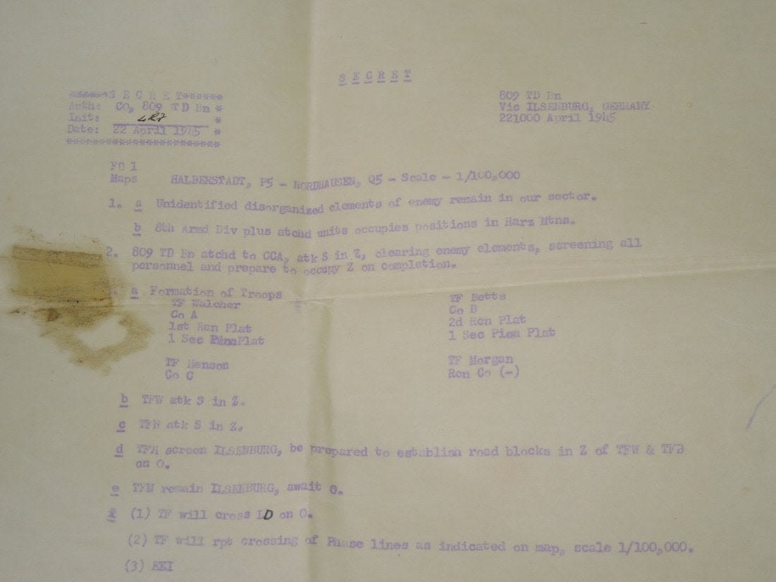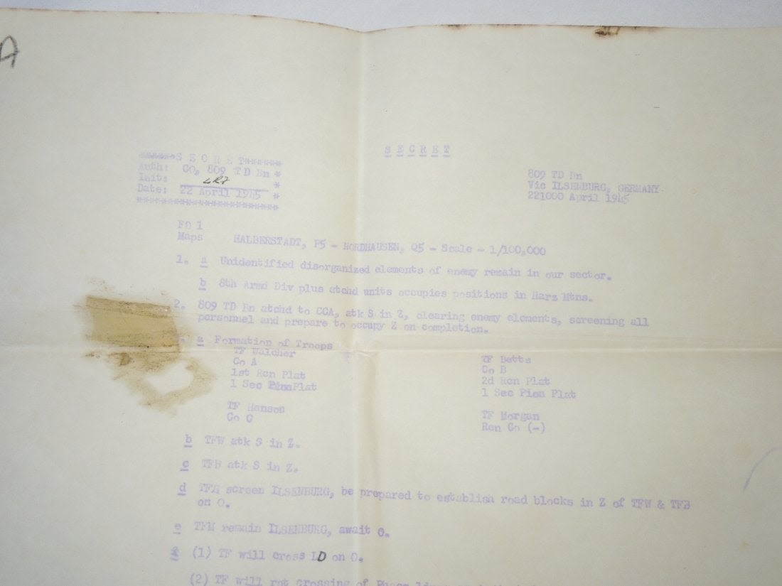 WWII 809th Tank Destroyer Battalion Orders Map. Official initialed and signed secret map. Vic ILSENBURG, GERMANY. 22 April 1945 dated map. Approximate size is 18 x 61 inches.