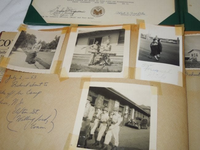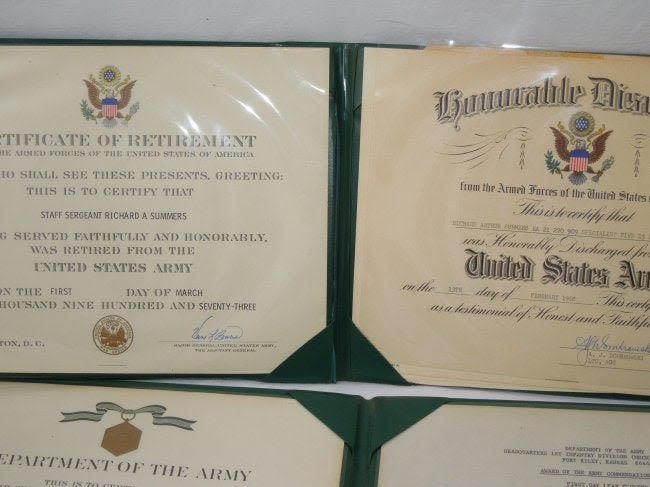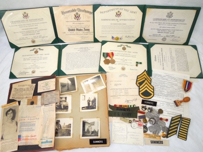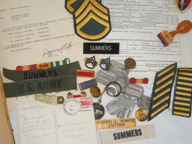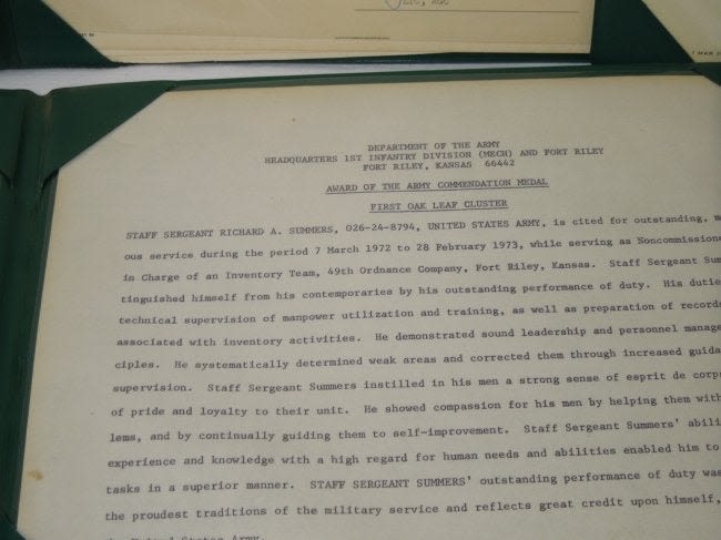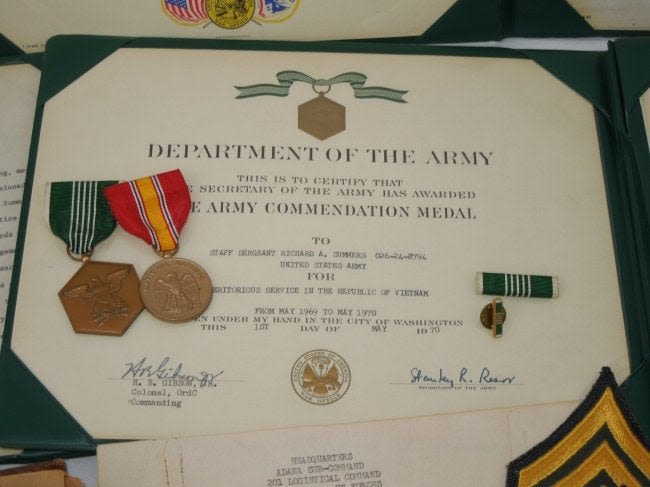 Army Sgt Summers Scrapbook Awards Citations Dog Tags Medals Etc Group. Korea and Vietnam Era US Army Sergeant Richard A. Summers Scrapbook, Awards, Citations, Dog Tags, Medals, Ribbon Bars Etc Group. You will receive the following items. Army Scrapbook: France and Germany 9th CML CO., 7th Army (cover detached) that dates from 1953-1958. In the scrapbook there is approximately 160 plus photos, 15 plus post cards, paper, cards, Name tags, medals and Ribbons (National Defense Service Medal and Ribbon Bar, Army Commendation Medal, Ribbon Bar and Medal Lapel Pin, Good Conduct Ribbon Bar, Vietnam Service Ribbon Bar wit 4 battle Stars, Republic of Vietnam Campaign Ribbon Bar, Presidential Unit Citation Ribbon Bar, Army Meritorious Unit Citation), Awards to include: Army Commendation Medal & Citation Certificates, Retirement and Honorable Discharge Awards, Certificate of Appreciation, (7) dog tags, sleeve insignia, ordnance collar insignia, Vietnam Class A patch, stamp, lucky rabbits foot, Saint Christophers medal, plus more. The following is information from Summers DD214: 6 overseas Bars, Army Commendation Medal with Oak Leaf Cluster, Meritorious Unit Citation, Vietnam Service Medal with 11 Bronze Service Stars, Good Conduct Medal with Bronze Clasp 2 Loops. Retired after 20 years.