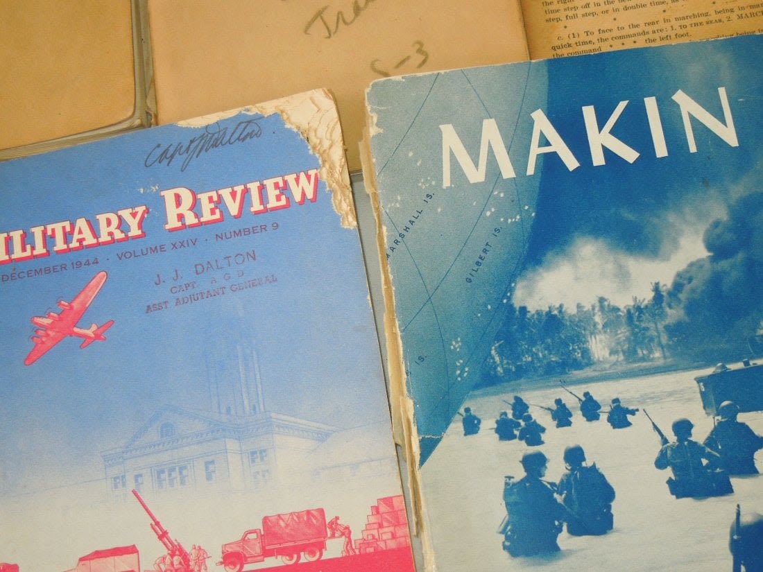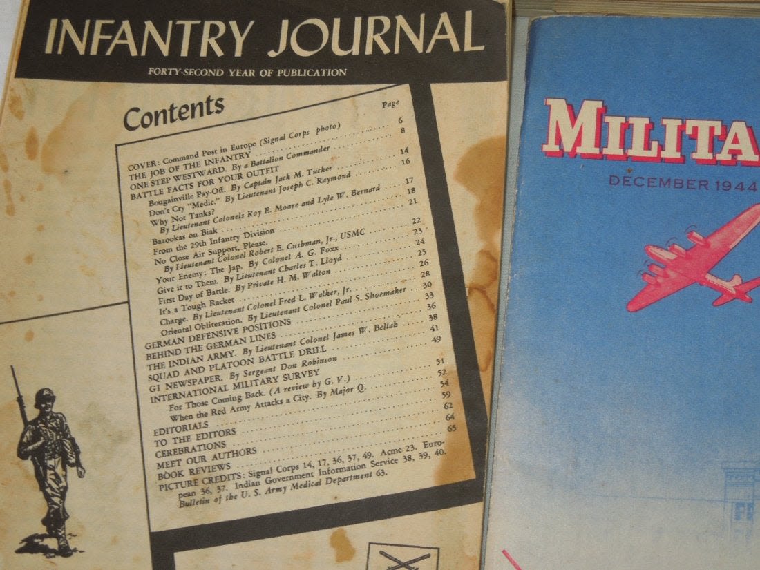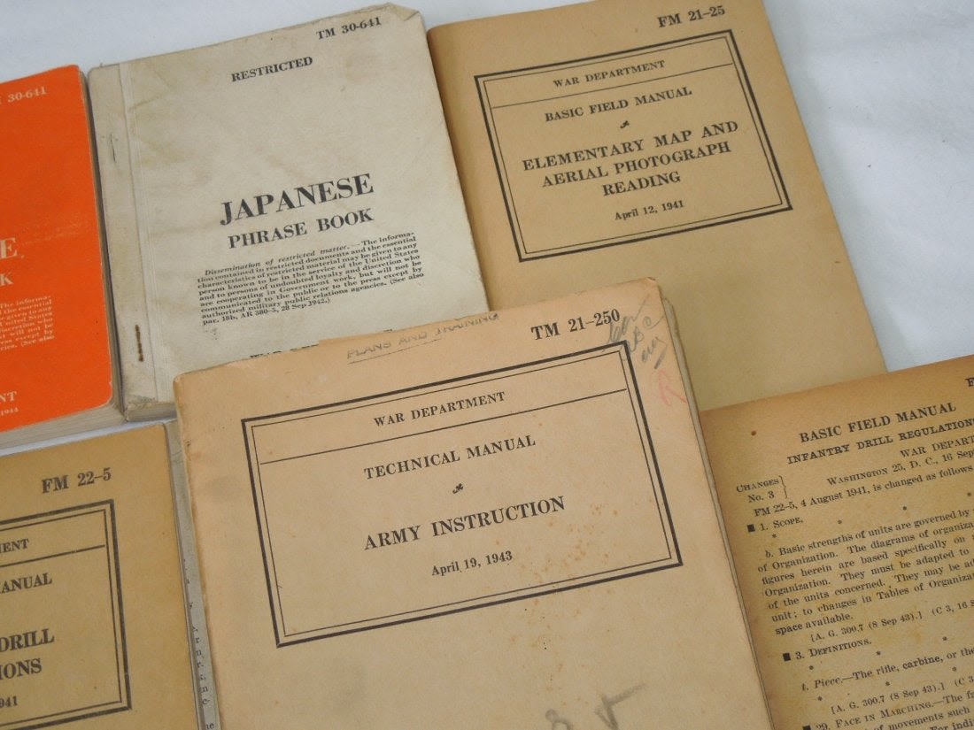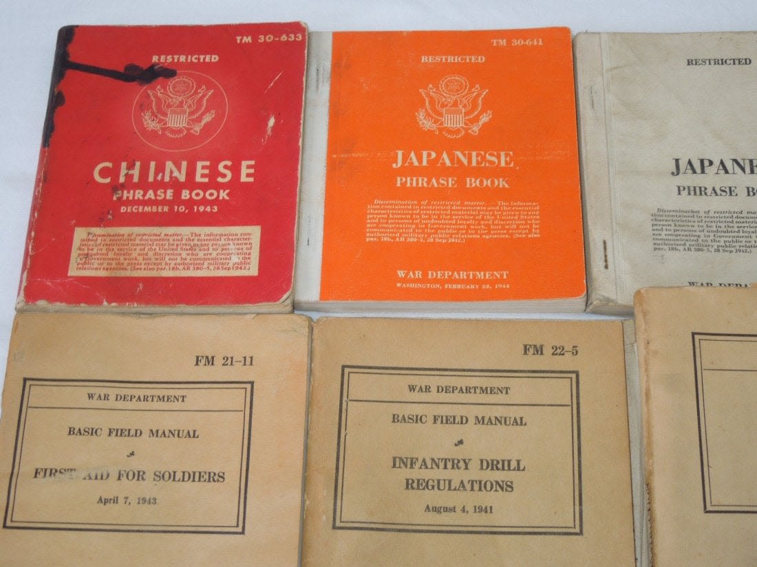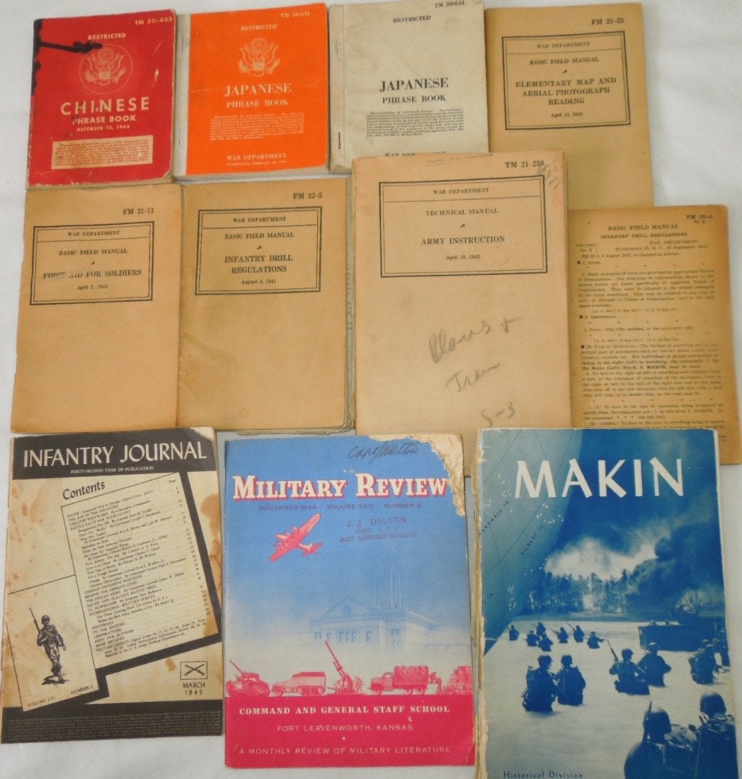 Lot of various WWII made pocket guides and manuals to include: Makin as produced by the War Dept. (cover detached), Military Review of the Command and General Staff School from Dec. 1944, March 1945 Infantry Journal (corner eaten by mice), Infantry Drill Regulations (Missing cover), 1943 Army Instruction, 1941 Infantry Drill Regulations Manual (some pages detached but present), 1943 First Air For Soldiers, 1941 Elementary Map and Aerial Photograph Reading, (2) 1944 dated Japanese Phrase Books, and (1) Chinese Phrase Book (ink on cover).
