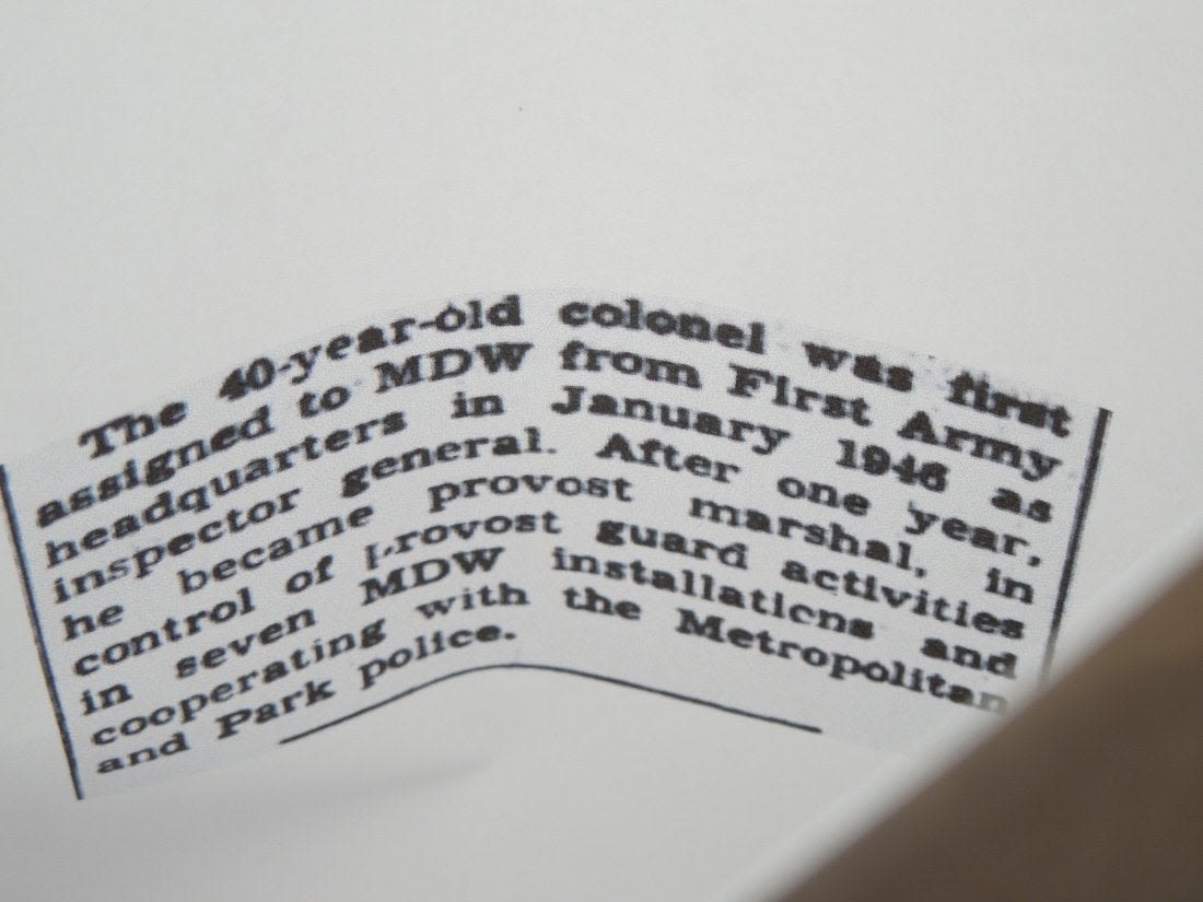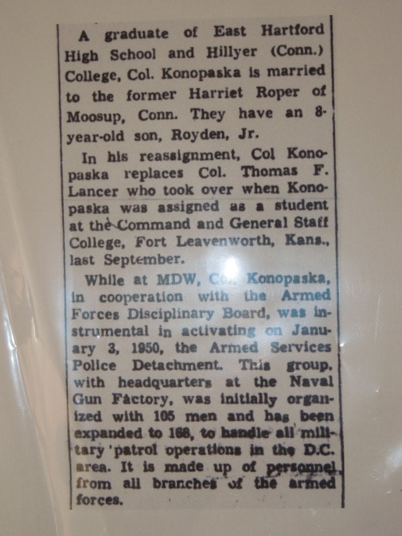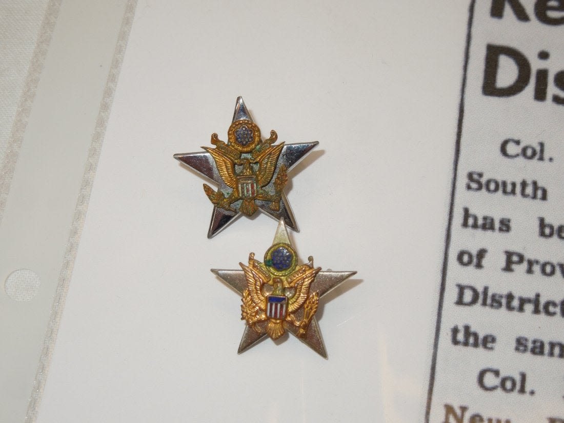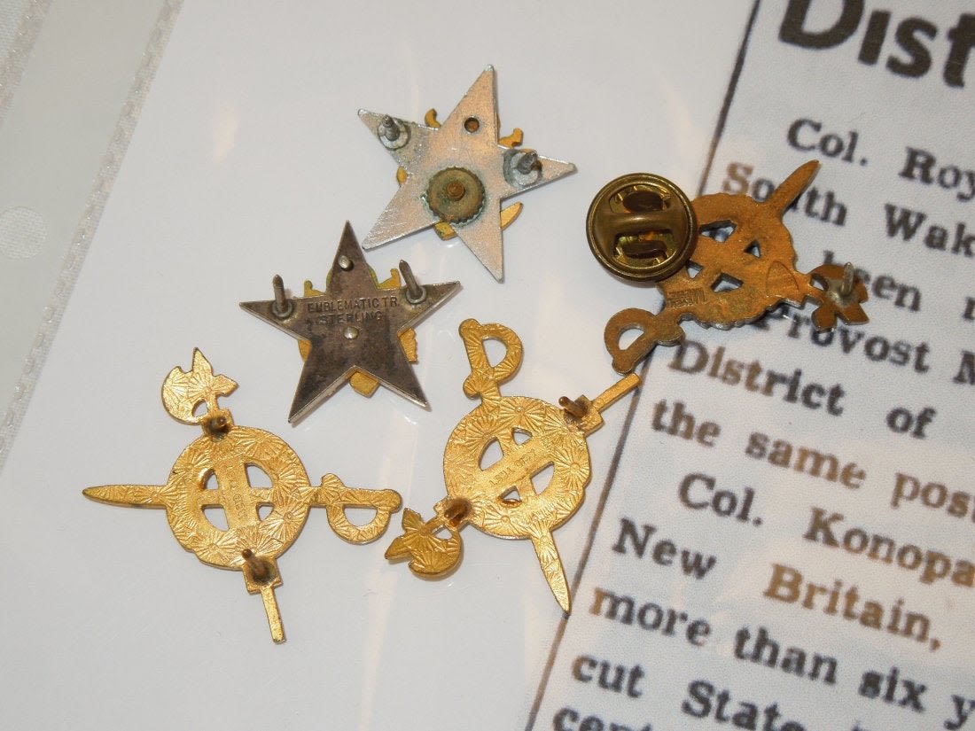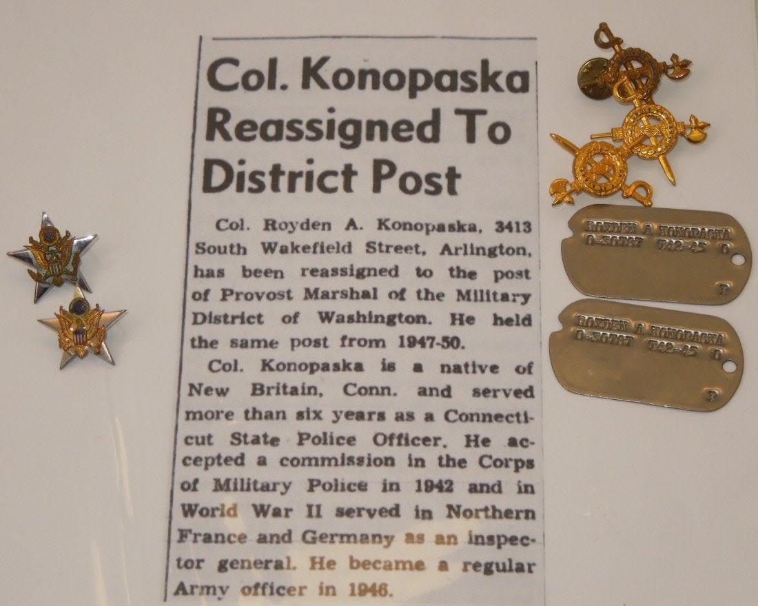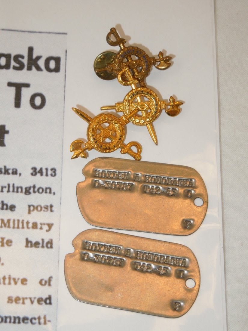 Lot of WWII dog tags, General Staff, and Inspector General branch insignia to a Colonel Royden A. Konopaska. Sterling marked GS insignia, snowflake back IG insignia, and copies of a newspaper article about the Colonel’s service history.