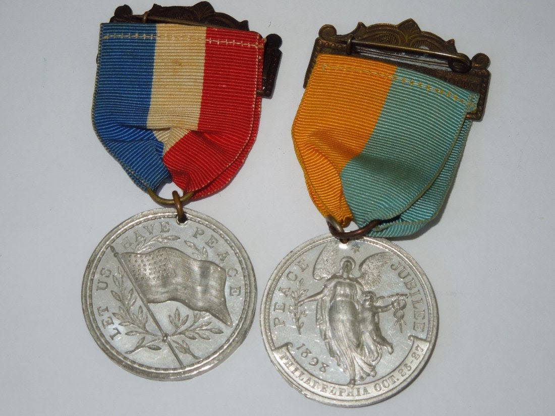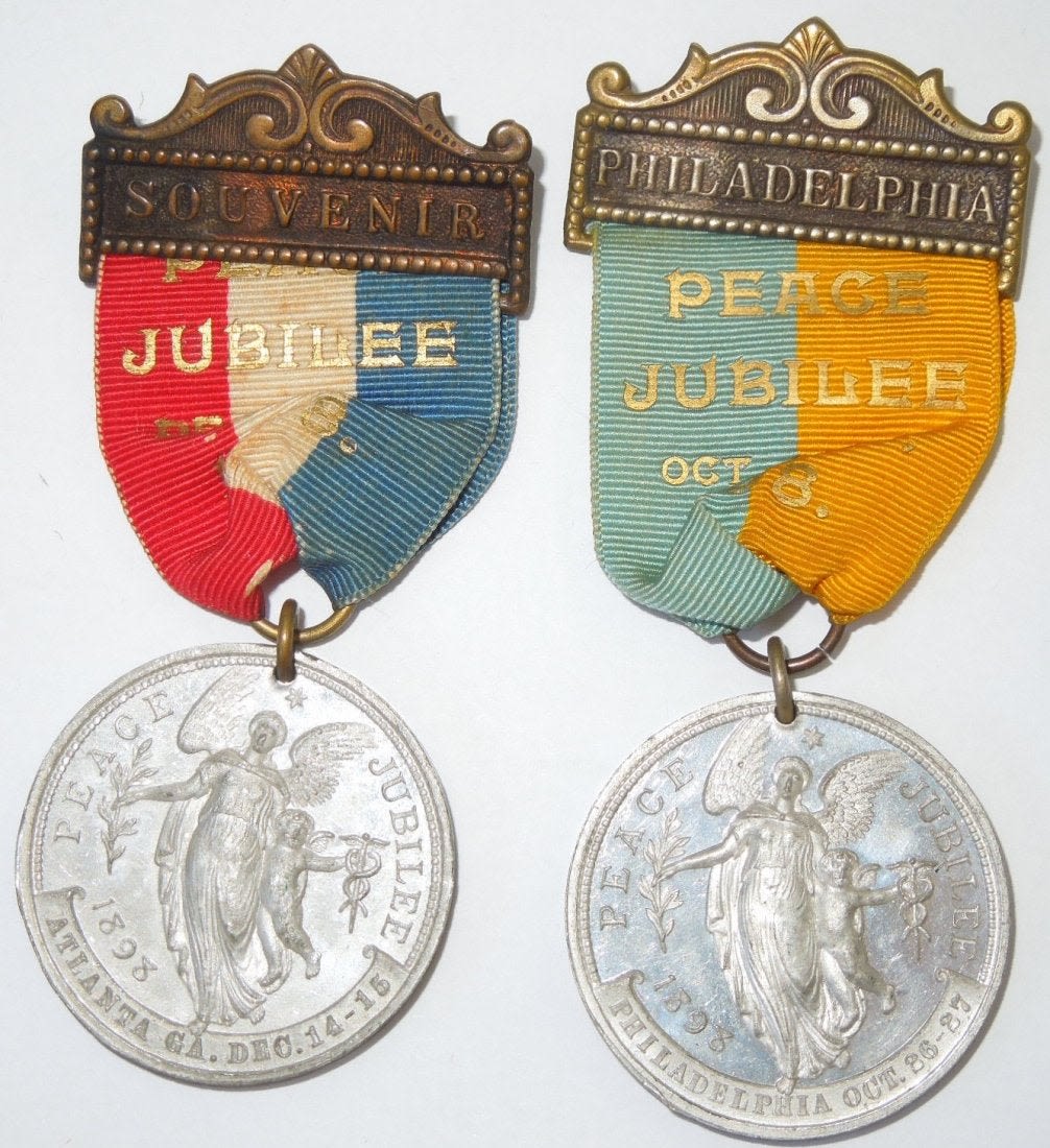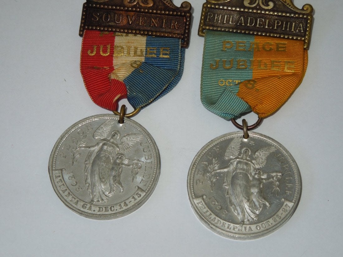 Spanish American War SAW 1898 National Peace Jubilee Atlanta Philadelphia Medals. You will receive 2 medals with ribbons. The first medal is a Souvenir Peace Jubilee Dec. 14-15, 1898 Medal. The medal itself reads, Atlanta GA. Dec 14-15 with the reverse Let US Have Peace. The second medal is a Philadelphia Peace Jubilee Oct. 26-27, 1898 medal. The medal itself reads, Peace Jubilee 1898 Philadelphia Oct. 26-27. The reverse reads, Let US Have Peace. Both medals are in nice condition especially for their ages.