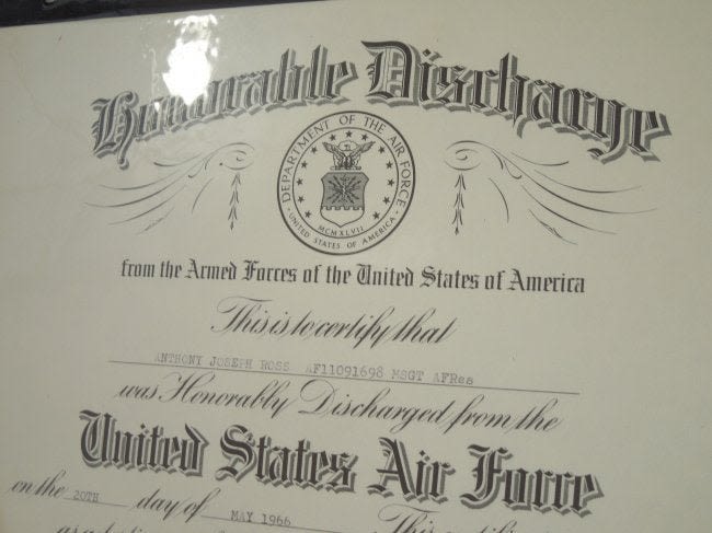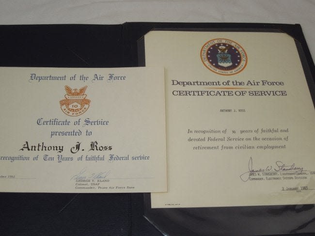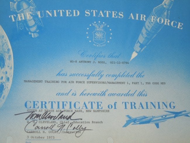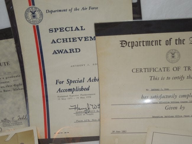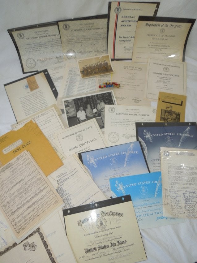 US Air Force Master Sergeant Anthony Ross Certificates, Photos, Paper and Ribbon Bar Group. Ross was attached to the 732nd Troop Carrier Squadron, 94th Troop Carrier Wing. You will receive the following items: ribbon bar, a bunch of certificates to include Maxwell Air Force Base, Gunter Air Force Base, Training Certificates, Honorable Discharge, President Harry Truman Certificate, Special Achievement Award from Pease Air Force Base, certificates of training from Pease Air Force Base, Award Certificates, Hanscom Air Force Base, Certificates of Service, and Master Of BS Award and letter describing Award. Paper group from the 732nd Troop Carrier Squadron and other paper, student handbook, and photos.