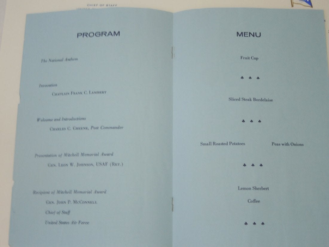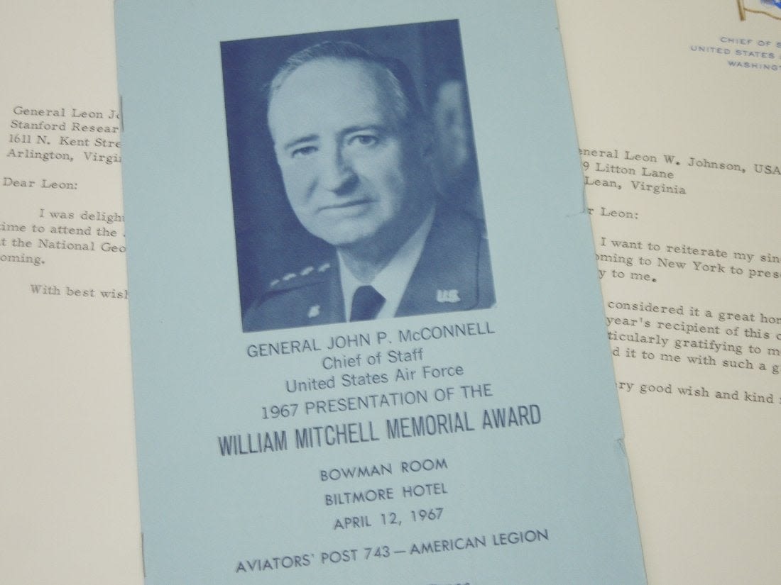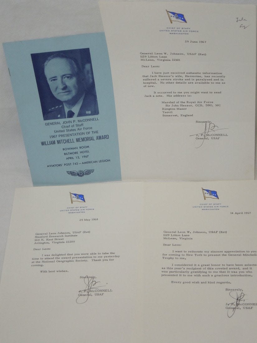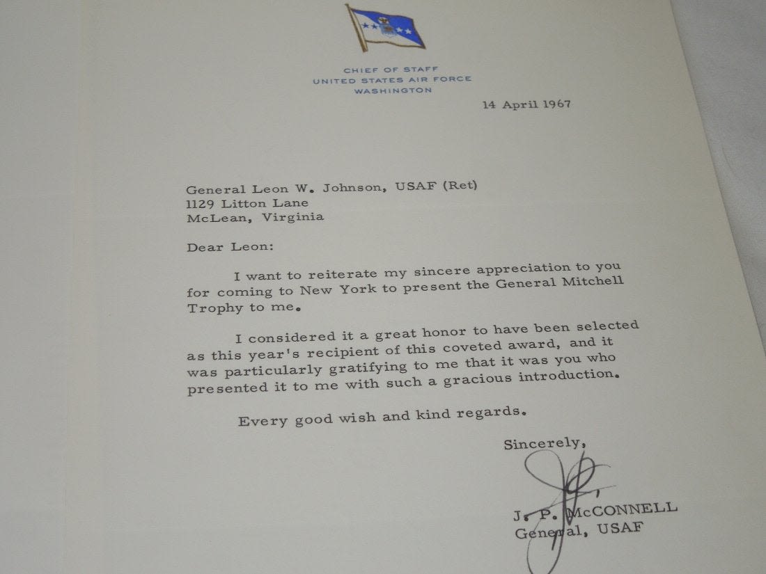 Lot from Medal of Honor recipient Gen. Leon Johnson from USAF Chief of Staff Gen. John McConnell. Johnson presented him with the Mitchell Trophy. Lot includes three typed original signed letters from McConnell to Johnson, and a program from the presentation.