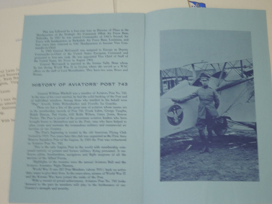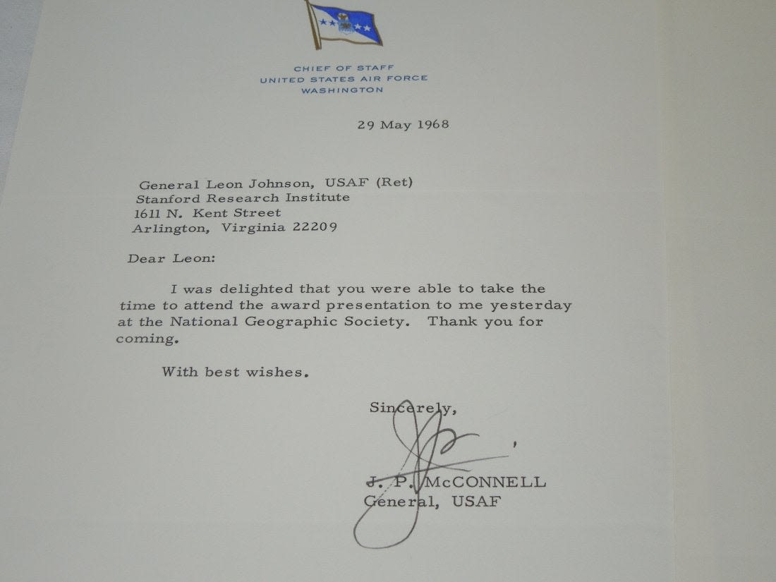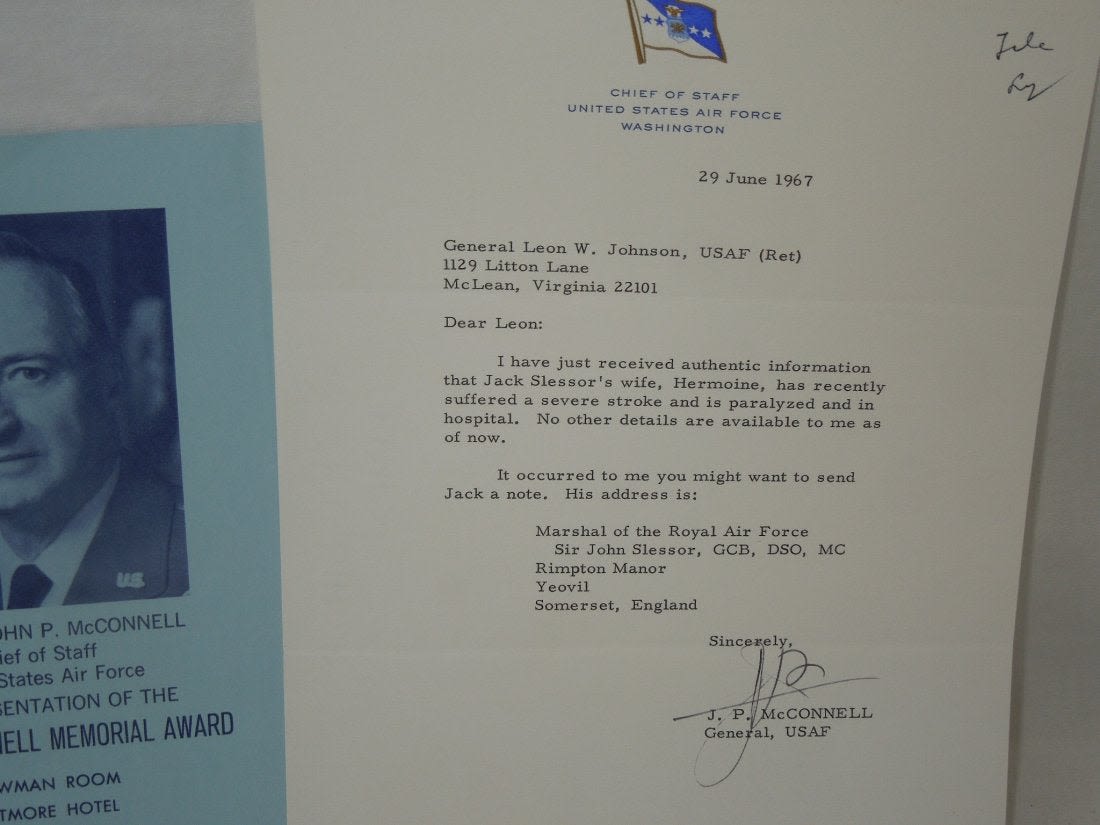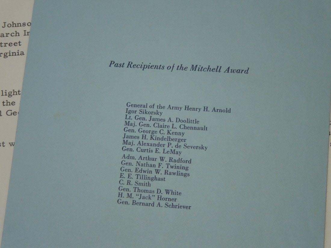 Lot from Medal of Honor recipient Gen. Leon Johnson from USAF Chief of Staff Gen. John McConnell. Johnson presented him with the Mitchell Trophy. Lot includes three typed original signed letters from McConnell to Johnson, and a program from the presentation.
