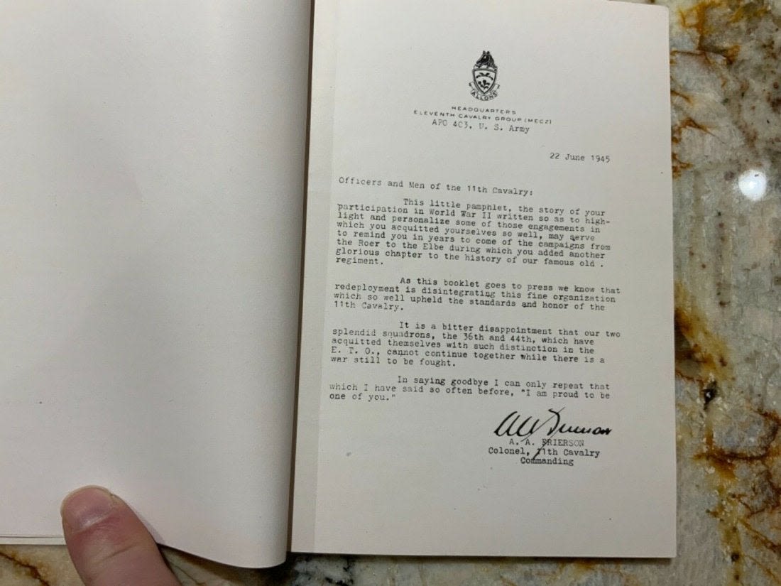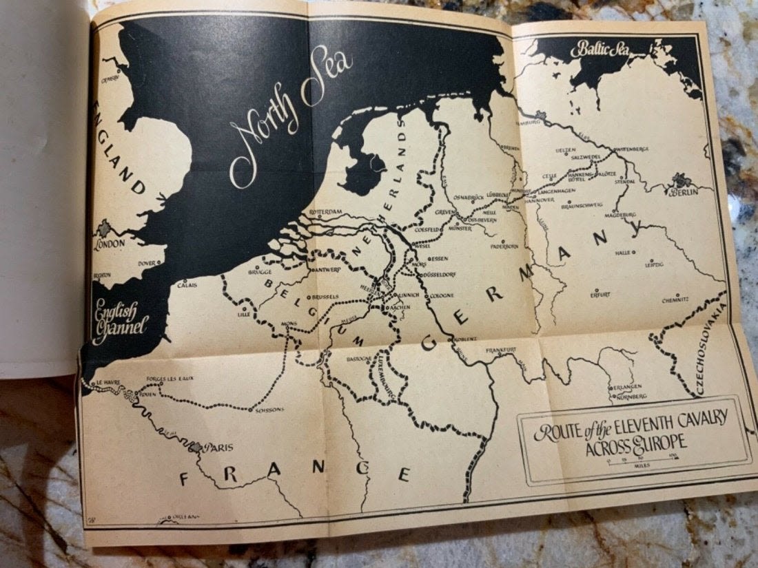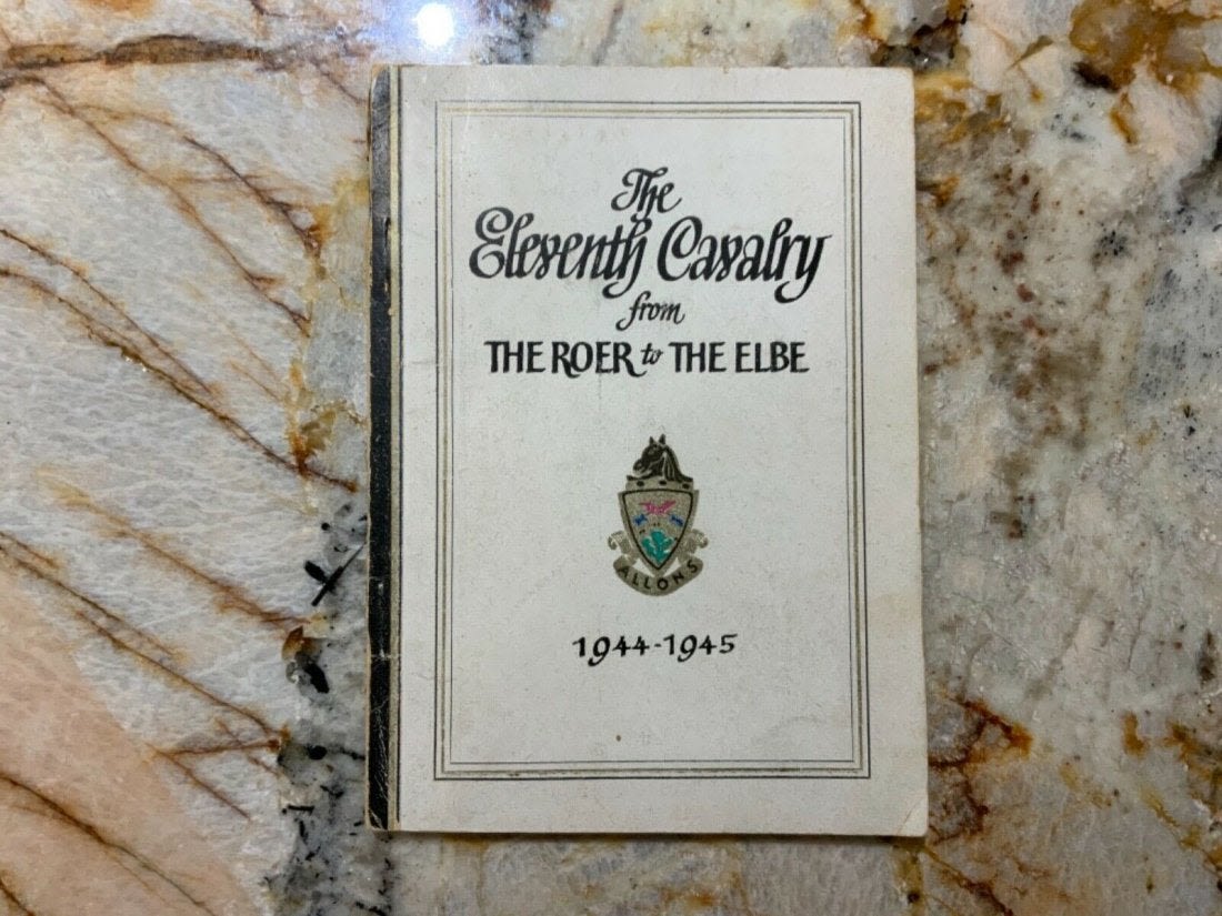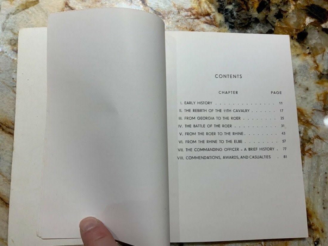 Eleventh 11th Cavalry from The Roer to the Elbe Unit History 1944-1945 Book. Named to T/5 Yetman. Inside the book is a 1945 commendation letter from the Commanding Officer of the 36th Calvary Reconnaissance Squadron with Yetman’s name on the top. This book also comes with the fold out map of the route of the Eleventh Cavalry Across Europe. Copyright: 1945 Pages: 95. Look over the Contents picture for the exact information contained in this book.