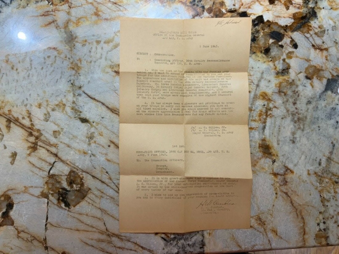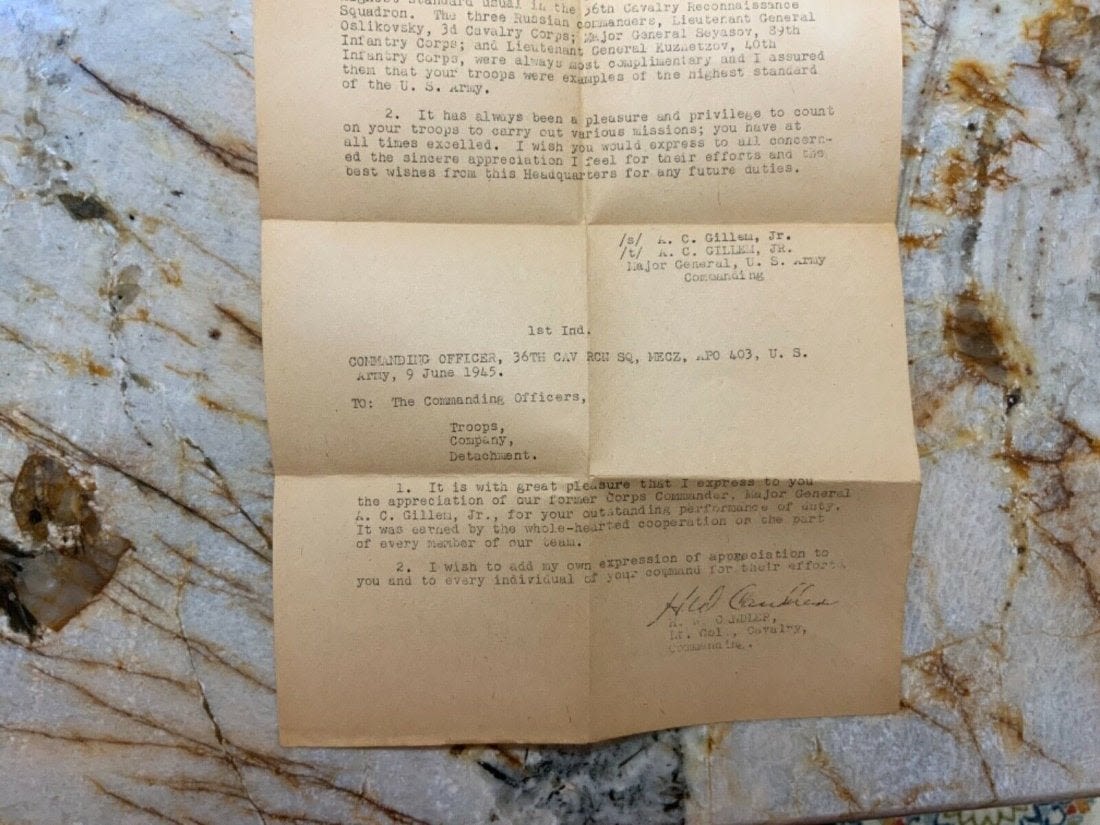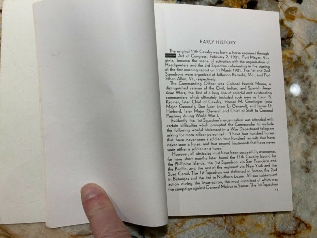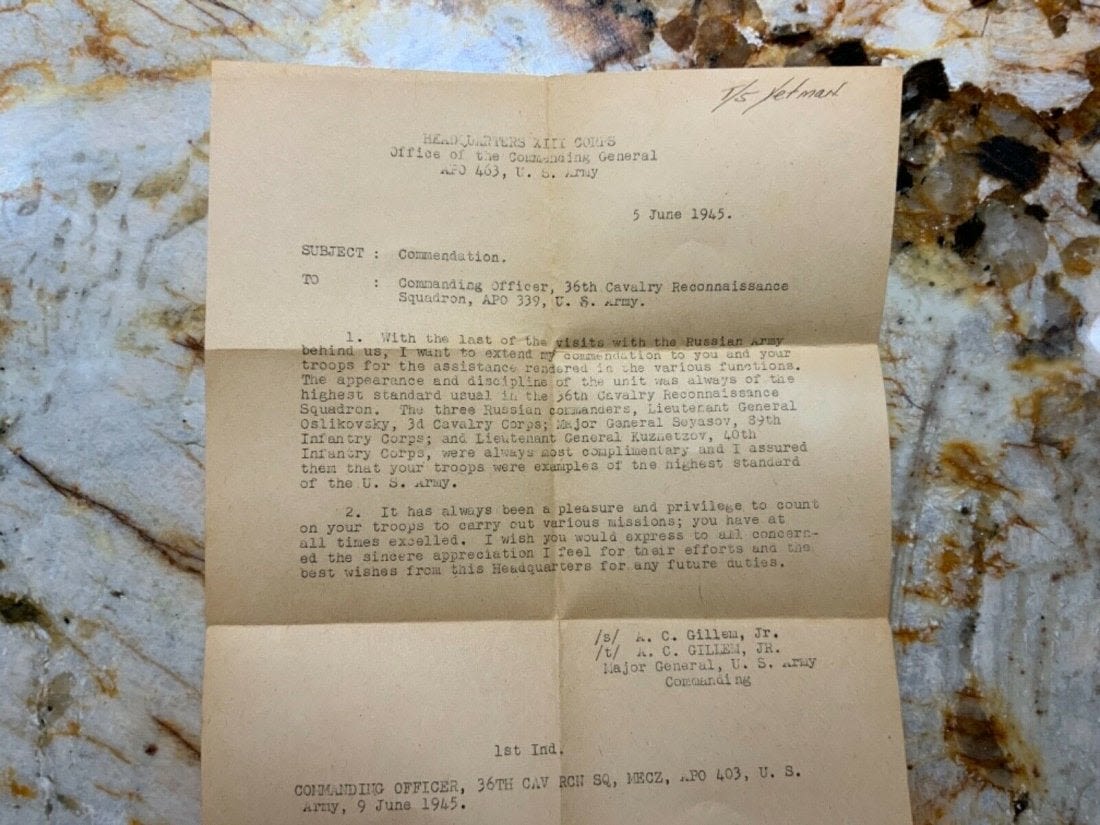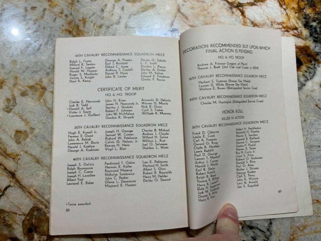Eleventh 11th Cavalry from The Roer to the Elbe Unit History 1944-1945 Book. Named to T/5 Yetman. Inside the book is a 1945 commendation letter from the Commanding Officer of the 36th Calvary Reconnaissance Squadron with Yetman’s name on the top. This book also comes with the fold out map of the route of the Eleventh Cavalry Across Europe. Copyright: 1945 Pages: 95. Look over the Contents picture for the exact information contained in this book.