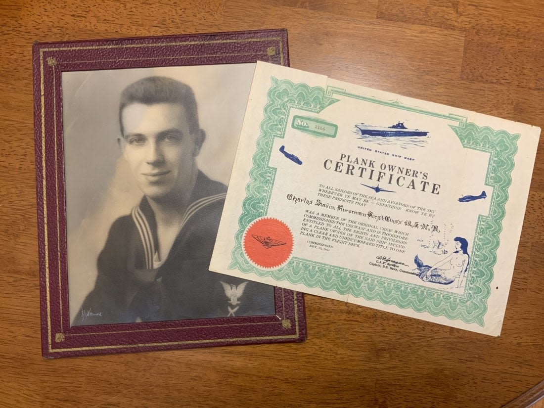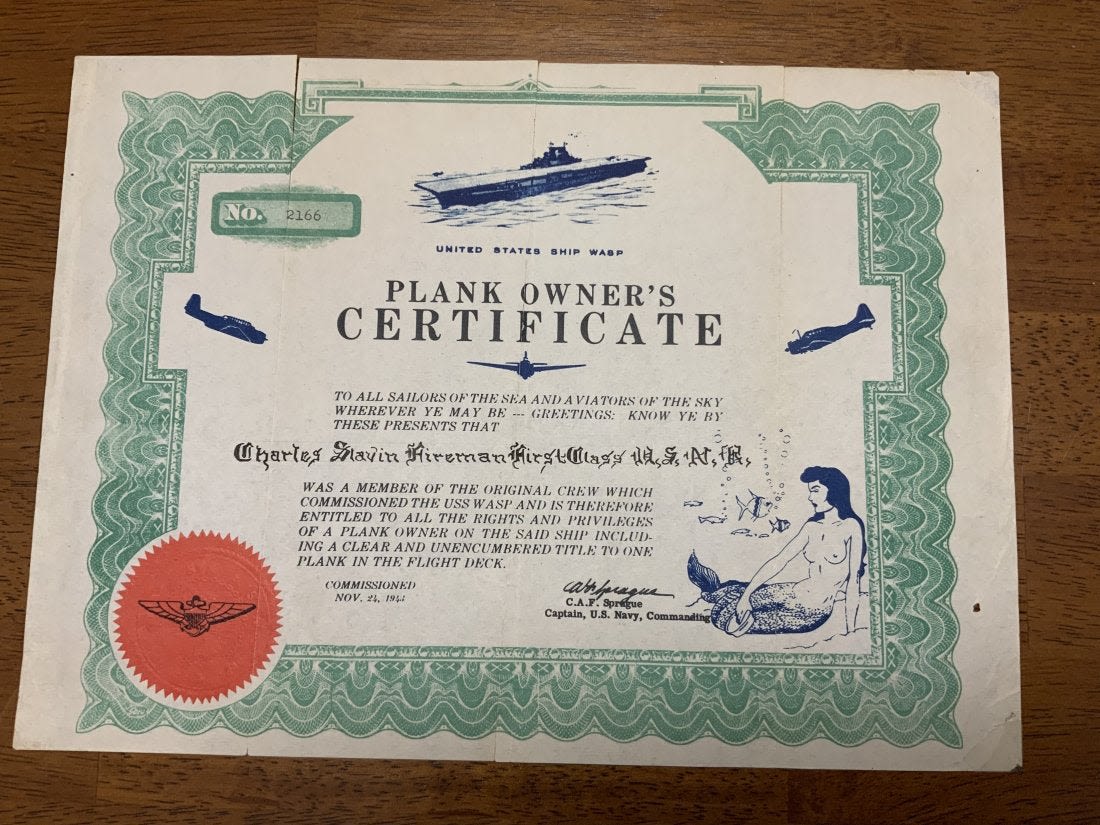 USN Navy USS WASP Plank Owners Certificate & Photo. United States Ship WASP Plank Owners Certificate. Named to Charles Glavin Hireman (?) First Class USNR. These certificates were only awarded to sailors who were the first to be part of the ship upon commissioning. The certificate has creases and tears where the creases are located. A photo was found behind the certificate. It shows the recipient of the certificate a Yeoman First Class. The photo is in very good condition. The size of the photo is 8 x 10 inches. The certificate is 8 x 11 inches.